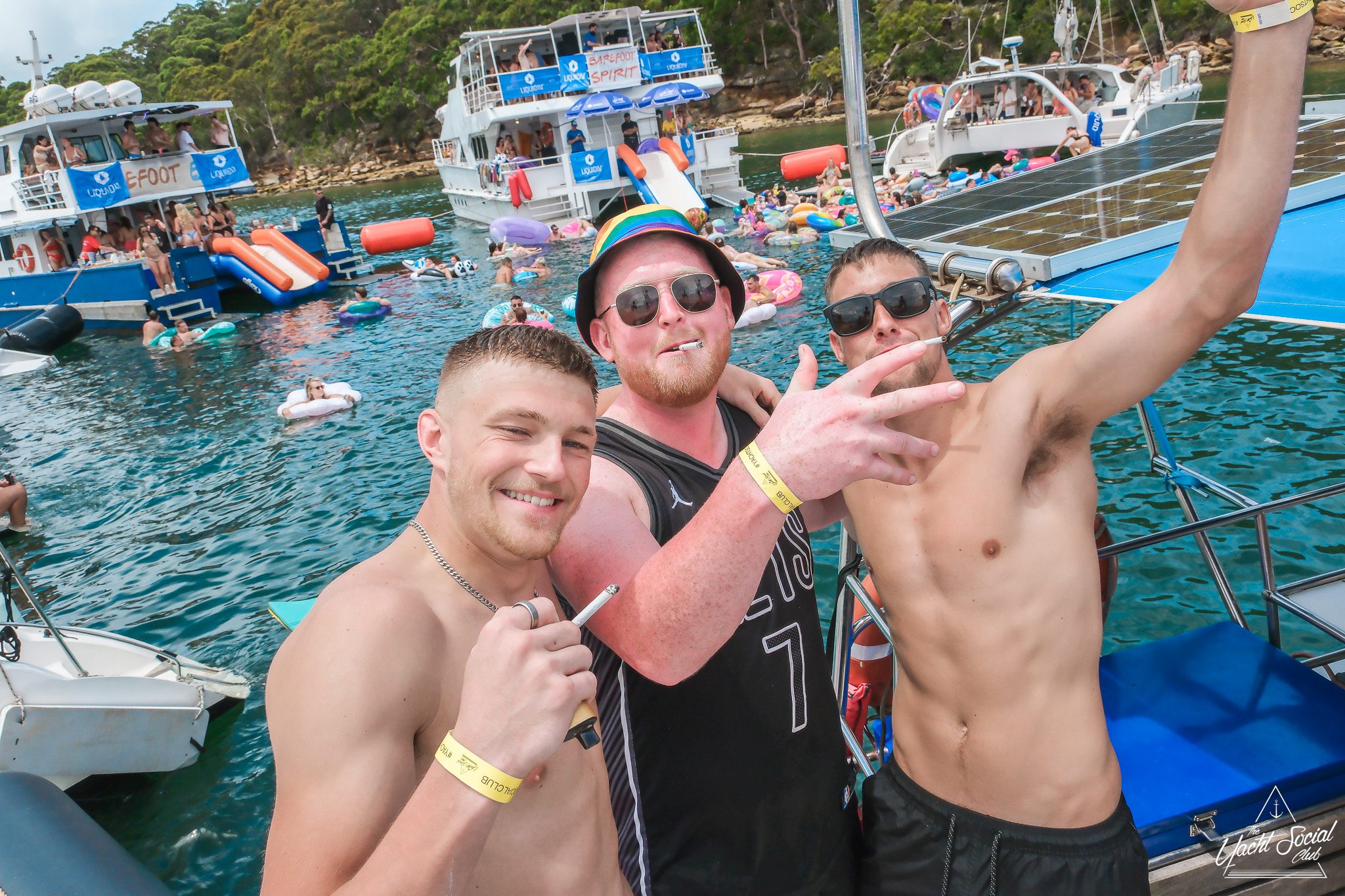 Three men on a boat pose for a photo, smiling and making hand gestures. They are surrounded by water activities and other boats with people enjoying the sunny day. Inflatable toys and swimmers can be seen in the background.