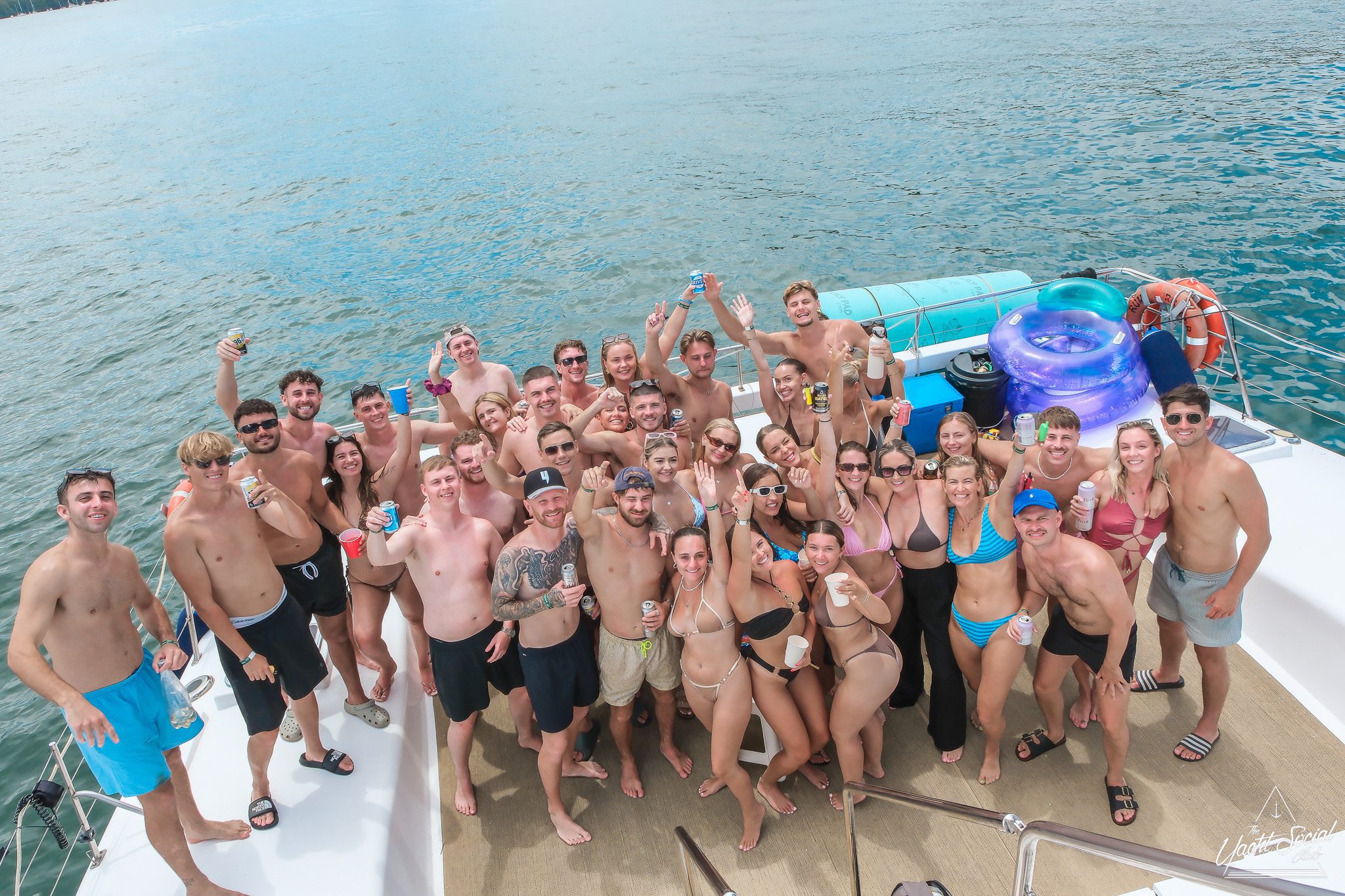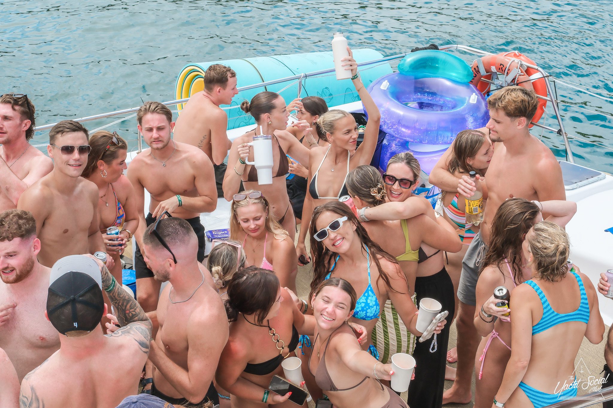 A large group of people socializing on a boat, wearing swimsuits and holding drinks. Some are dancing, hugging, and posing for photos. The atmosphere is festive and relaxed, set against a backdrop of water.