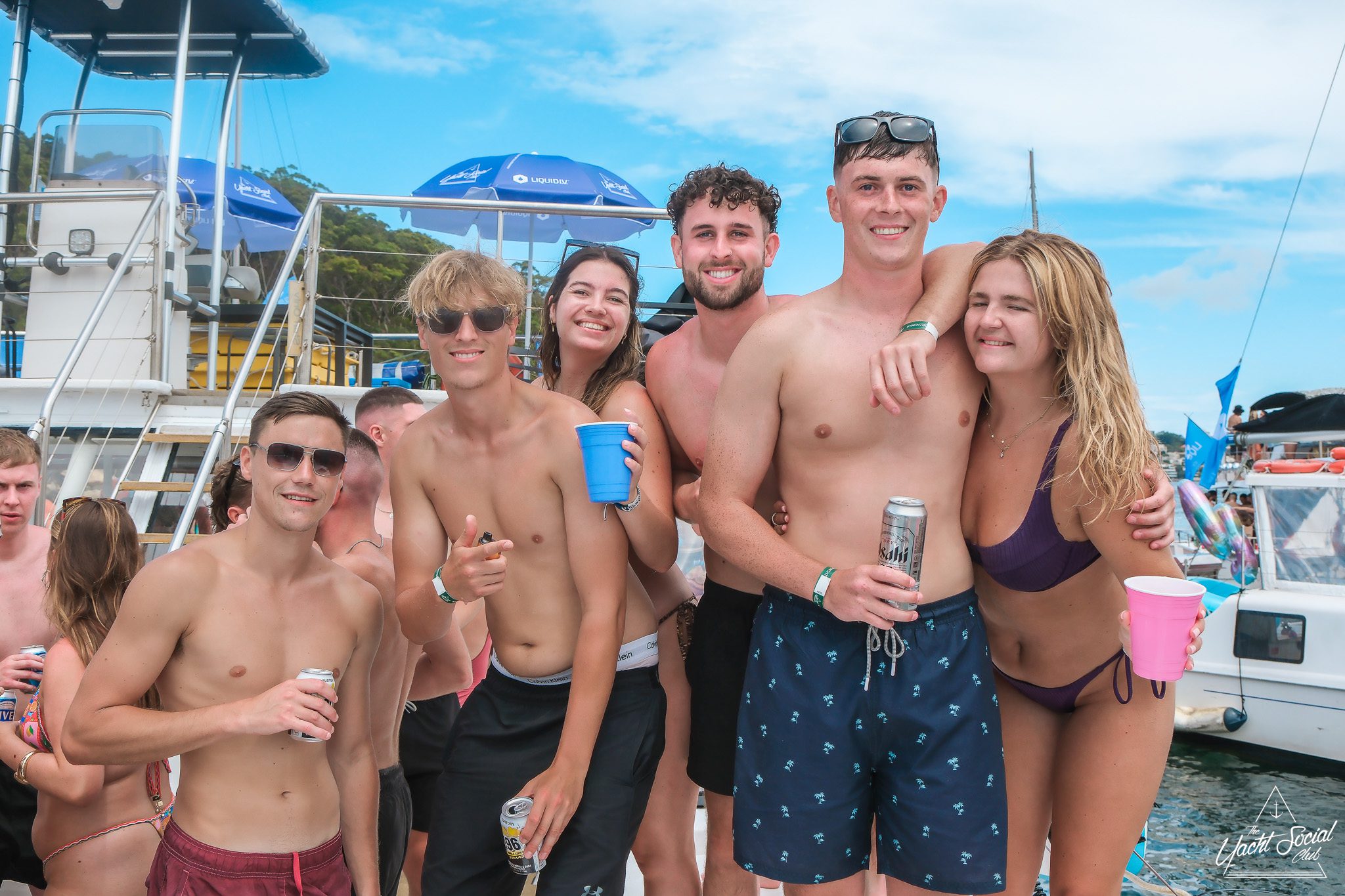 A group of six young adults enjoying a sunny day on a boat, some holding drinks. They're smiling and wearing swimsuits, with a vibrant blue sky and a hint of trees in the background. Other people and boats are visible in the scene.