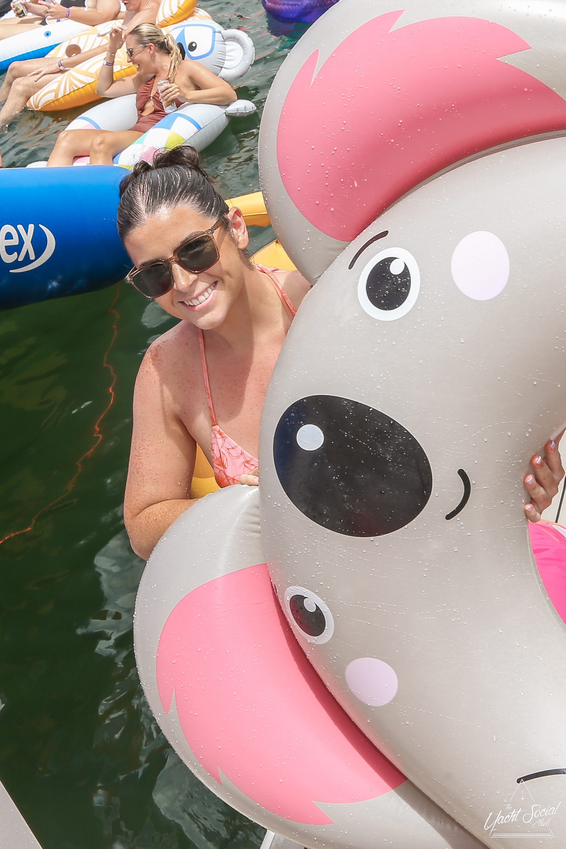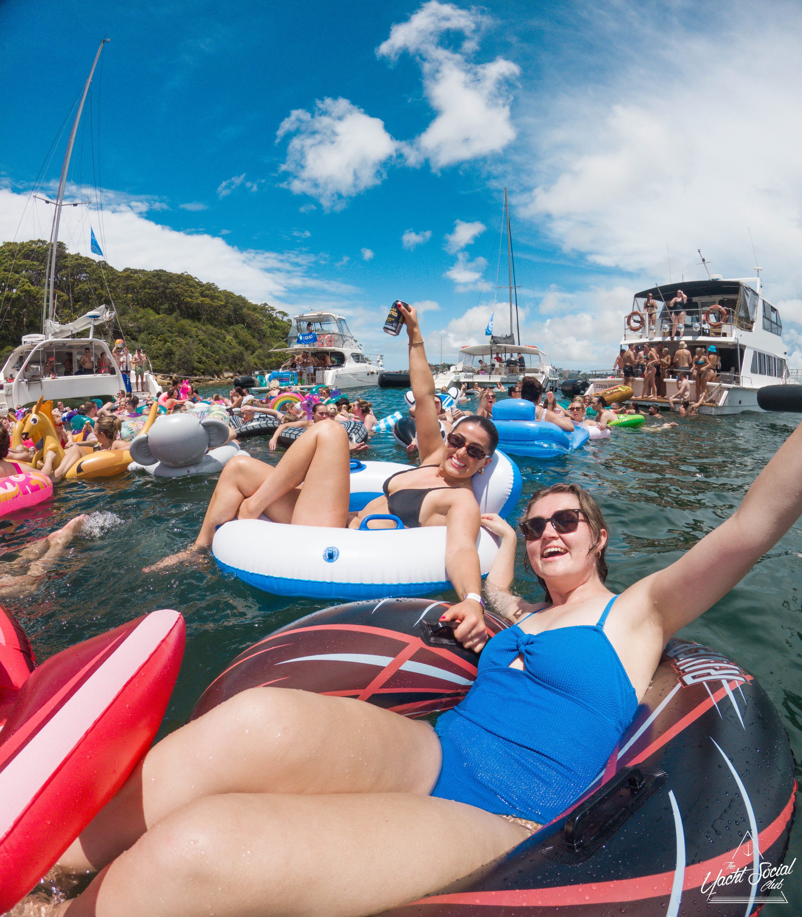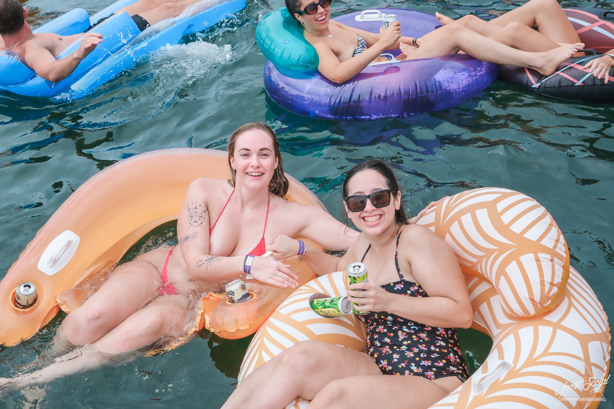 Two women in swimsuits smile and pose on a boat at a lively pool party. They are surrounded by other partygoers on inflatable floats in the water. The scene is set on a sunny day with blue skies and greenery in the background.