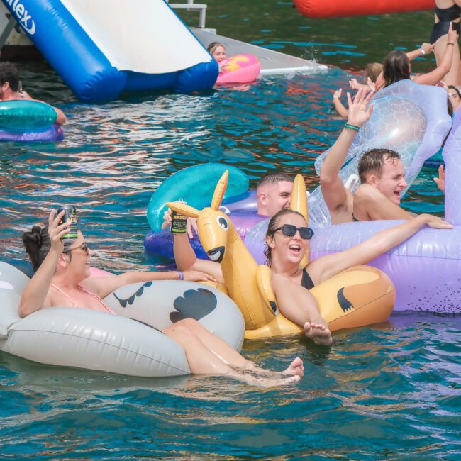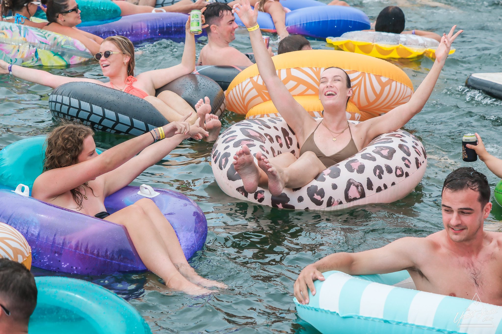 People enjoying a party on water, sitting on inflatable floats with drinks in hand. The scene includes a boat filled with more party-goers and lush greenery in the background.