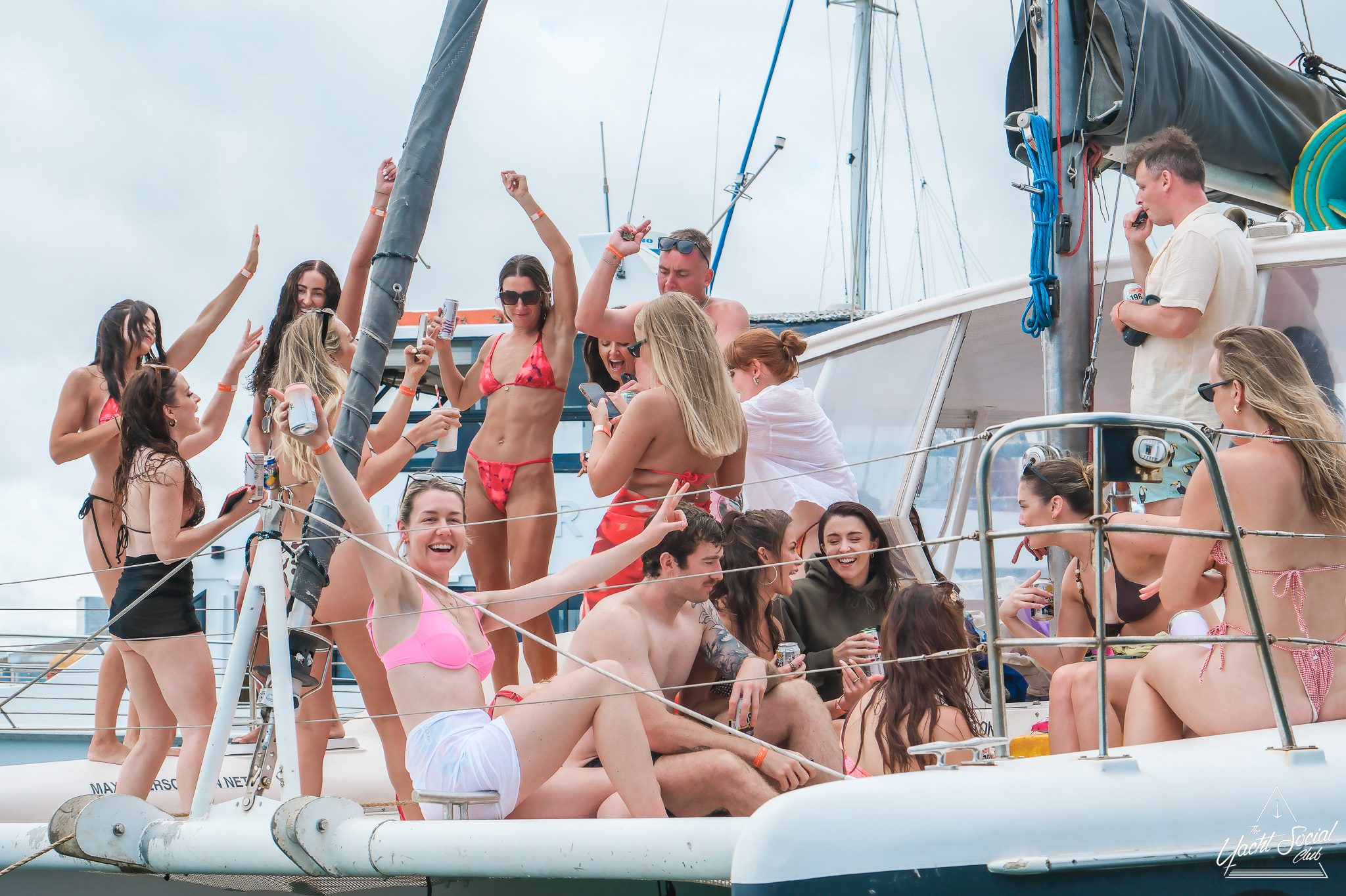 A group of people enjoying a party on a sailboat. They are smiling, dancing, and holding drinks, dressed in casual and swimwear under a cloudy sky. The sailboat is docked, with a partial view of the marina in the background.