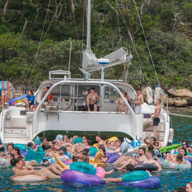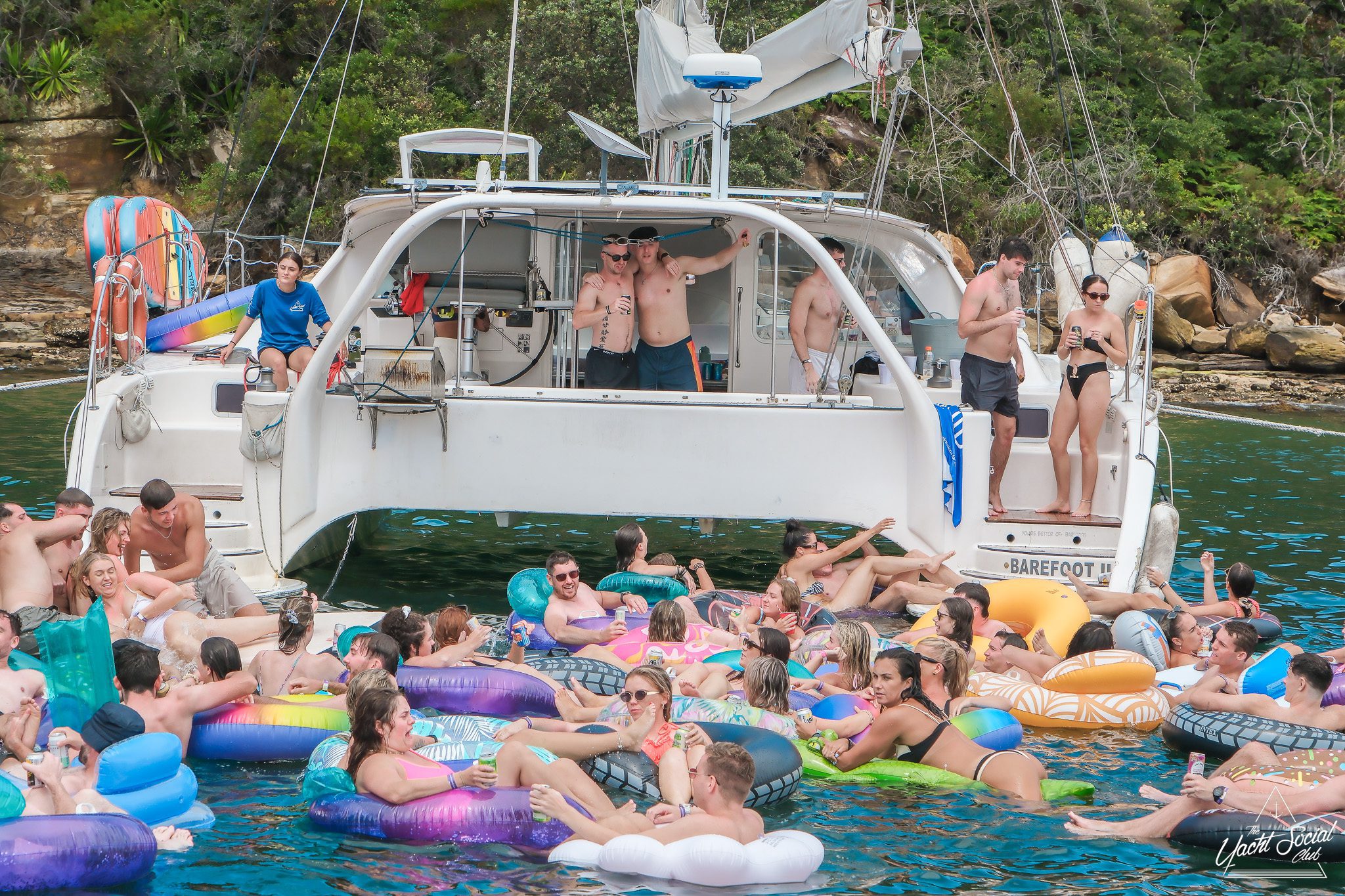 A large group of people enjoying a sunny day on the water with floaties near a catamaran labeled "Barefoot." Some are on the boat, while others relax in the water surrounded by greenery. Everyone seems to be having a good time.