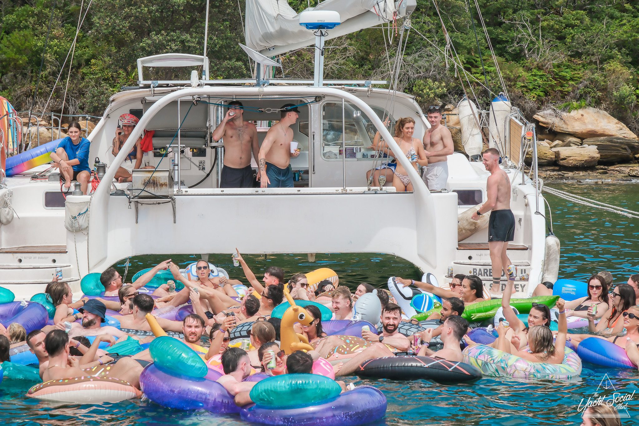 A group of people enjoying a party on a boat, some wearing swimsuits. They are laughing, dancing, and holding drinks, with a cloudy sky in the background. Inflatable pool toys and flags are visible on the boat.