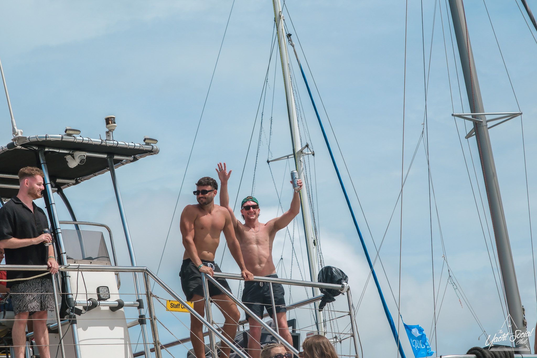 Two shirtless men stand on a boat deck, smiling and waving. One holds a drink while wearing sunglasses. The boat is surrounded by clear skies and has rigging visible. Other people are partially visible in the foreground.