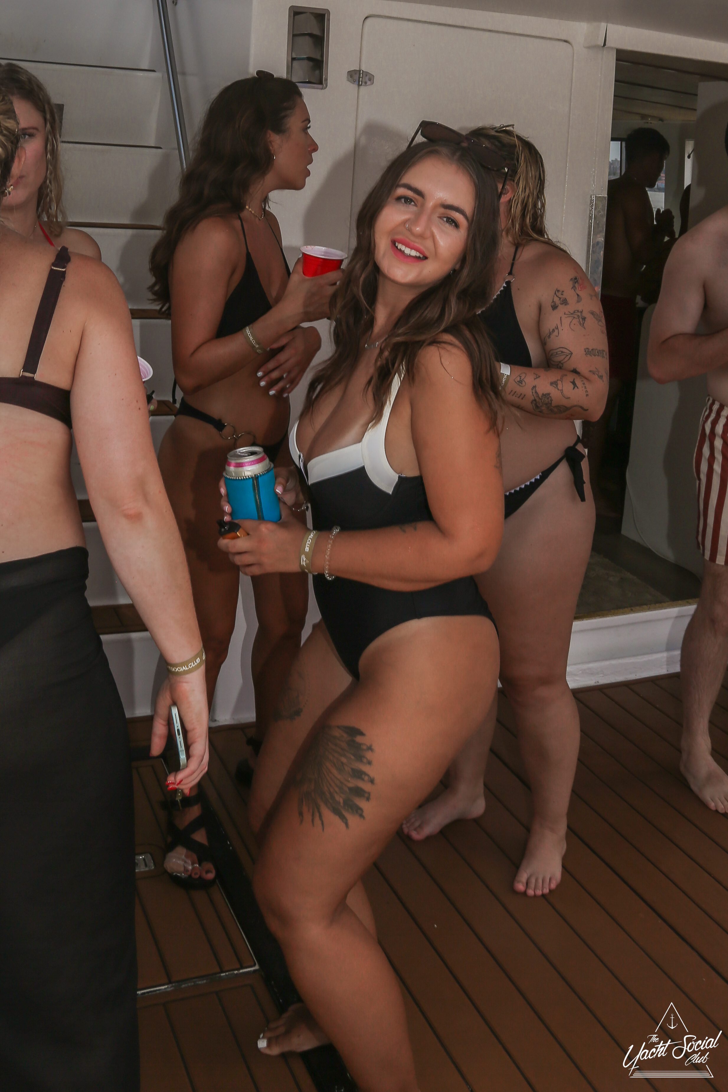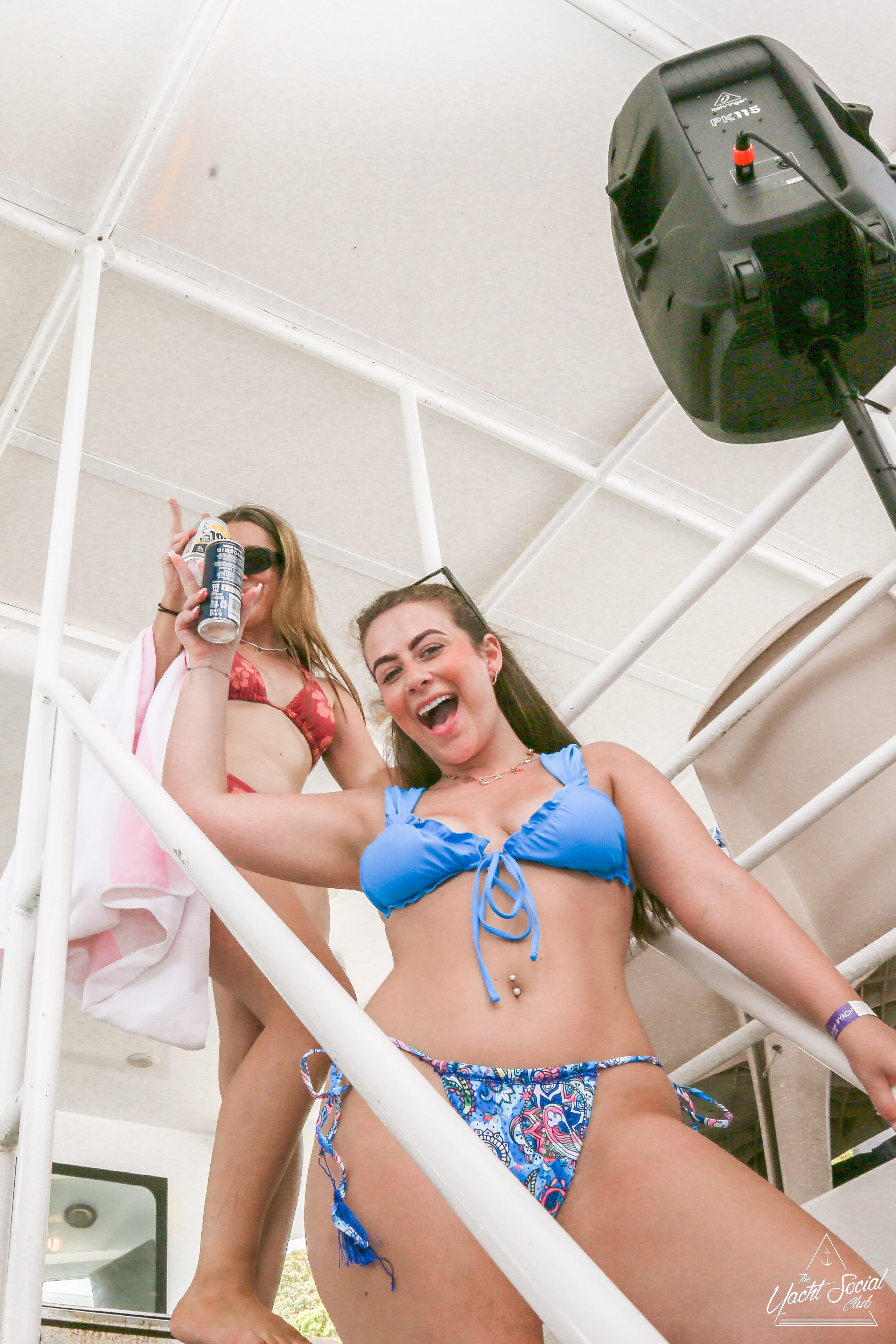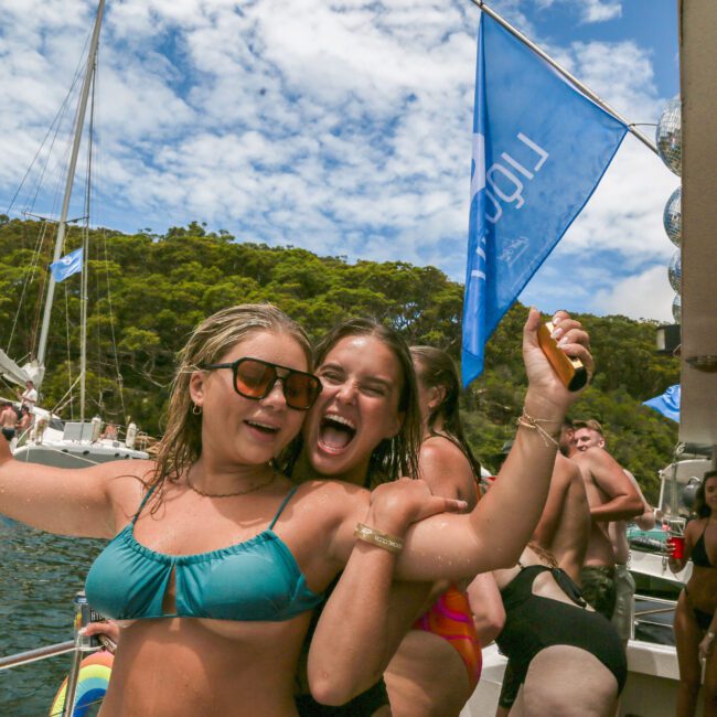 A group of people on a boat enjoying a party. A woman in a beige bikini and a woman in a neon swimsuit smile and hold drinks, looking up at the camera. Other people are socializing, with drinks and pool floats in the background.