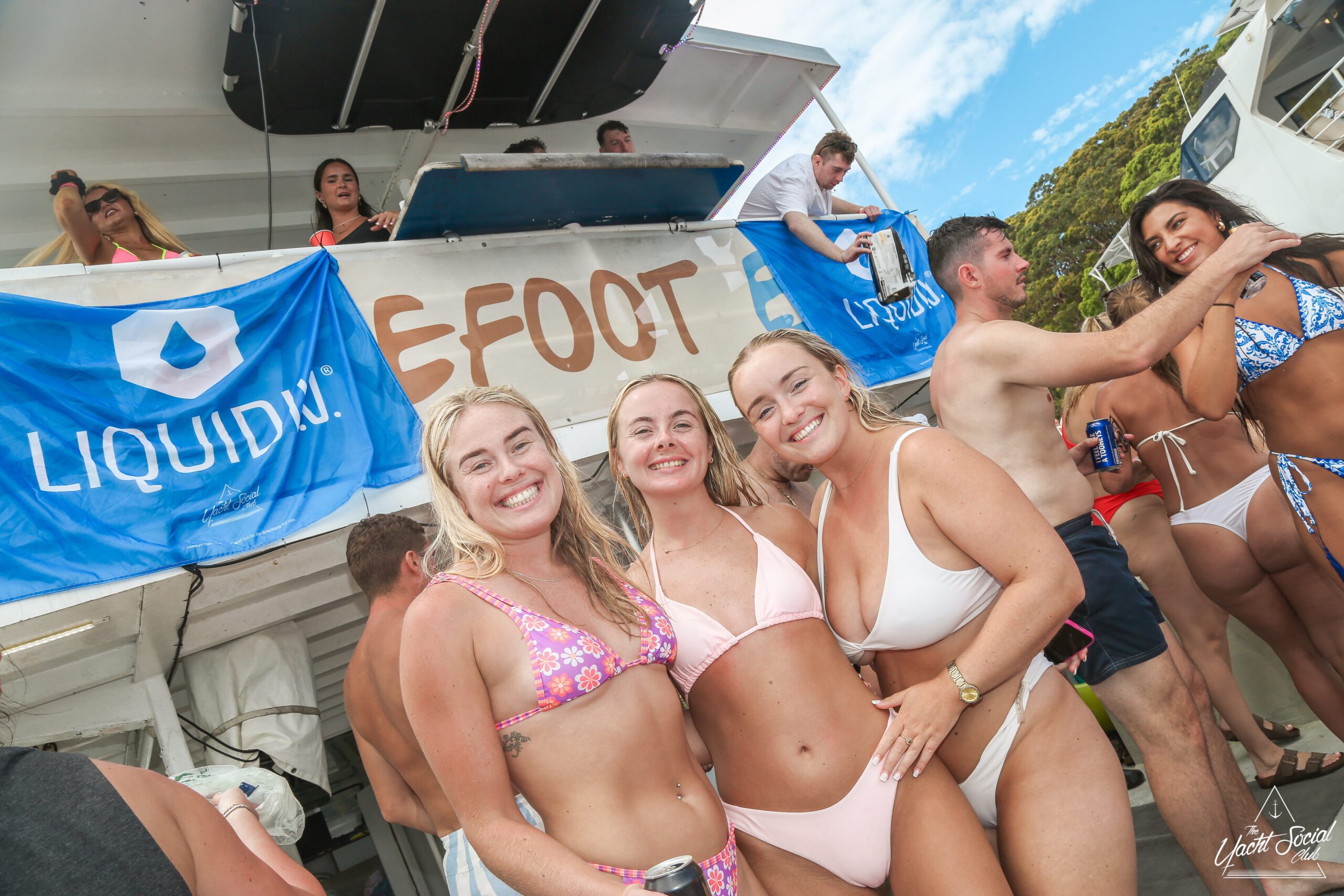 Three women in swimsuits pose happily on a boat with a scenic view of water and other boats in the background. They are smiling and appear to be enjoying a sunny day at a lively gathering.