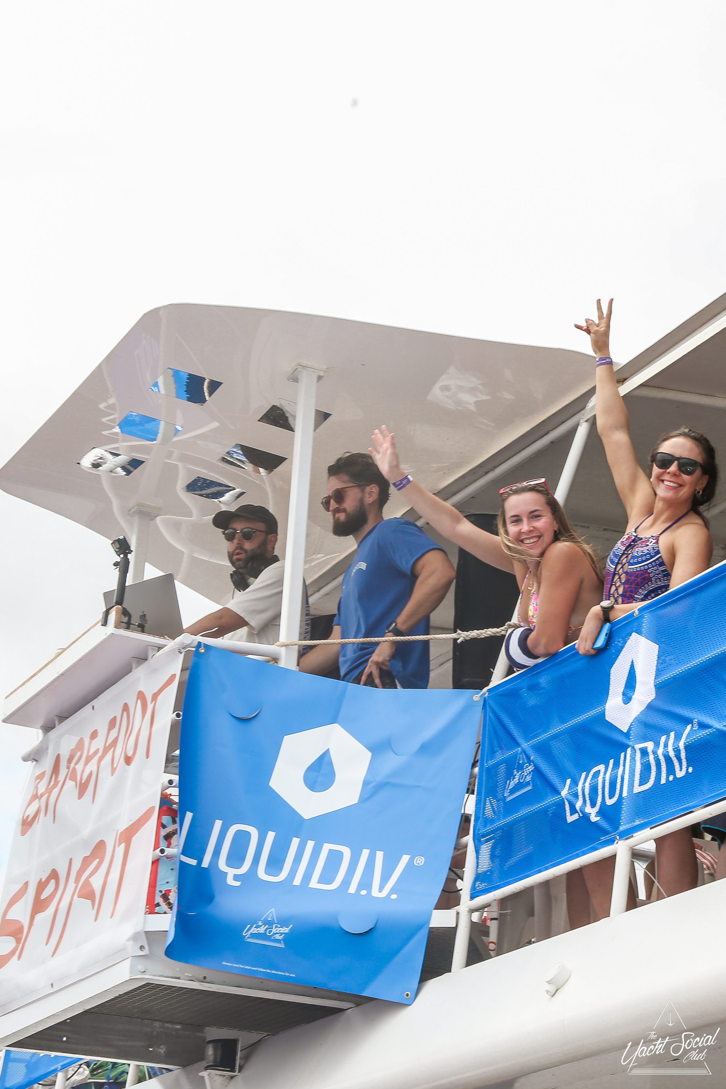 A group of people stands on a boat deck with blue Liquid I.V. banners. Two women are smiling and waving, while two men, one wearing sunglasses, watch. They appear to be enjoying a sunny day on the water.