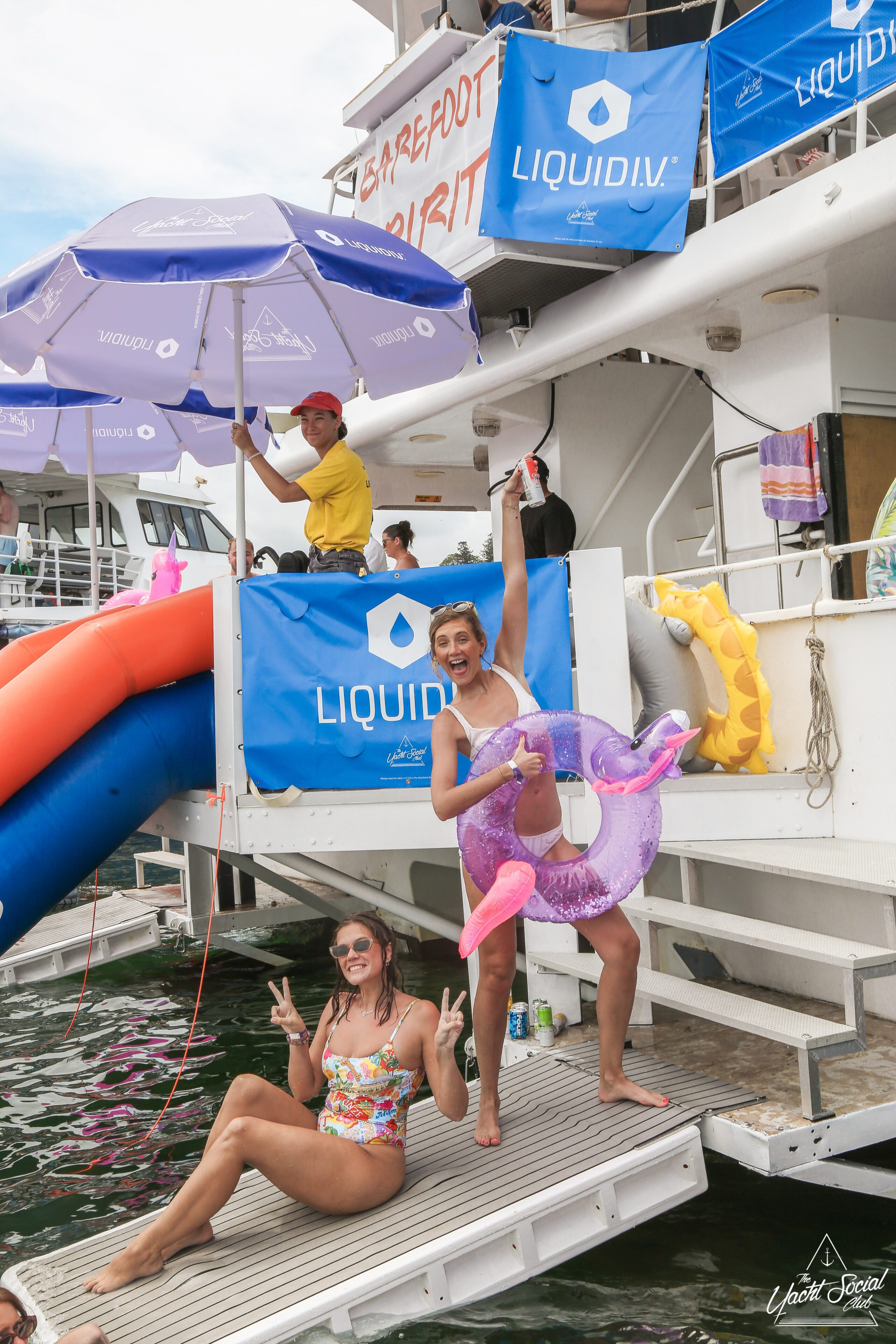 A group of people in swimsuits are enjoying a sunny day on a boat. Three women are smiling at the camera in the foreground. A "Liquid IV" banner is visible in the background. Trees and a partly cloudy sky are in the distance.