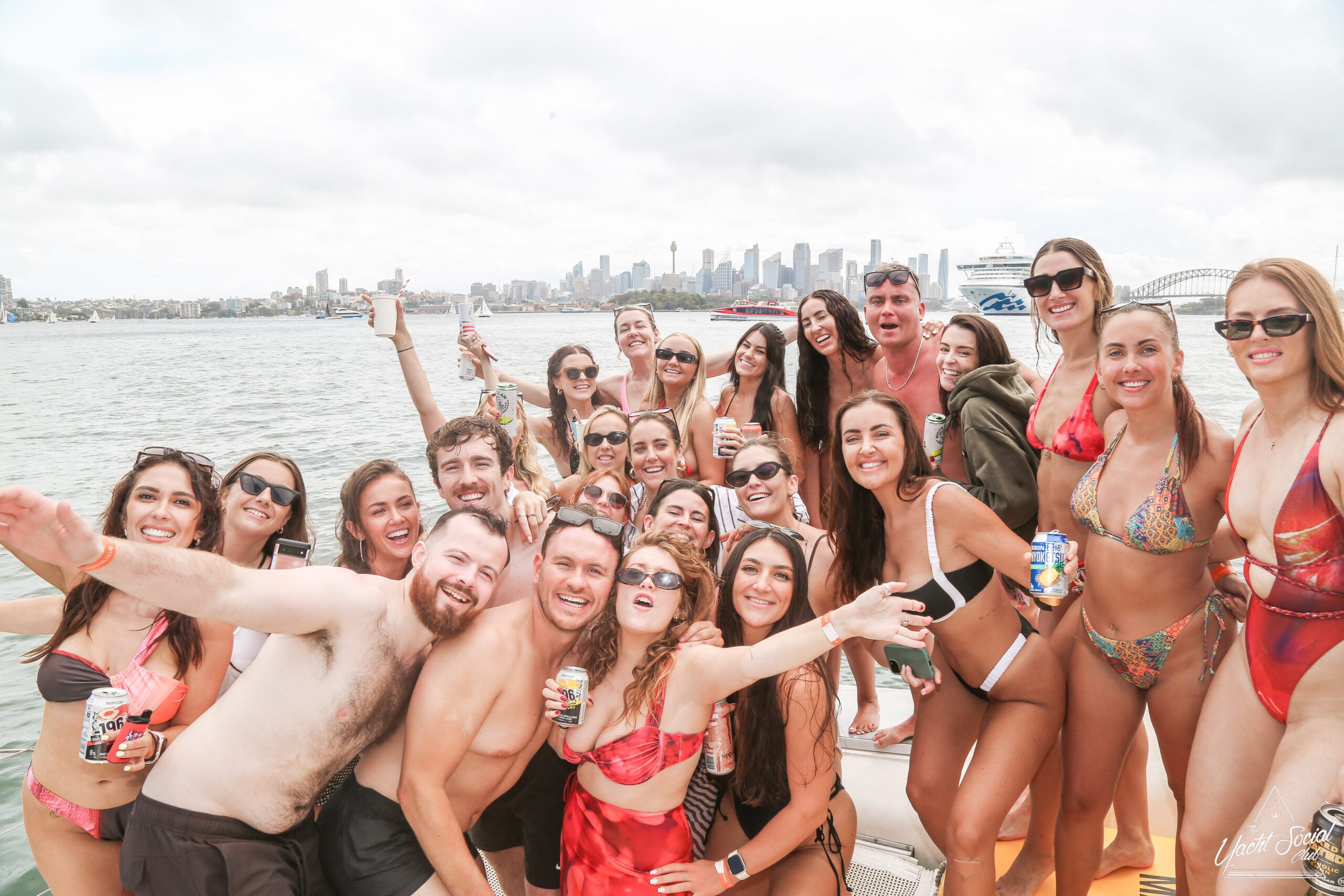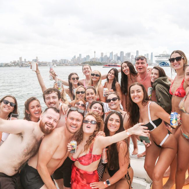 A group of people in swimwear enjoying a sunny day on a boat. They are smiling, holding drinks, and posing for the camera. The background features water and a distant city skyline.