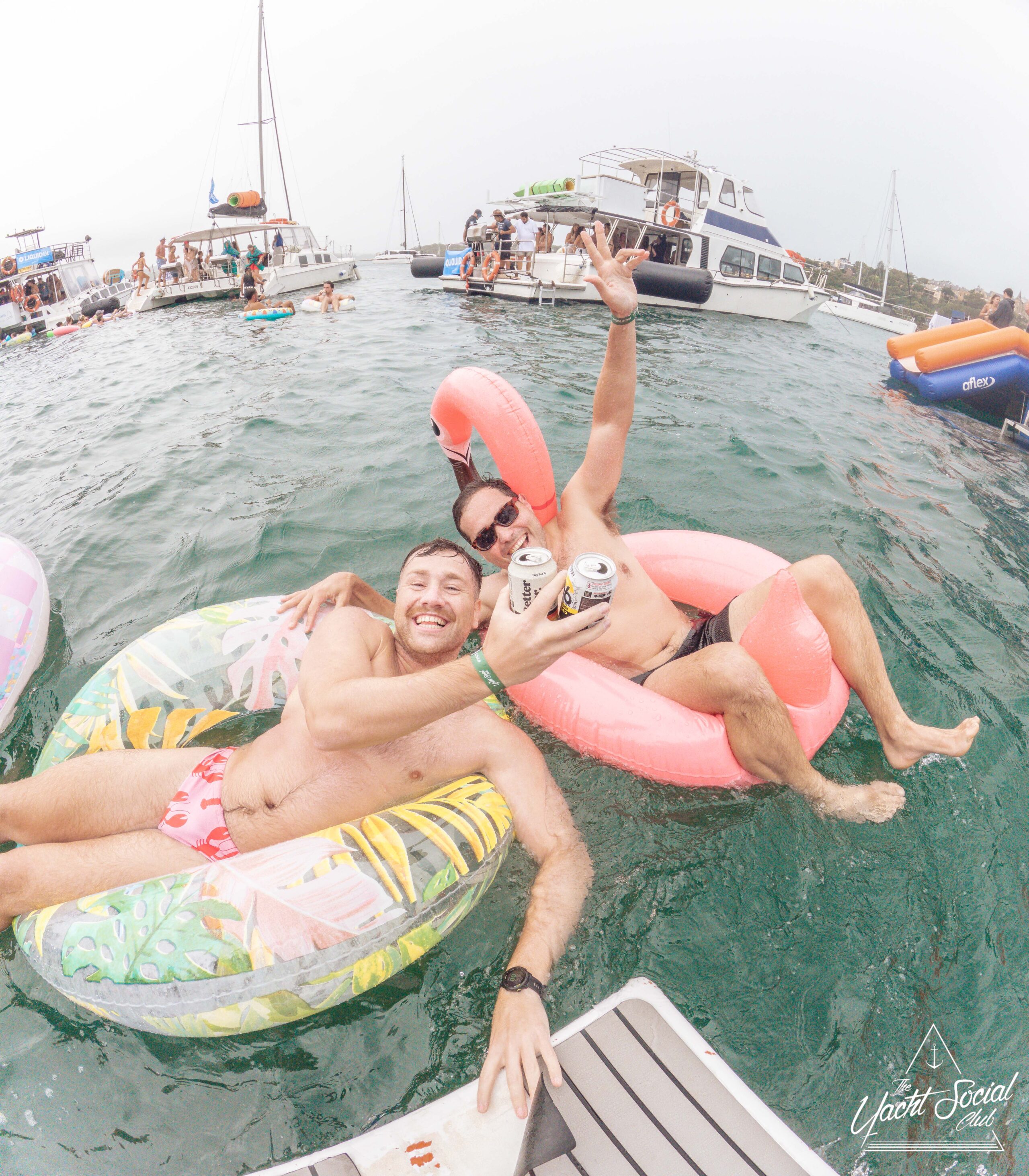 Two men in swimwear float on inflatable pool tubes in the water, smiling and raising beer cans. Boats and people are in the background, suggesting a lively party atmosphere on the water.