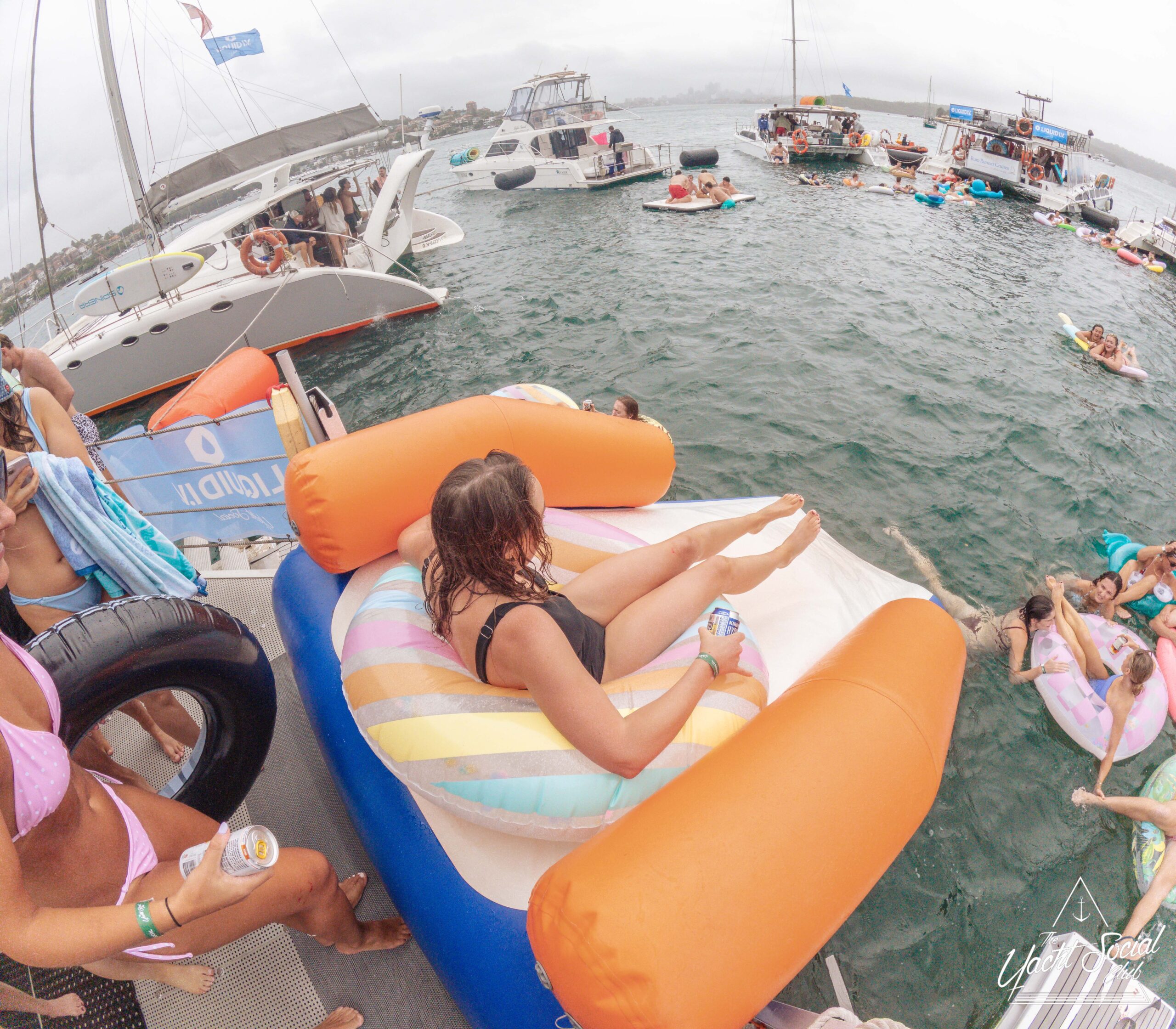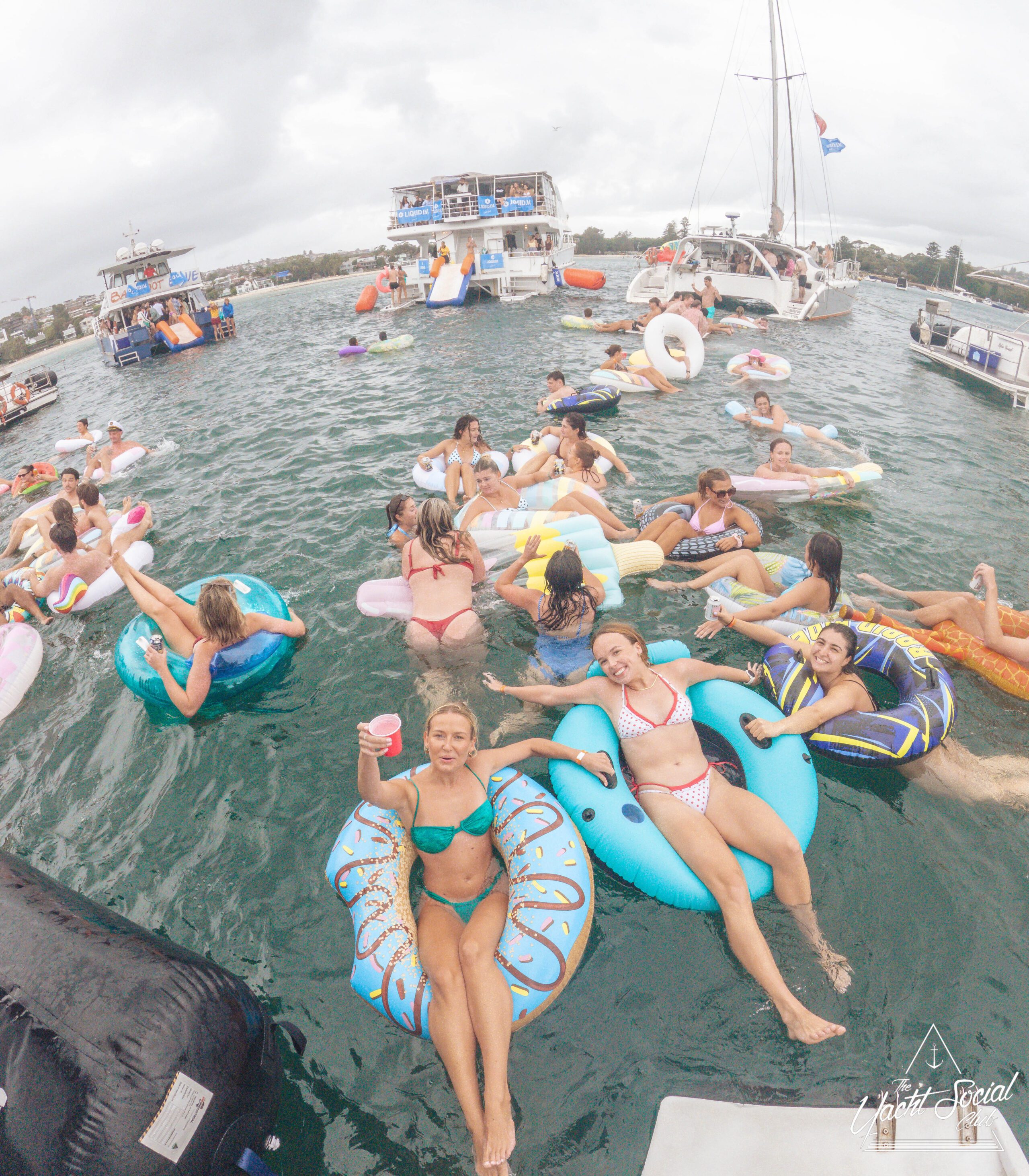 A group of people float on colorful inflatables in a lively party scene on the water, with boats anchored nearby. Most wear swimsuits and appear to be relaxing or celebrating under a cloudy sky.