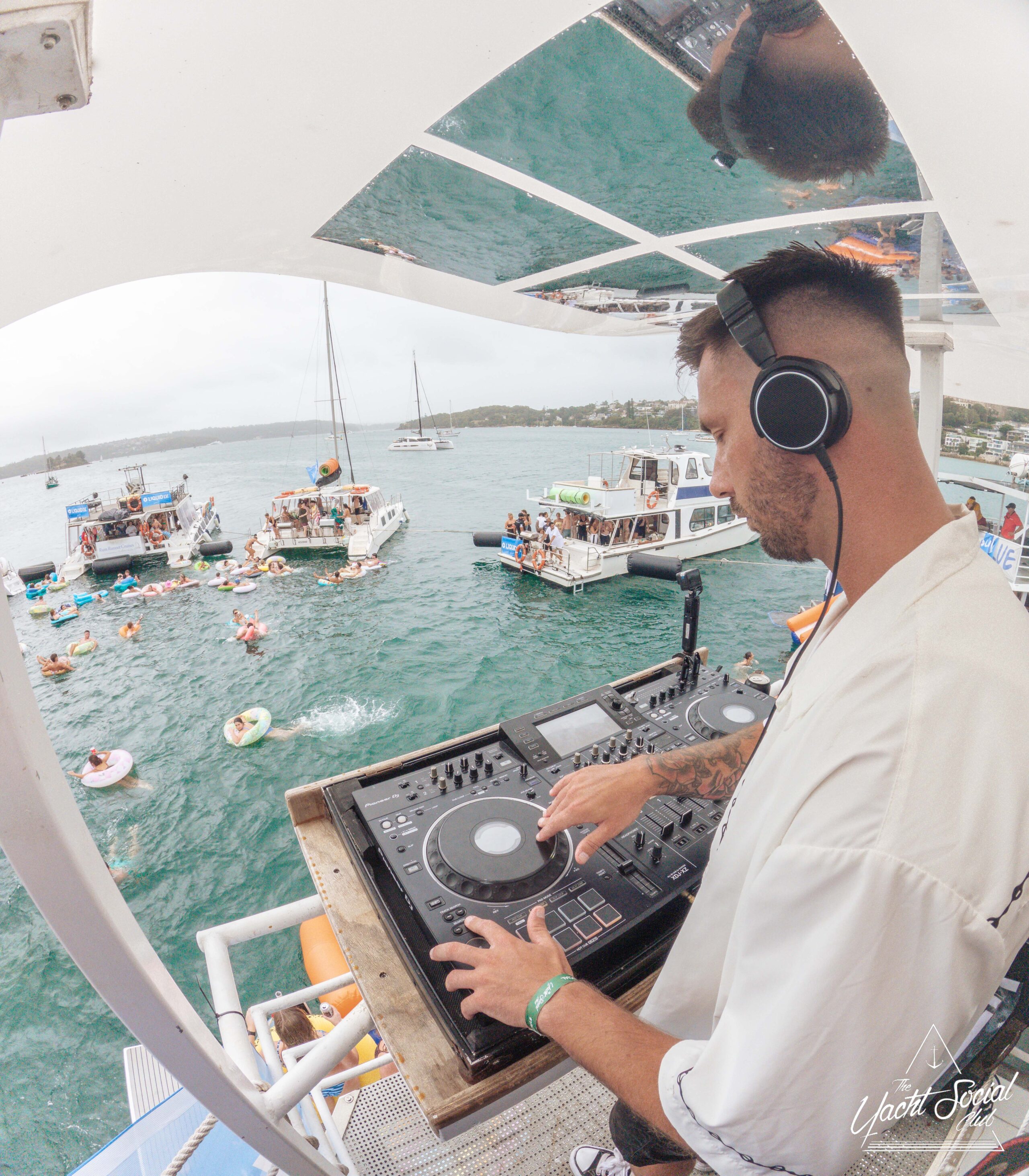 A DJ wearing headphones mixes music on a boat deck overlooking a lively scene of people swimming and relaxing on floats near other boats in a bay. The water is blue-green, and the atmosphere is festive and relaxed.