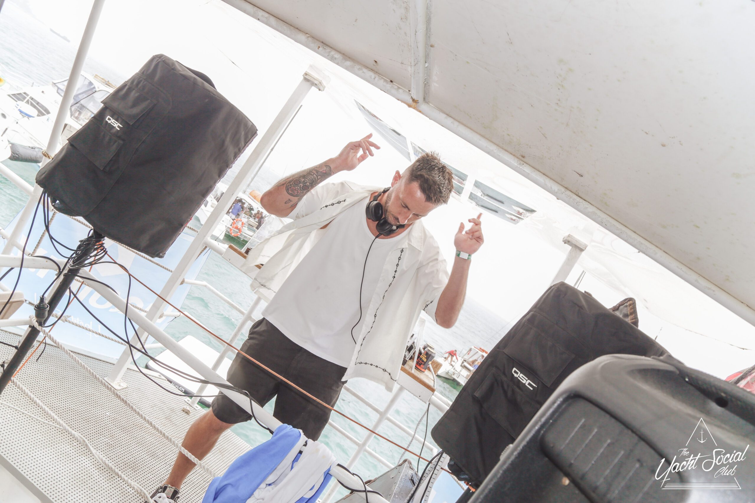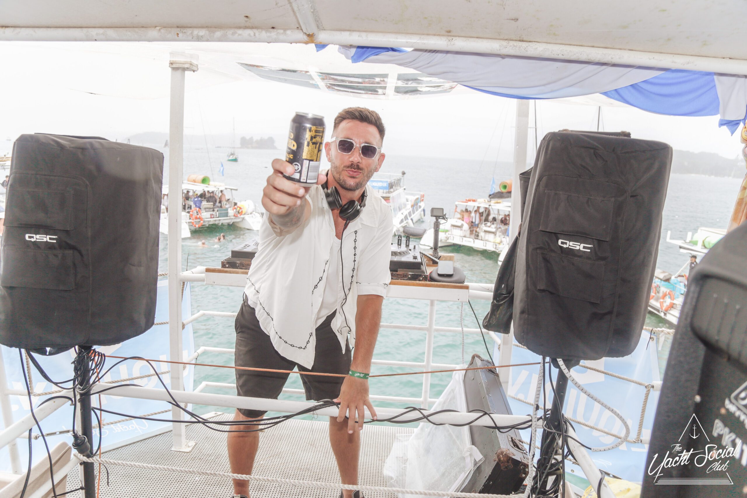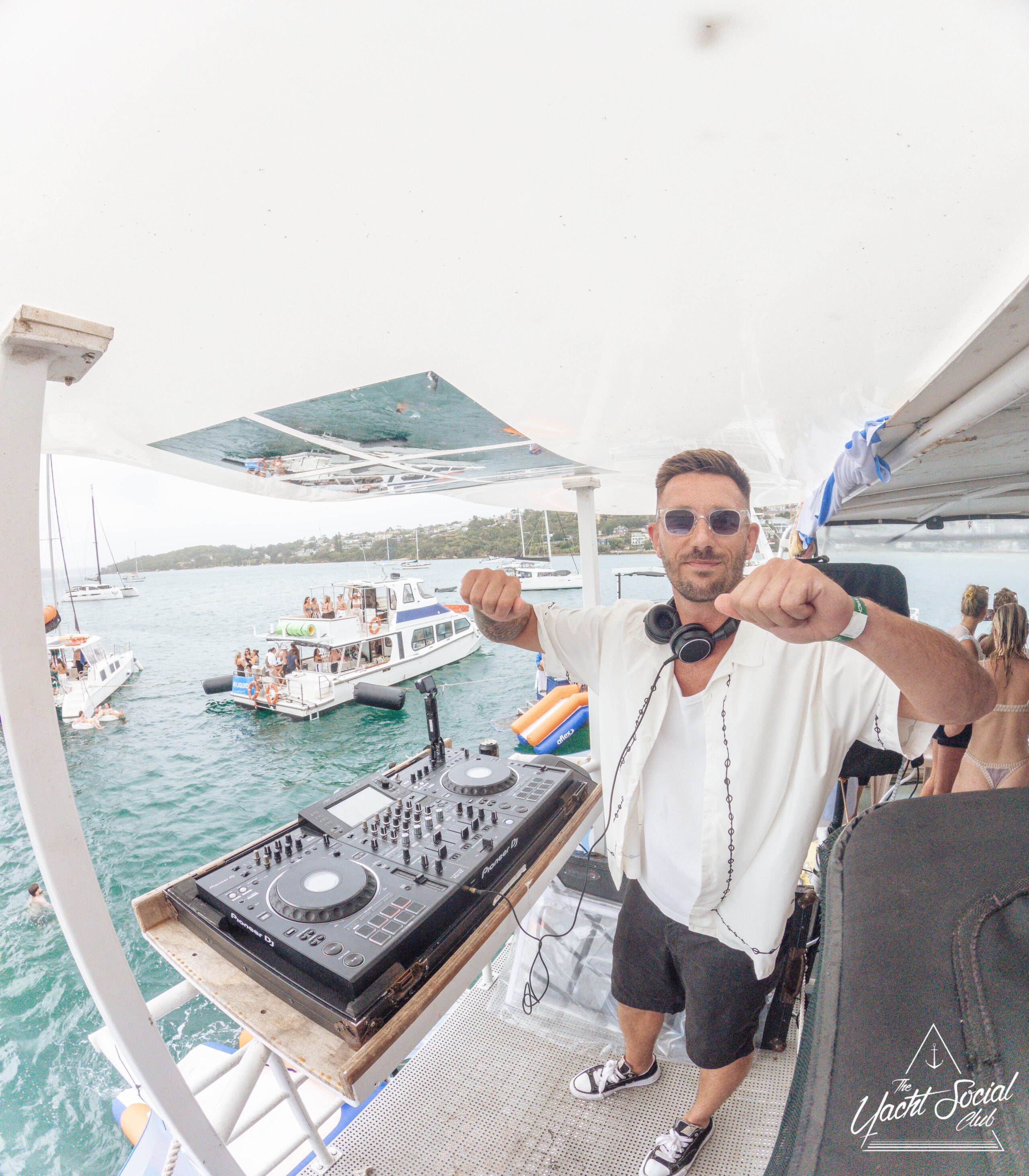 A DJ wearing sunglasses and headphones smiles and poses with raised fists on a boat deck, with a DJ controller in front of him and people on boats in the water in the background.