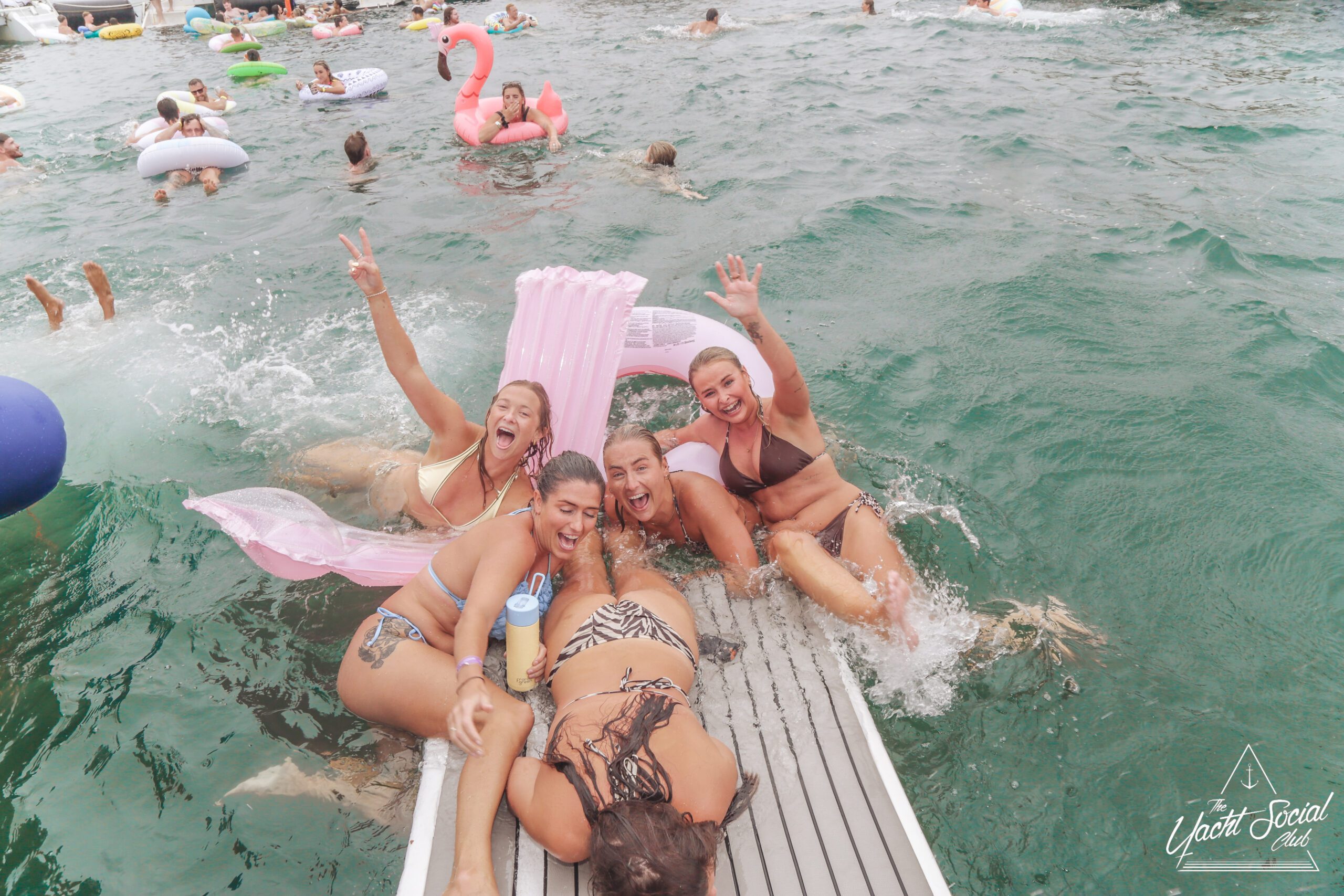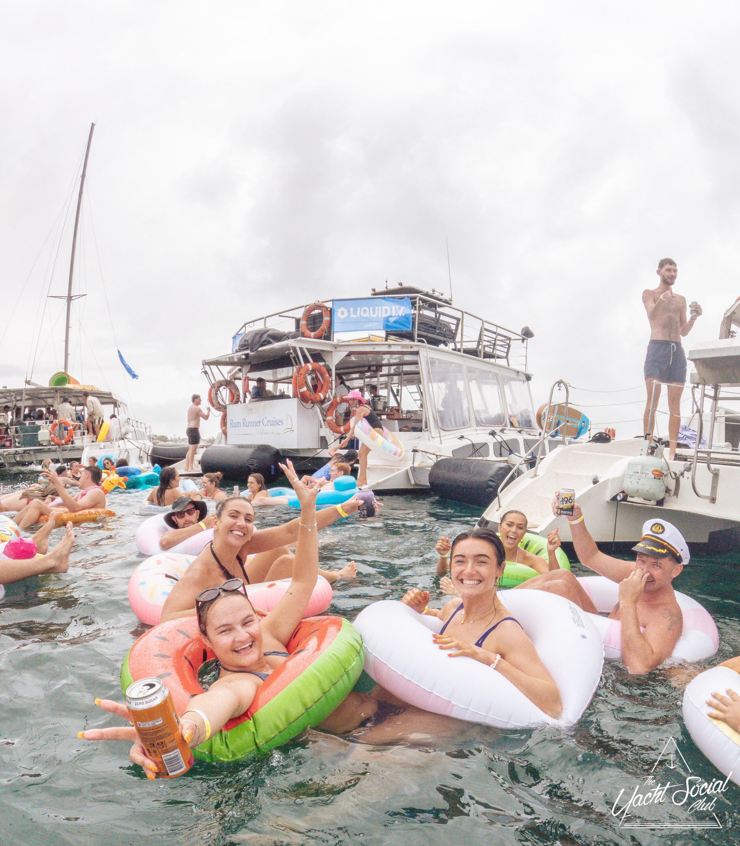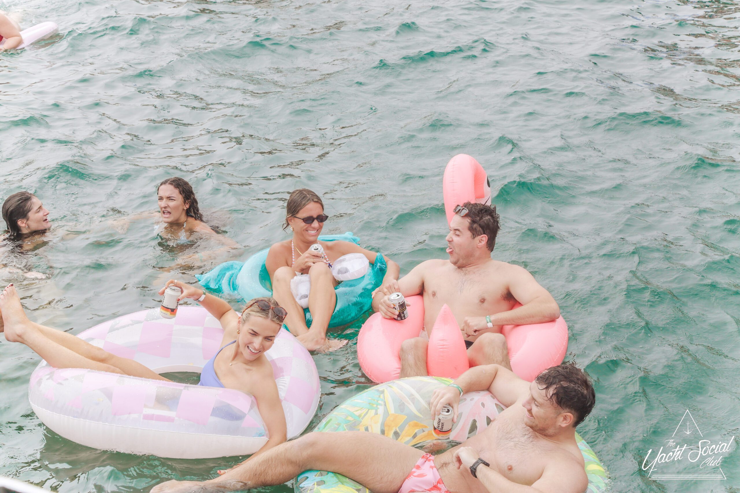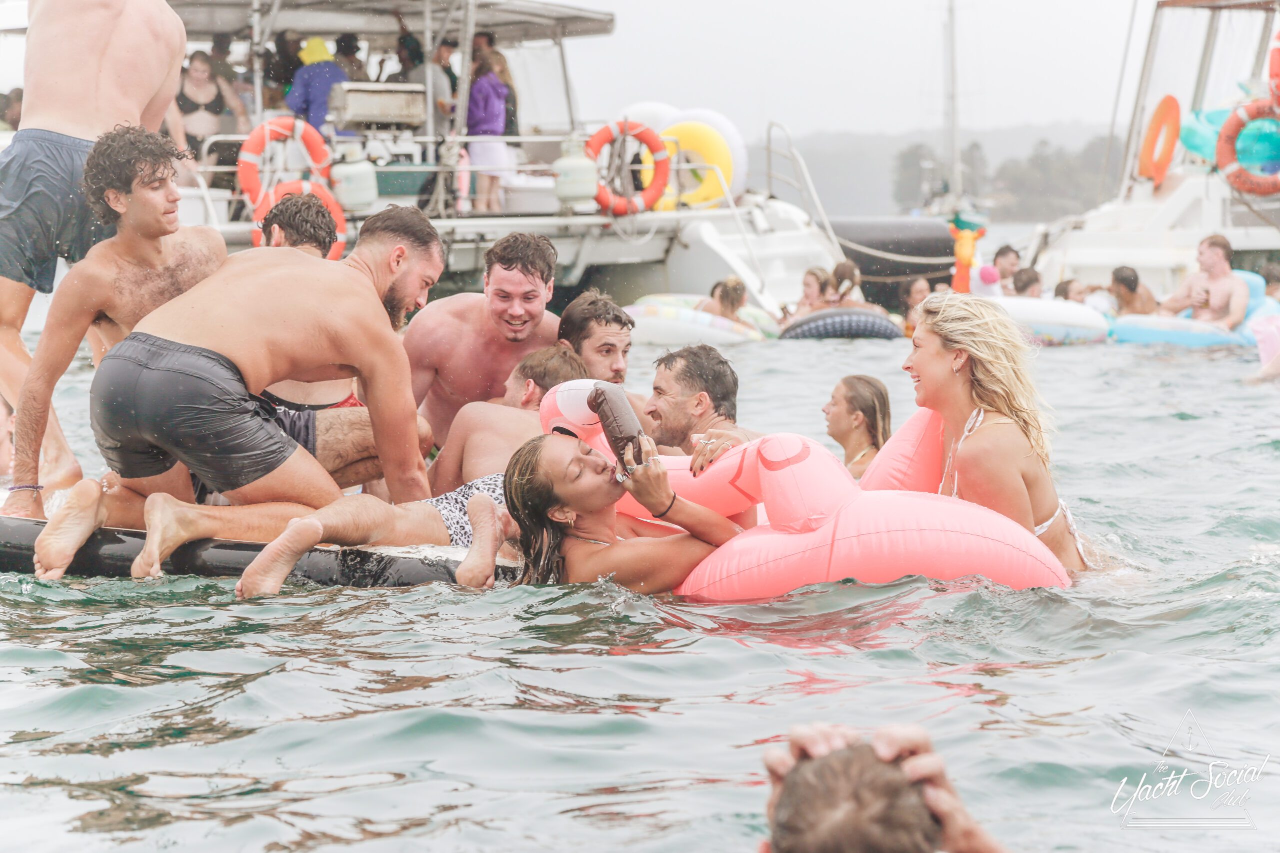 A group of people in colorful floaties smile and hold drinks while partying in the water near several docked boats. The atmosphere is festive, with more people relaxing and celebrating on the boats in the background.