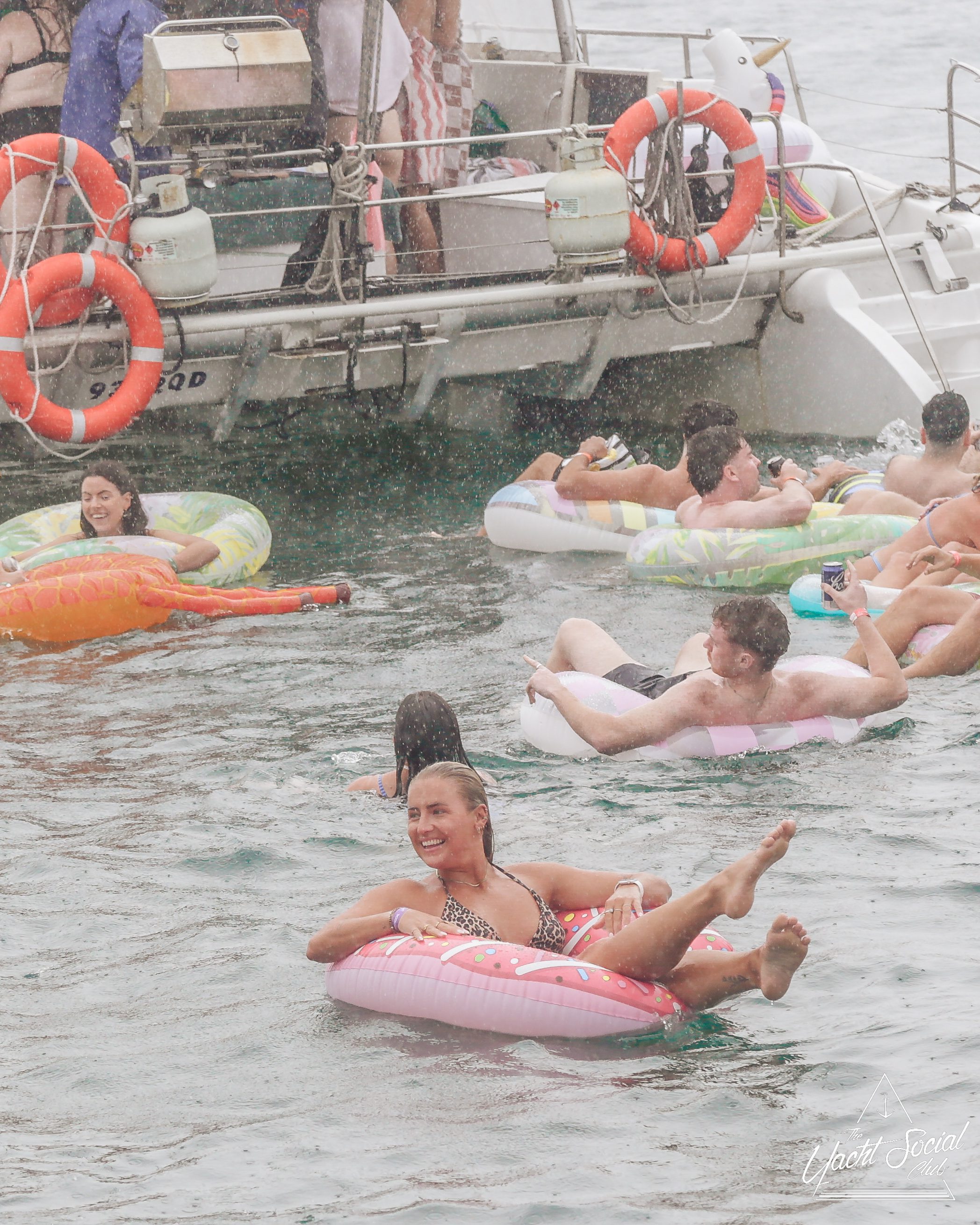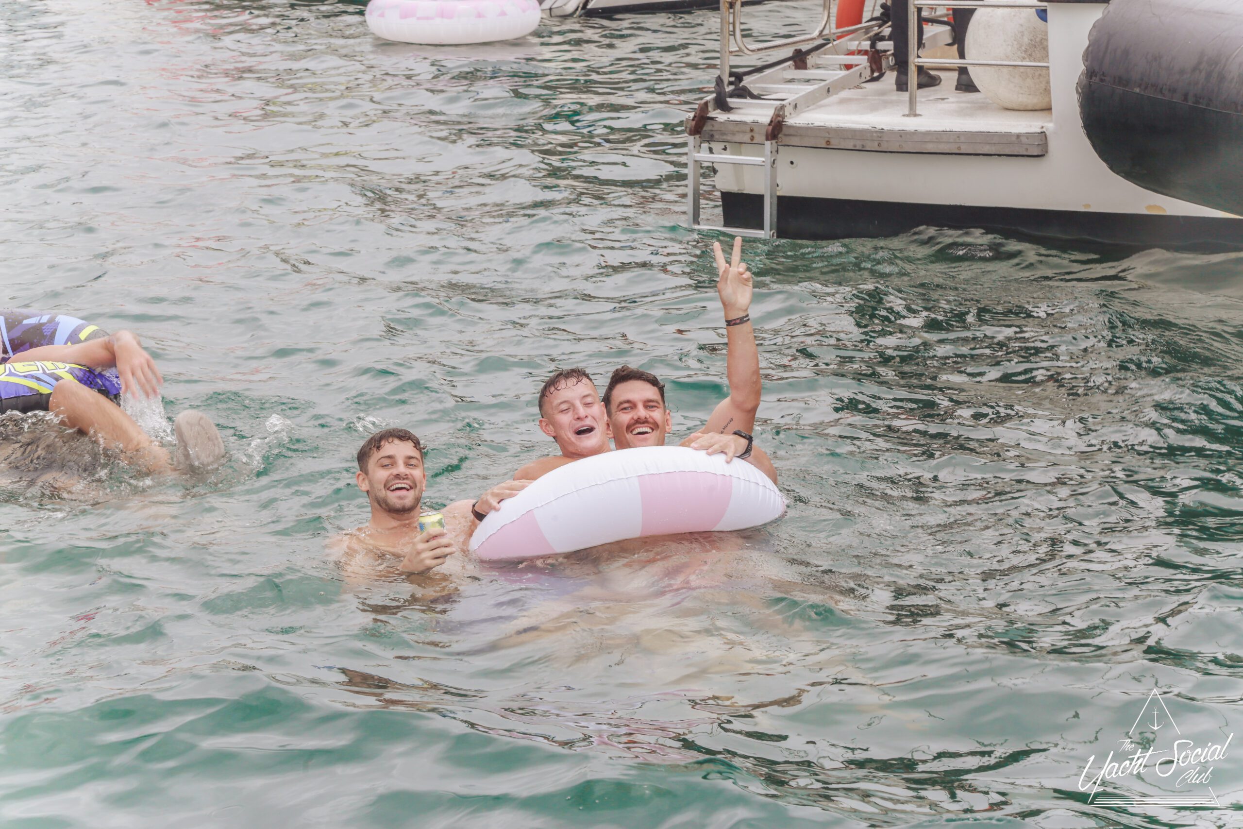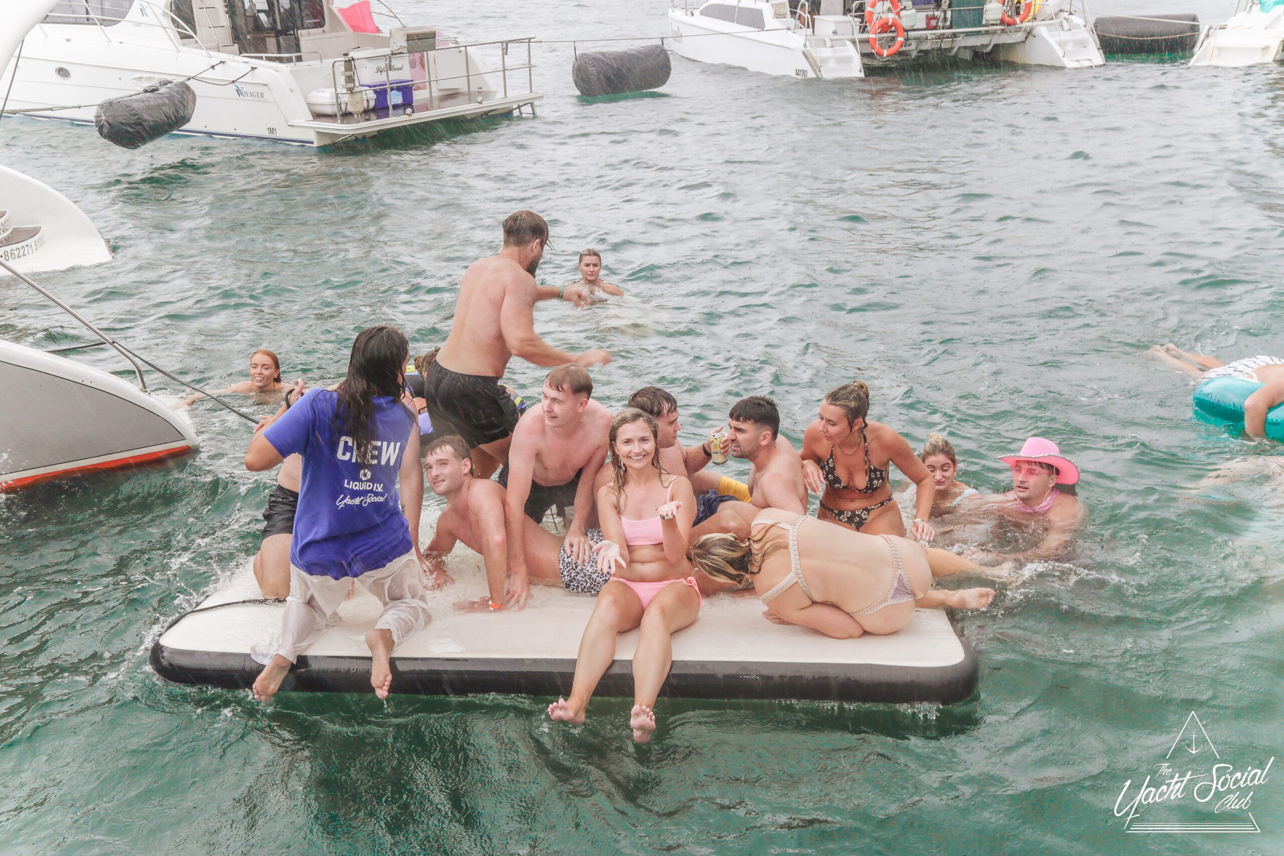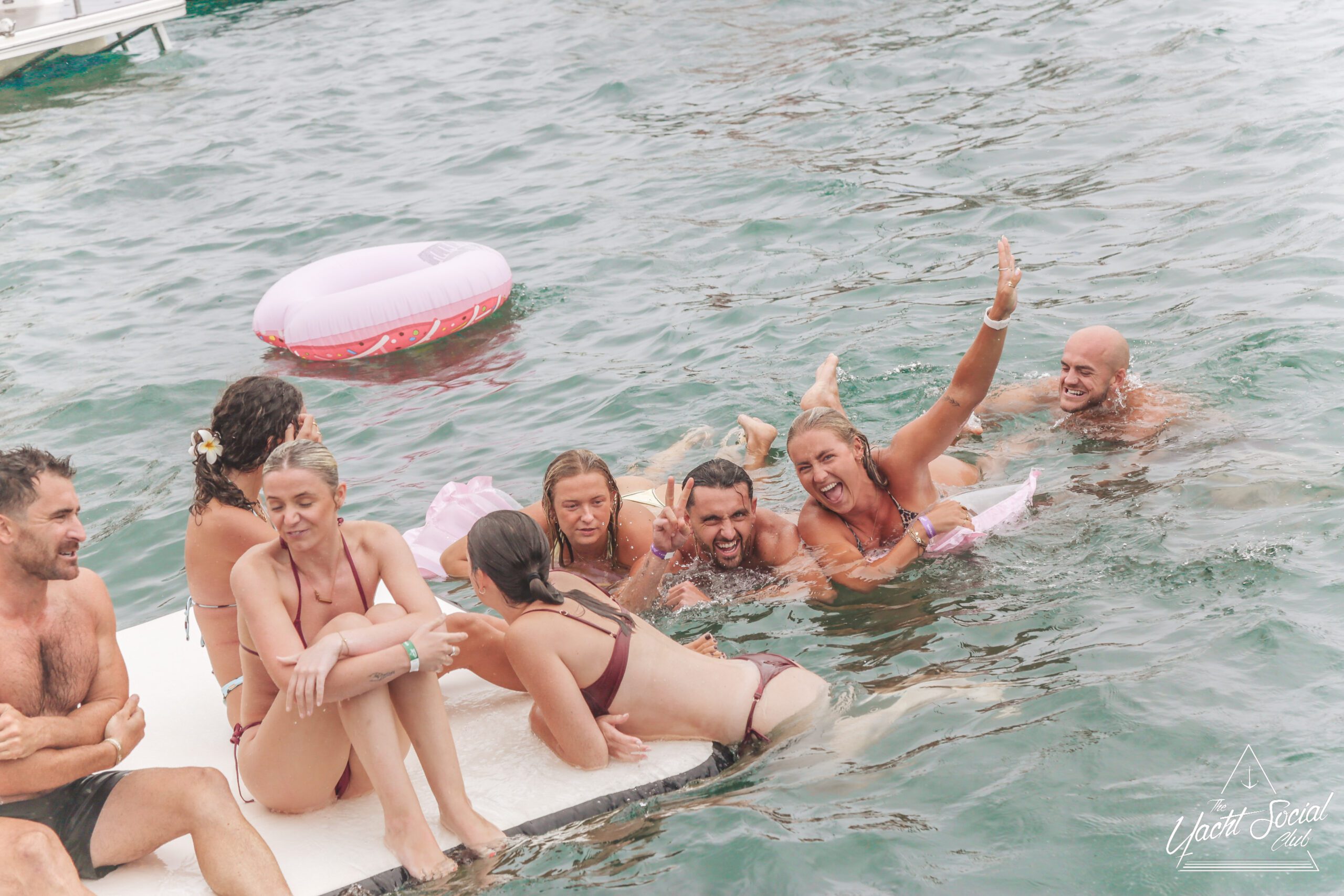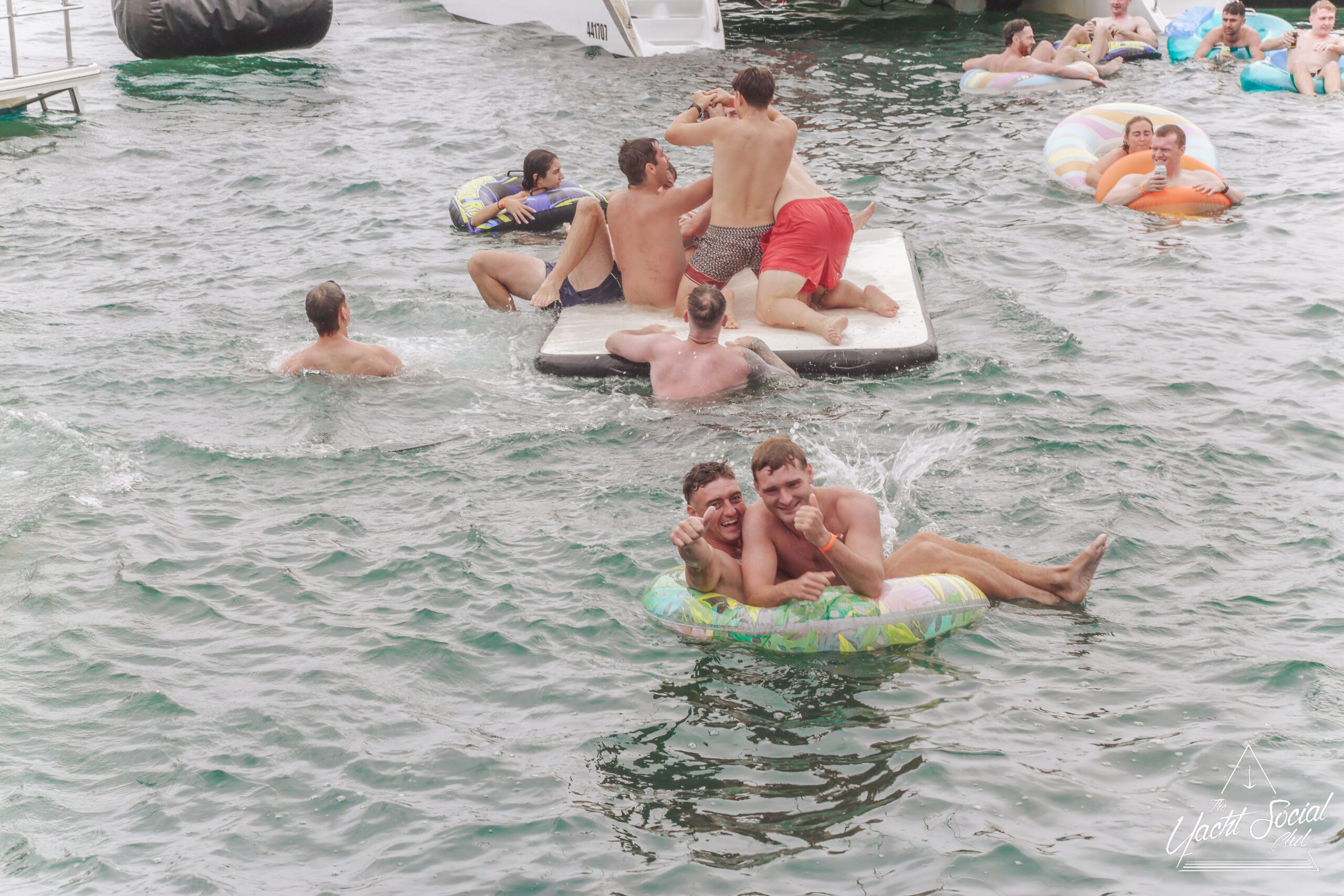 A group of people in colorful floaties smile and hold drinks while partying in the water near several docked boats. The atmosphere is festive, with more people relaxing and celebrating on the boats in the background.