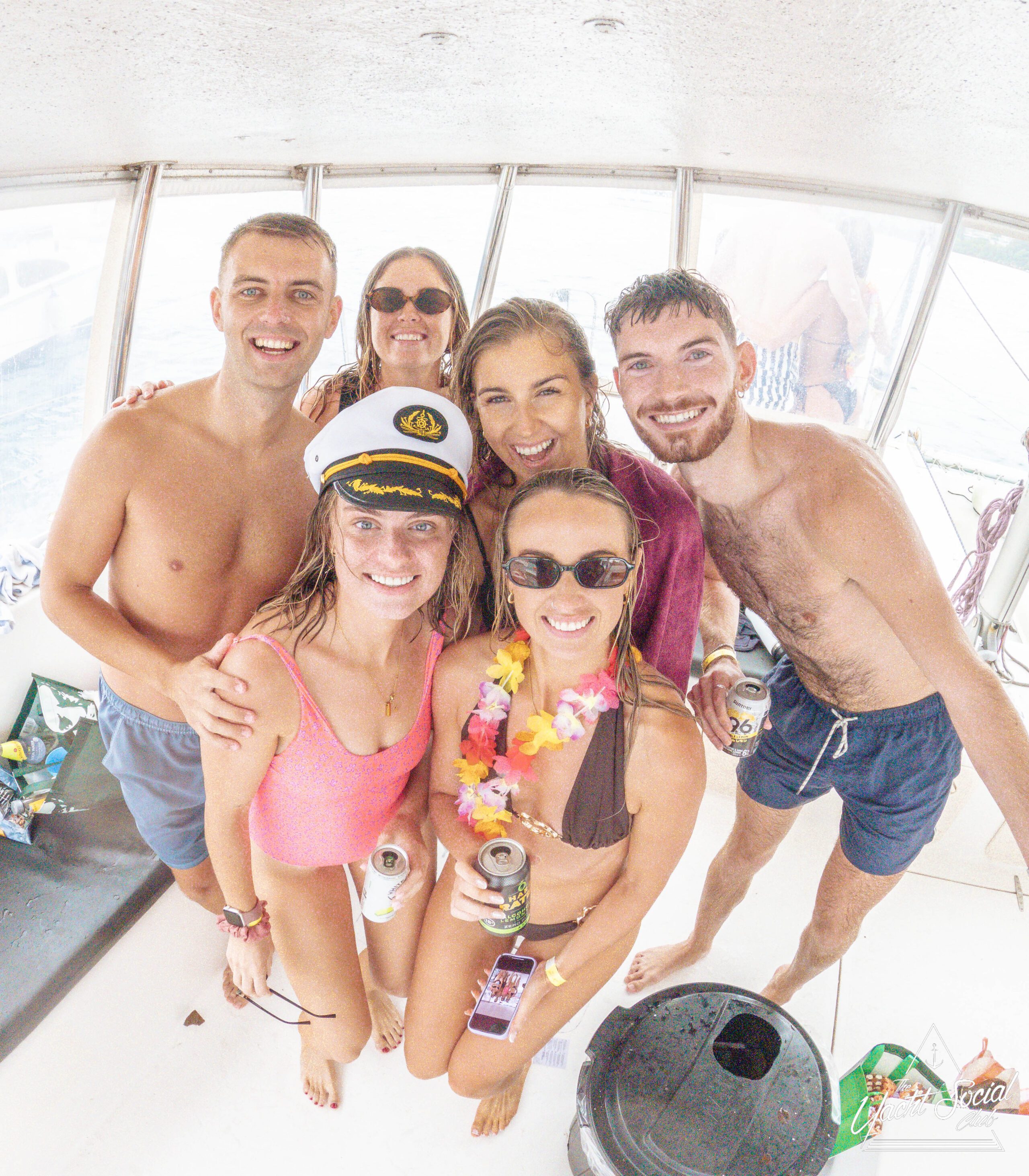 Six smiling young adults pose together on a boat, wearing swimsuits and holding drinks. One woman wears a captain's hat, another a lei. It's bright and lively, with water visible in the background.