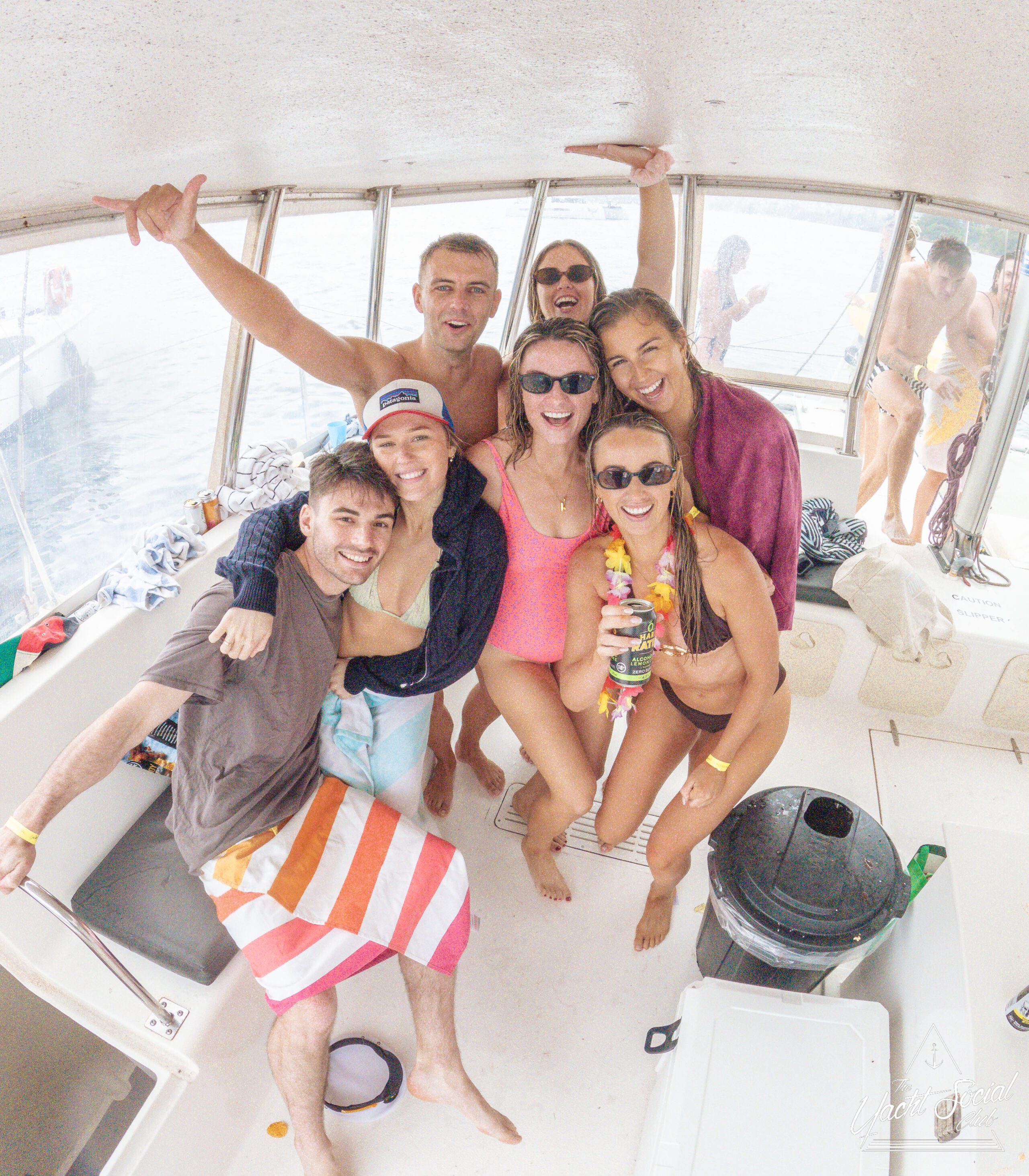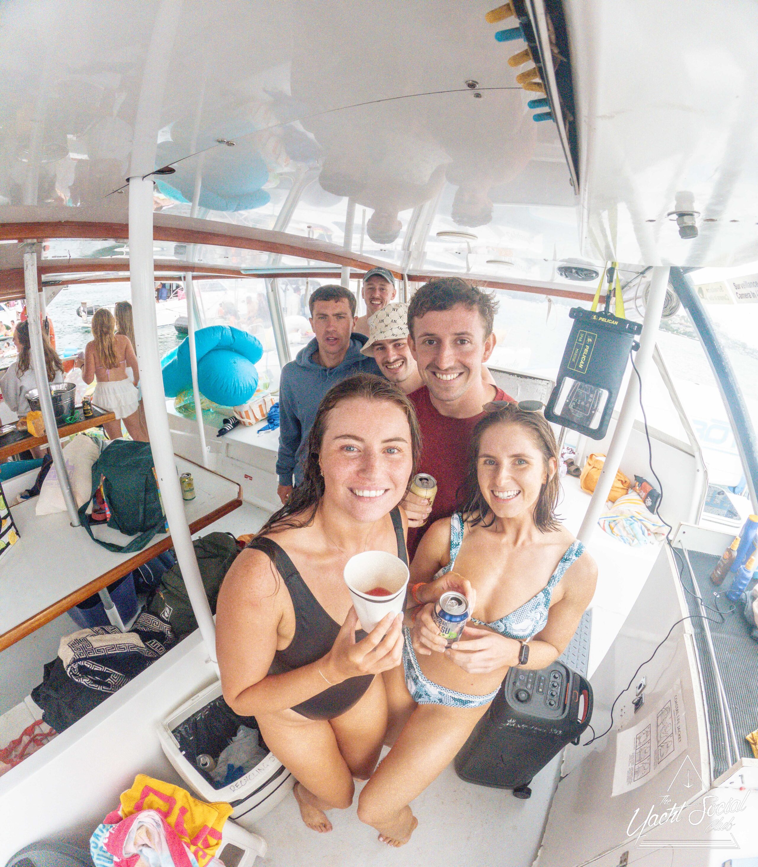 A group of smiling adults in swimsuits and casual clothing pose together on a boat, some holding red cups. The atmosphere is festive and relaxed, with the ocean visible through the windows behind them.