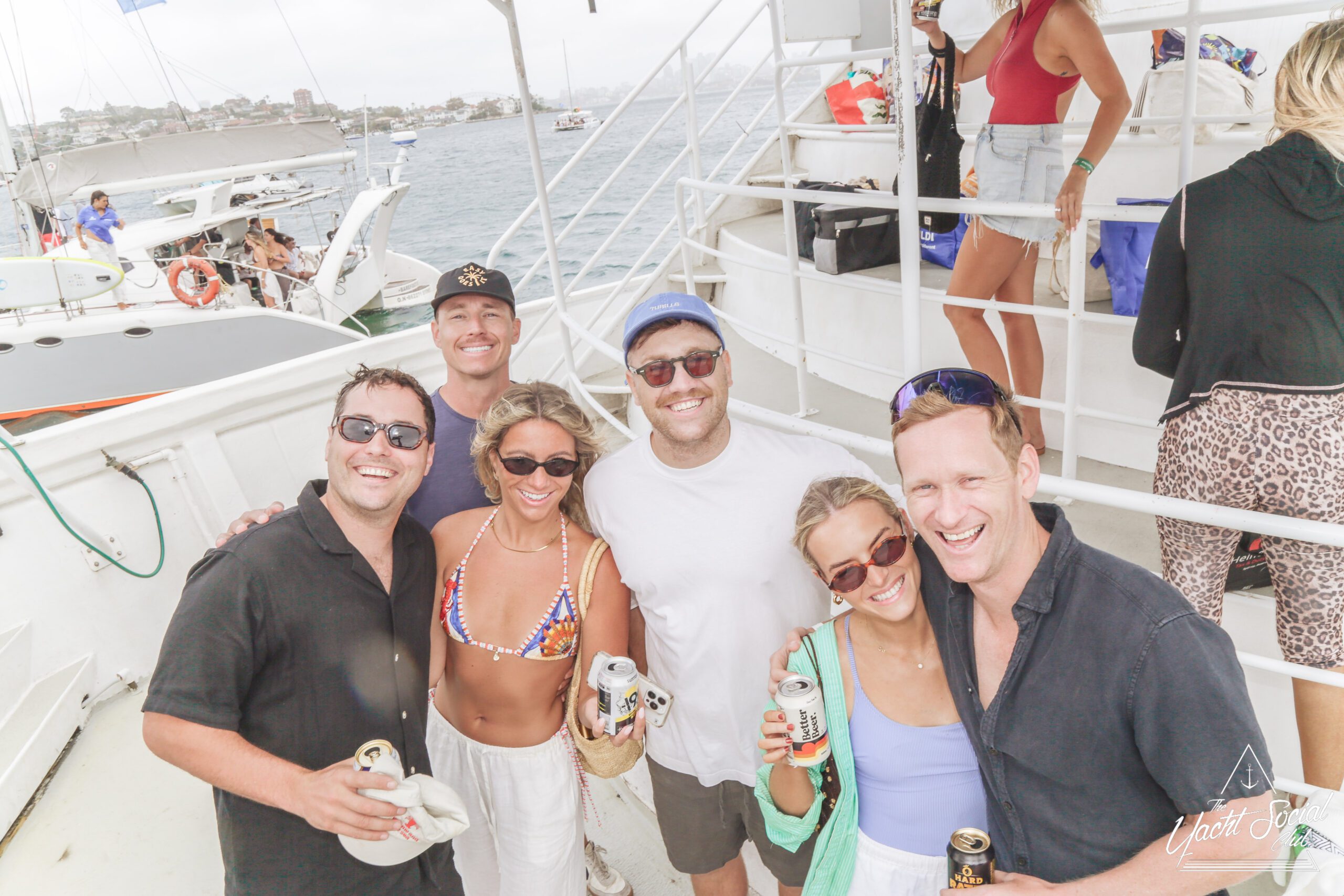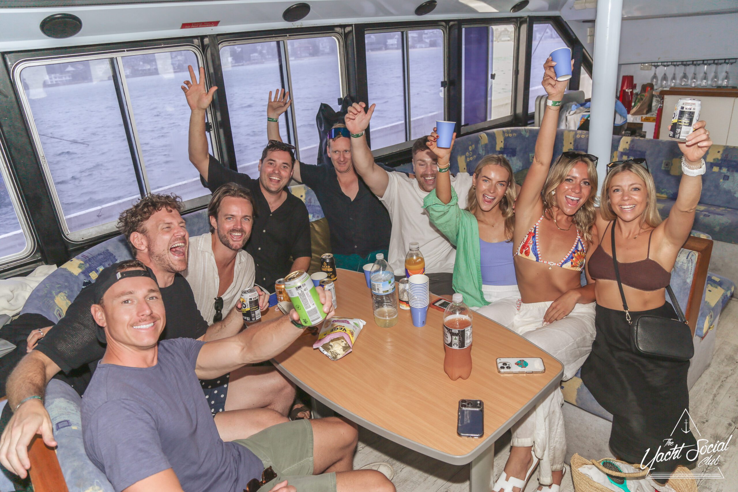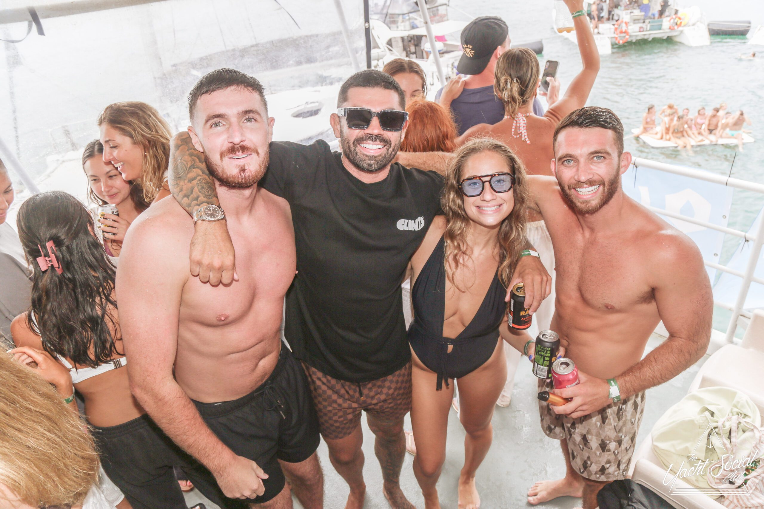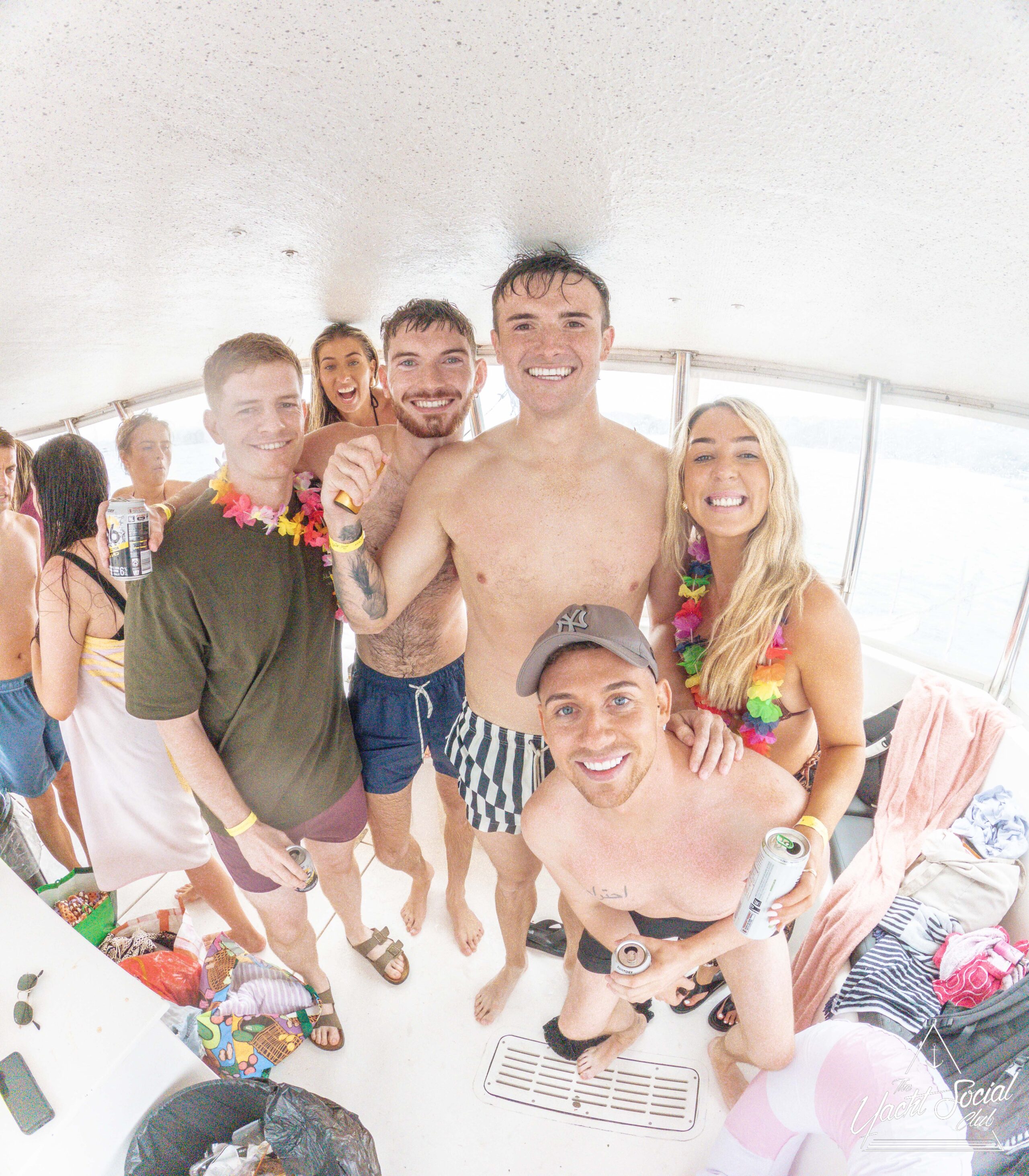 A group of people smiling and enjoying themselves on a boat party, some holding drinks. The background shows other boats on the water. The atmosphere is festive and relaxed.