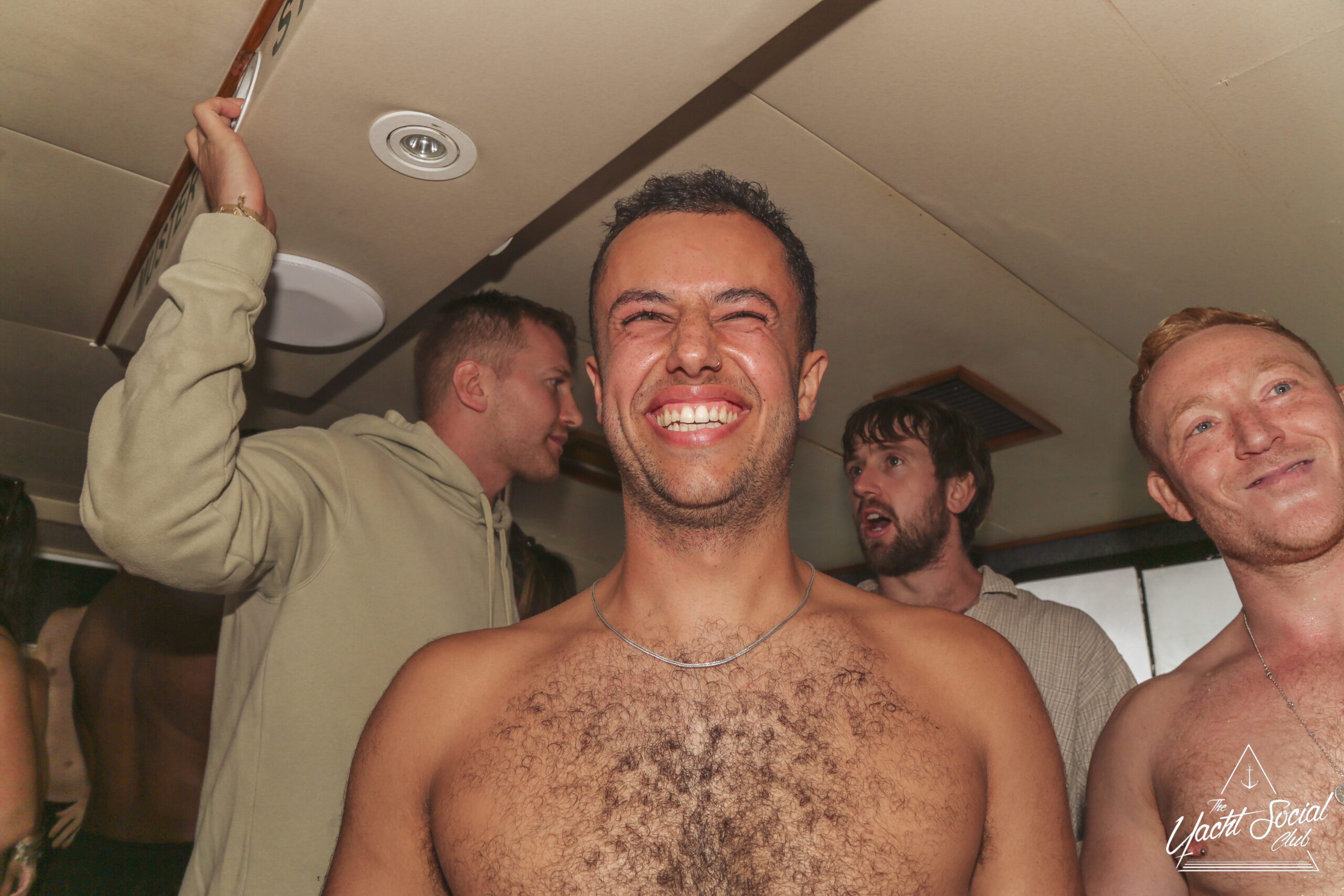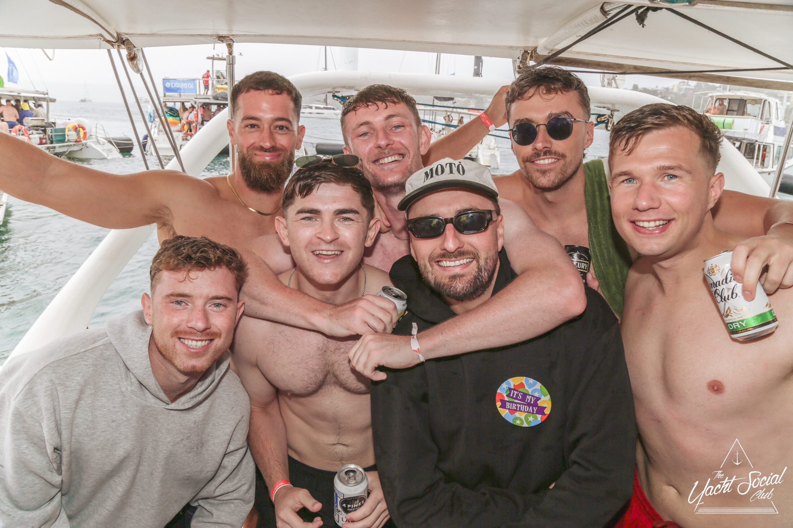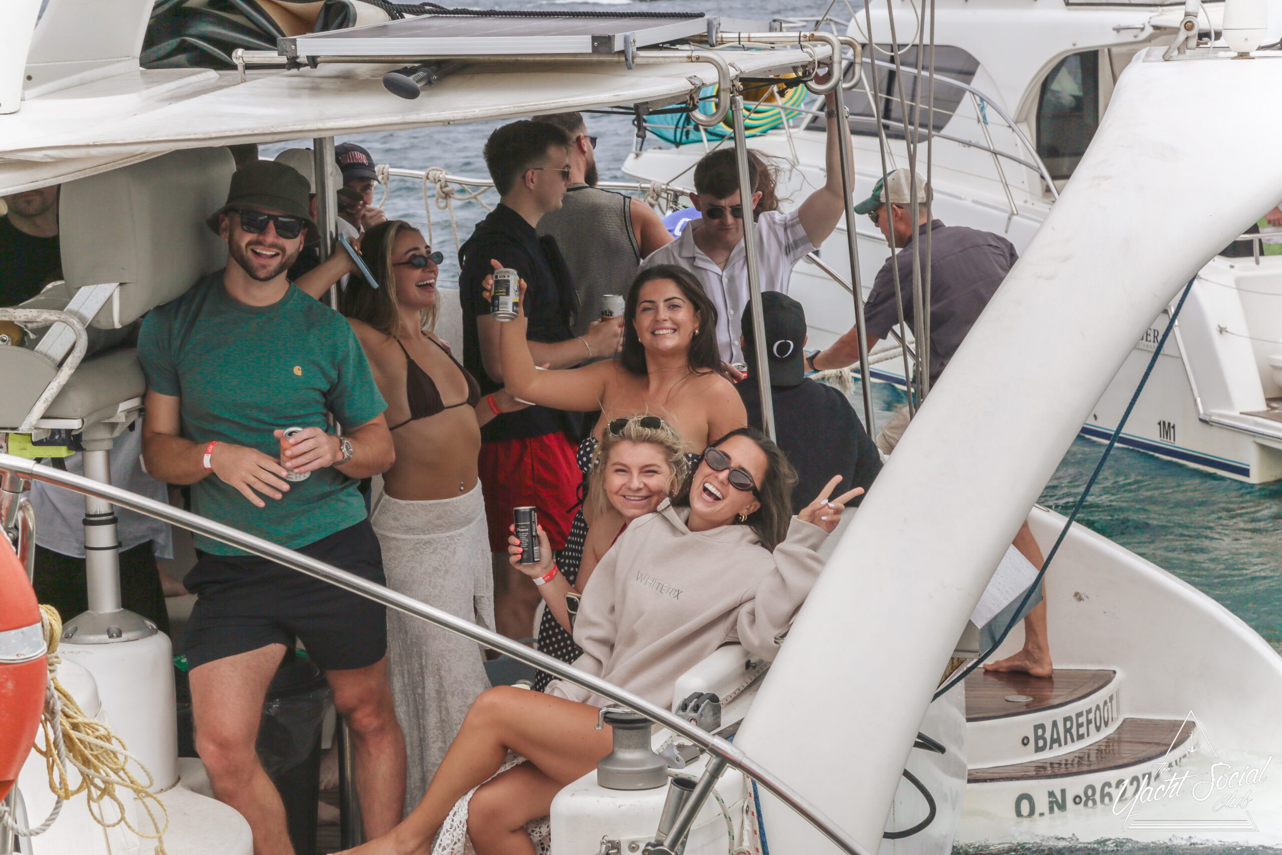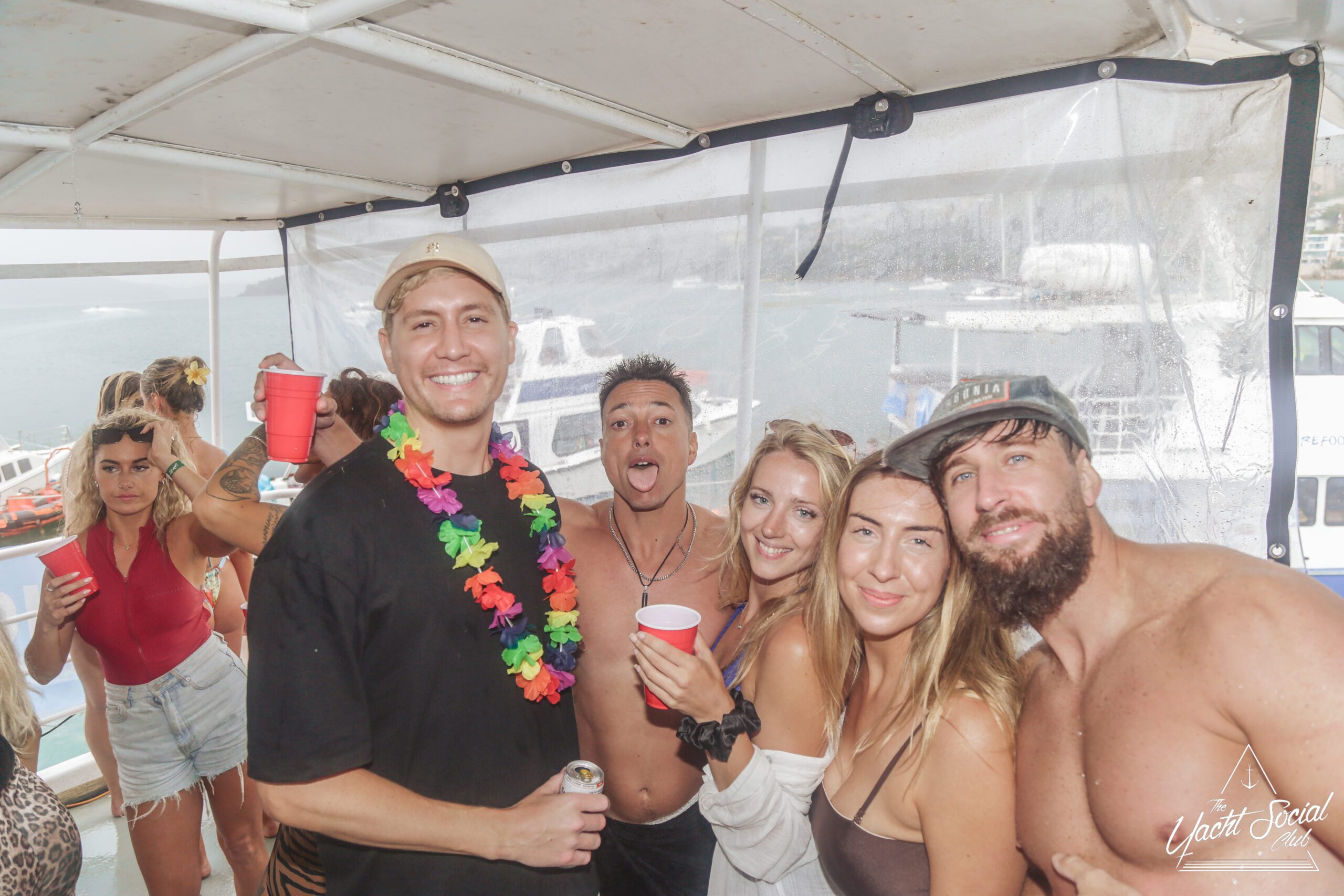 A group of people smiling and enjoying themselves on a boat party, some holding drinks. The background shows other boats on the water. The atmosphere is festive and relaxed.