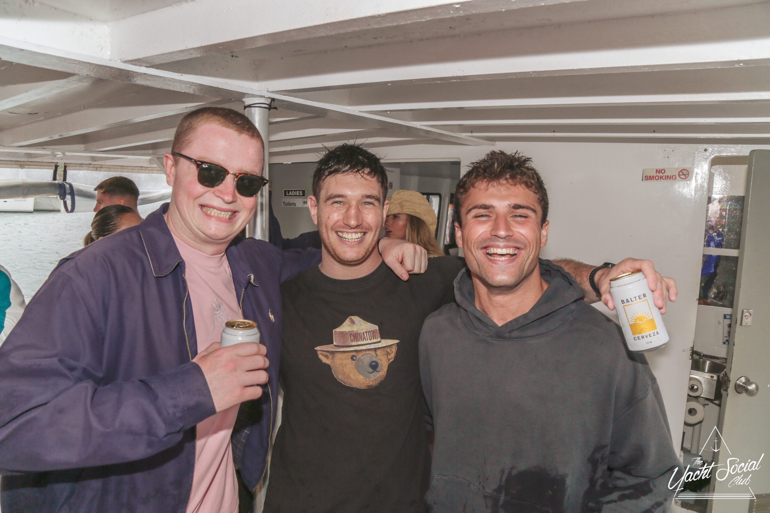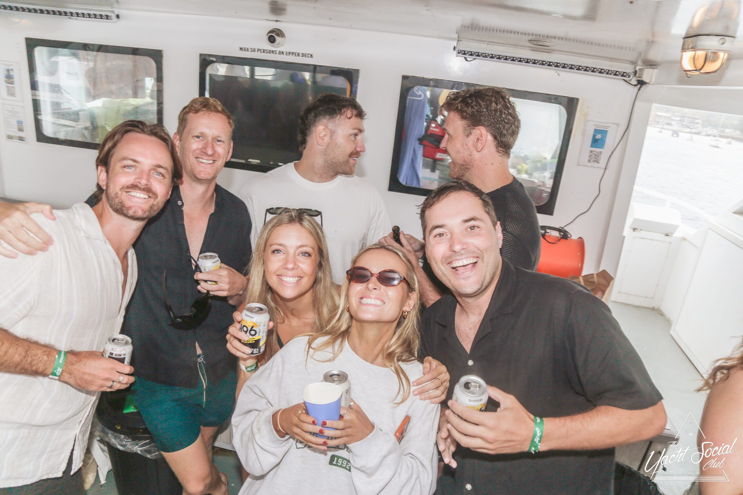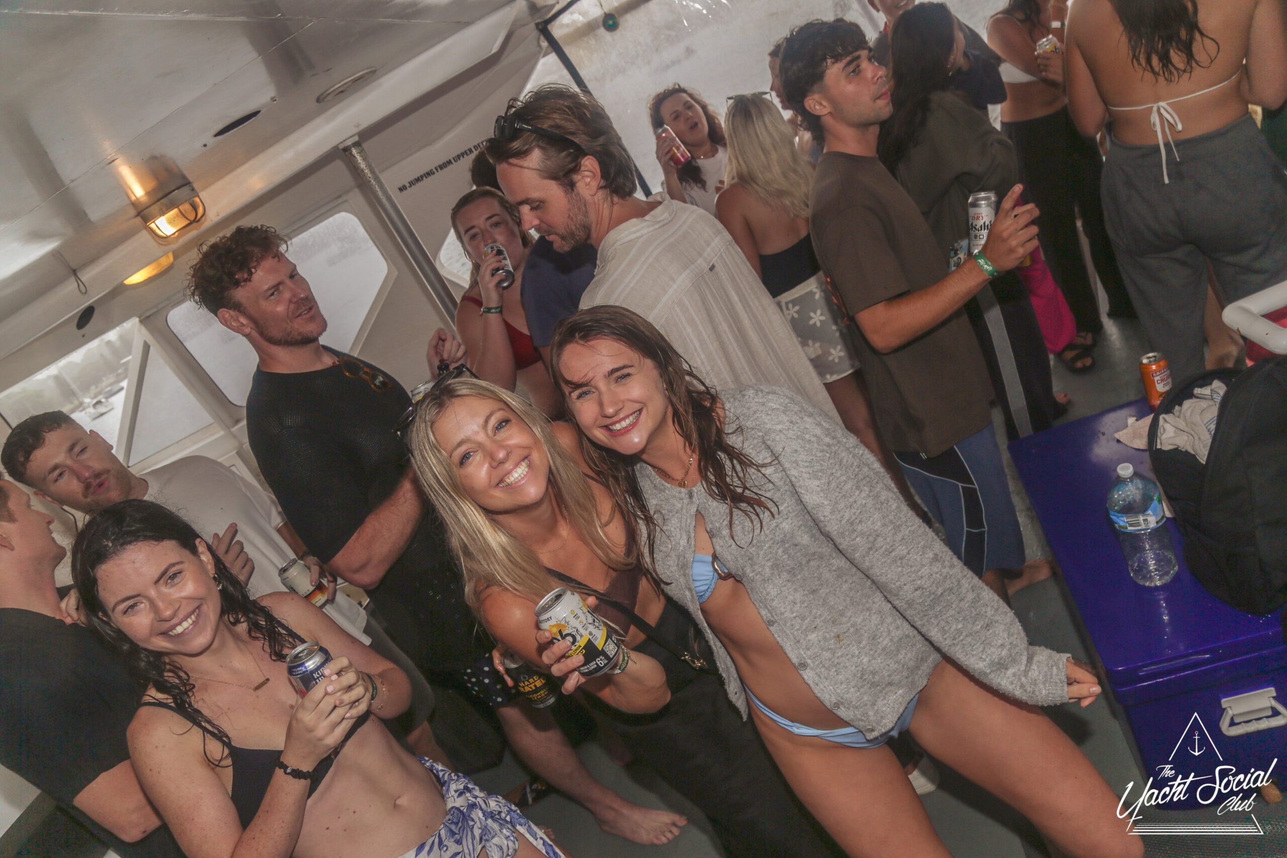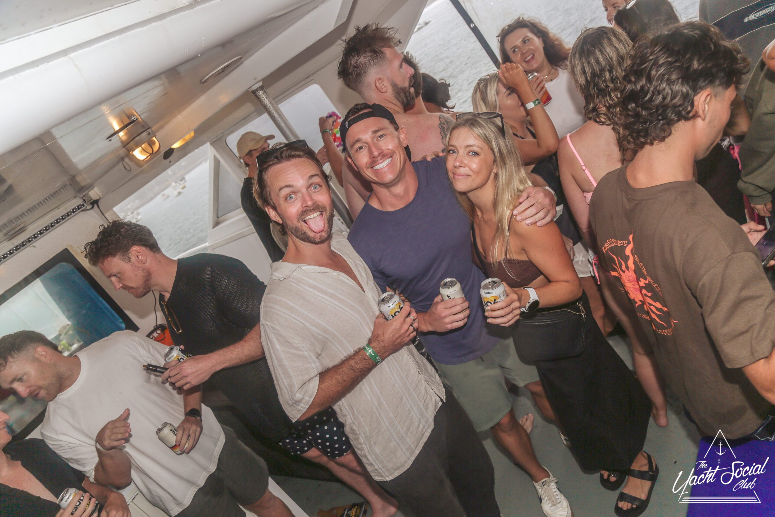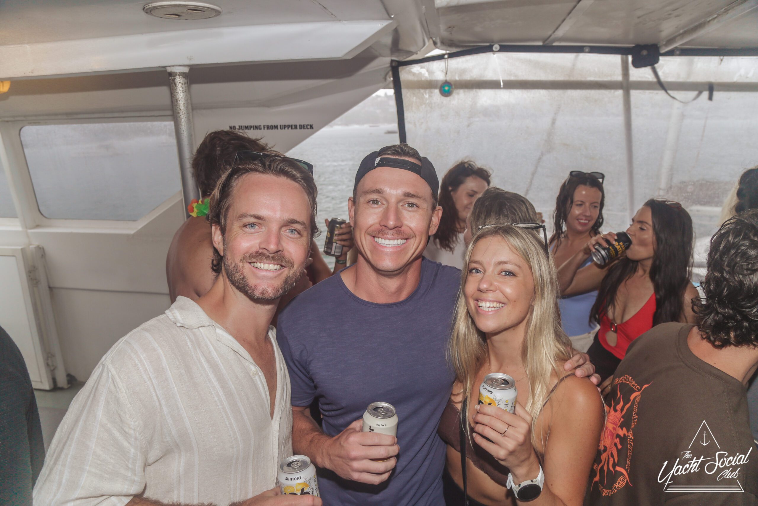 A group of people on a boat at a lively social event. Three people in the center smile and pose for the camera, holding canned drinks, while others chat and socialize in the background.