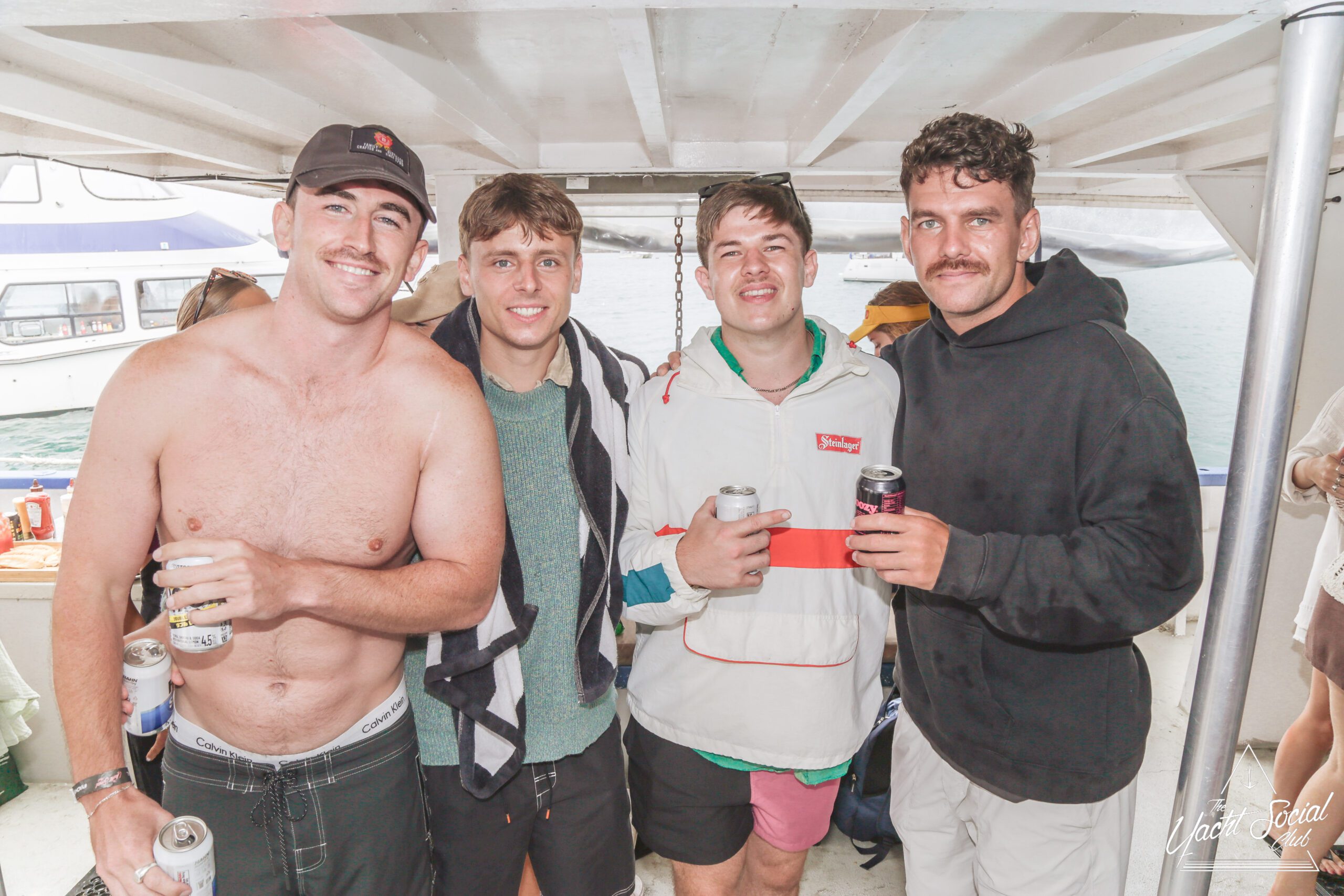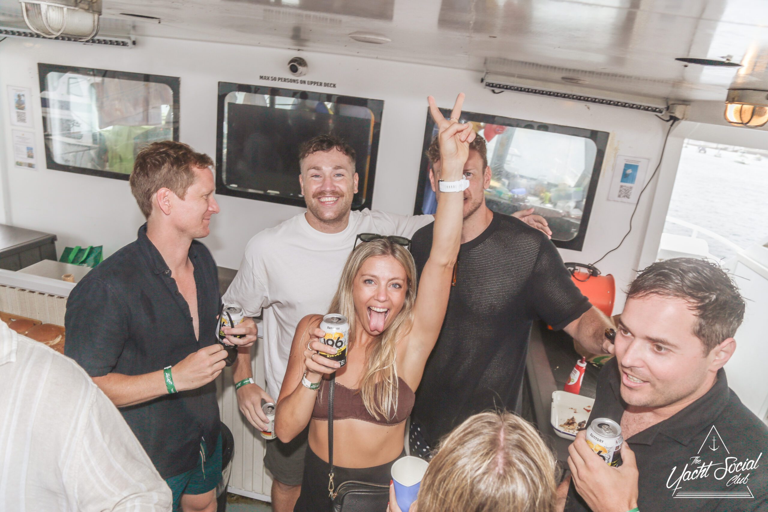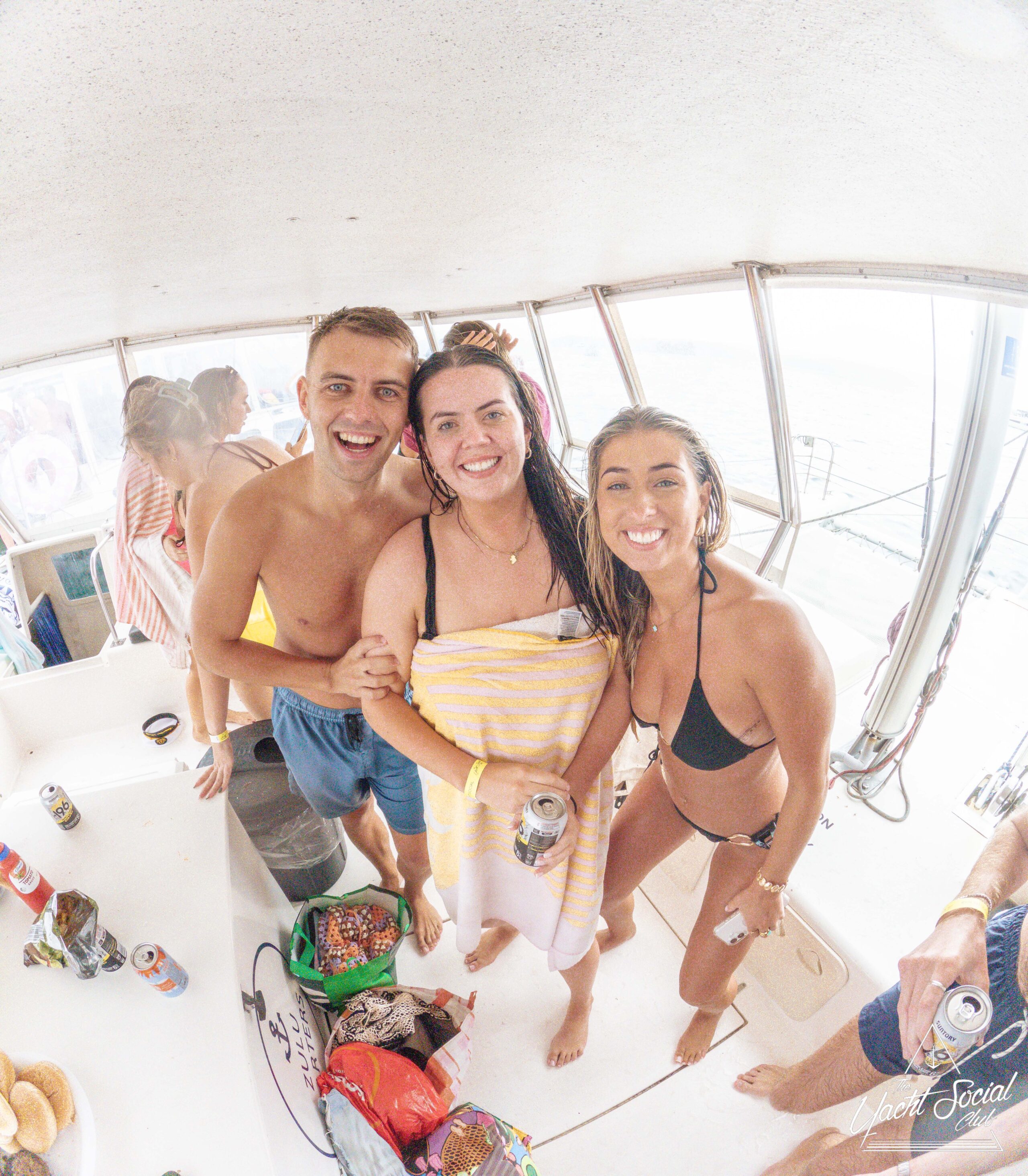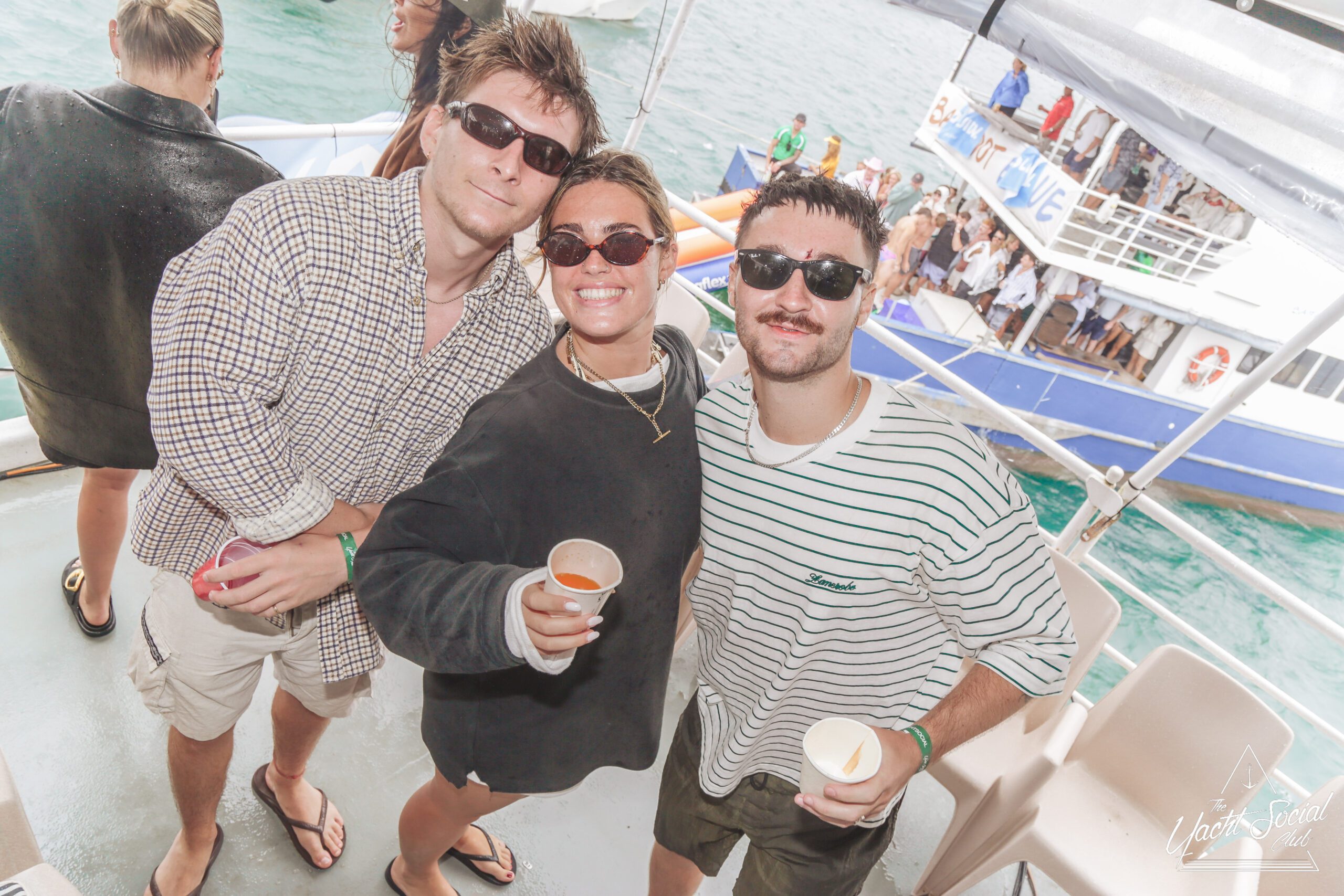 A group of people on a boat at a lively social event. Three people in the center smile and pose for the camera, holding canned drinks, while others chat and socialize in the background.