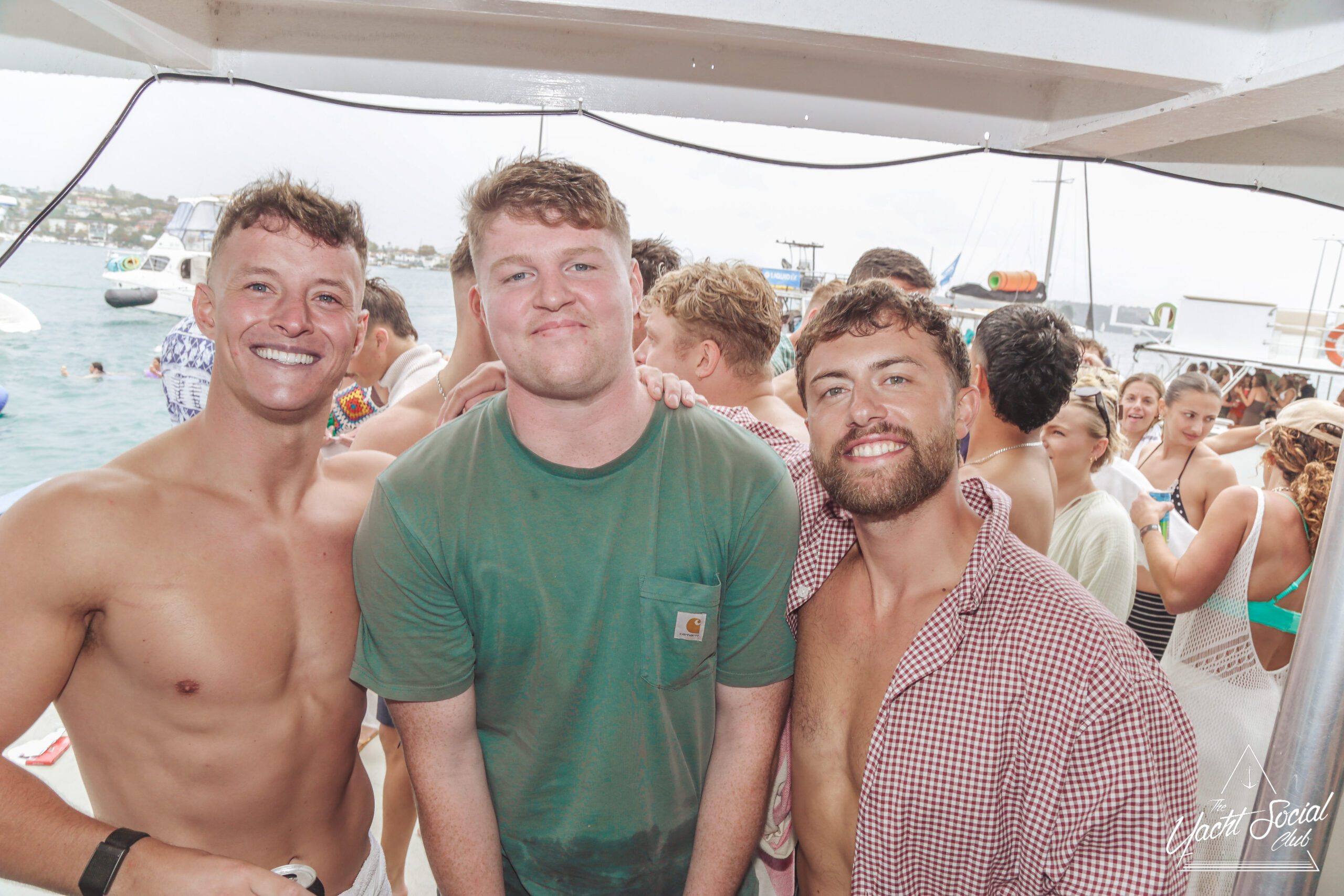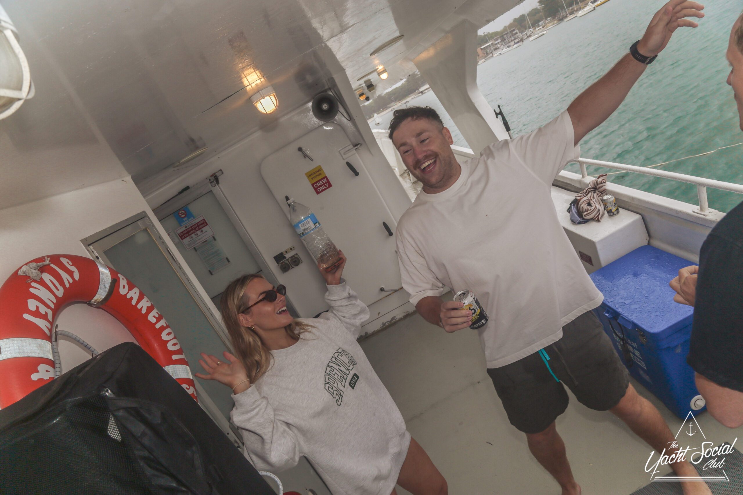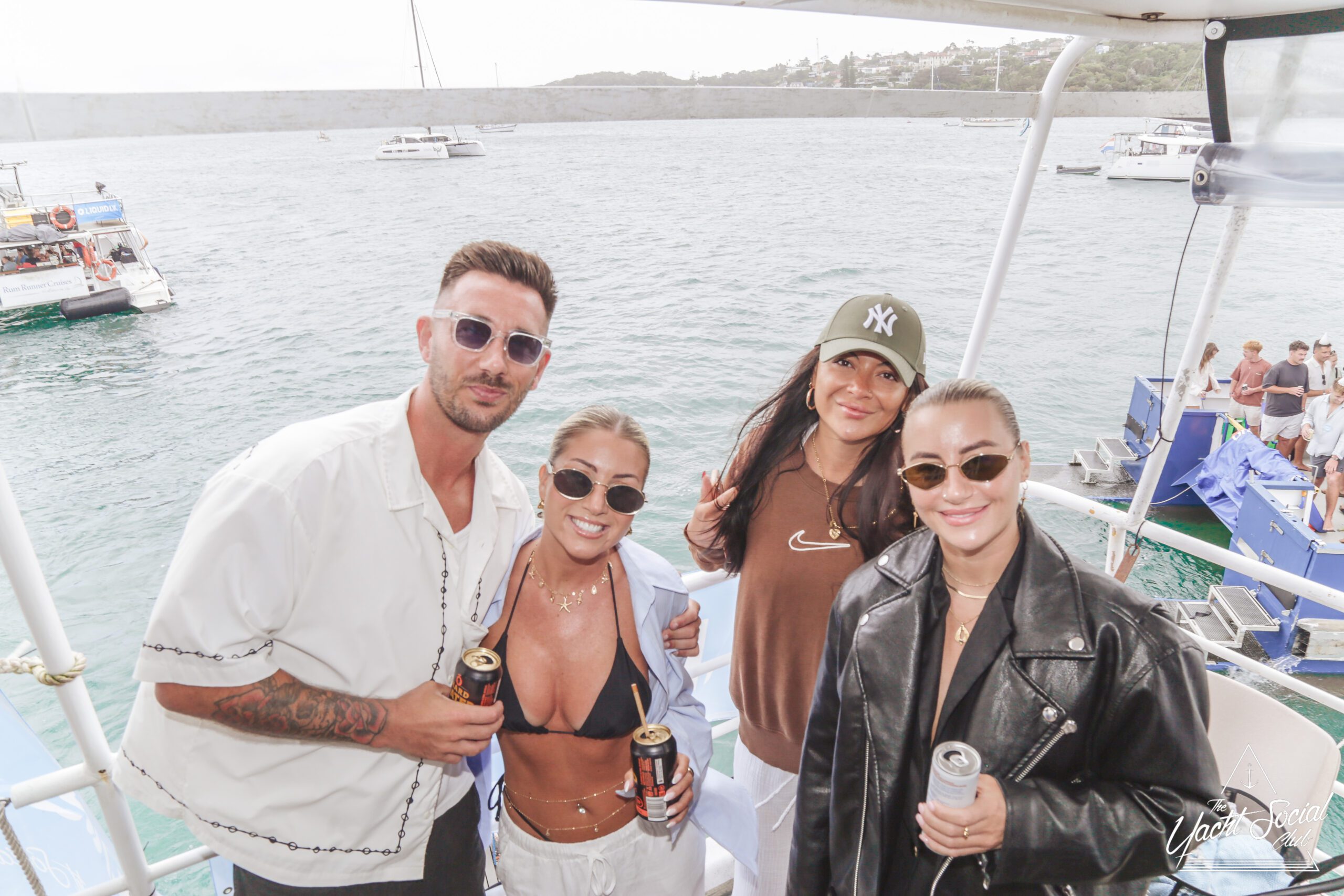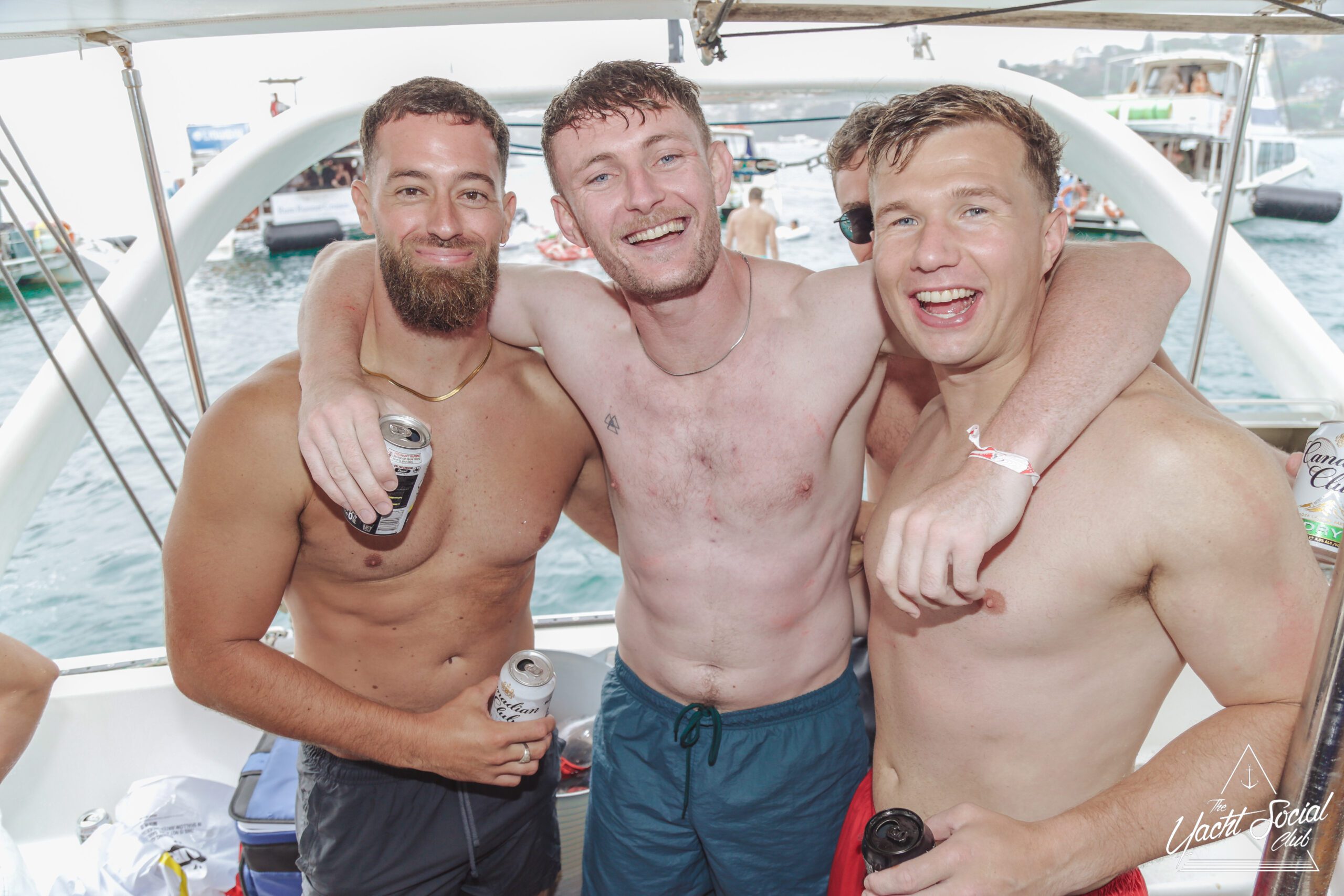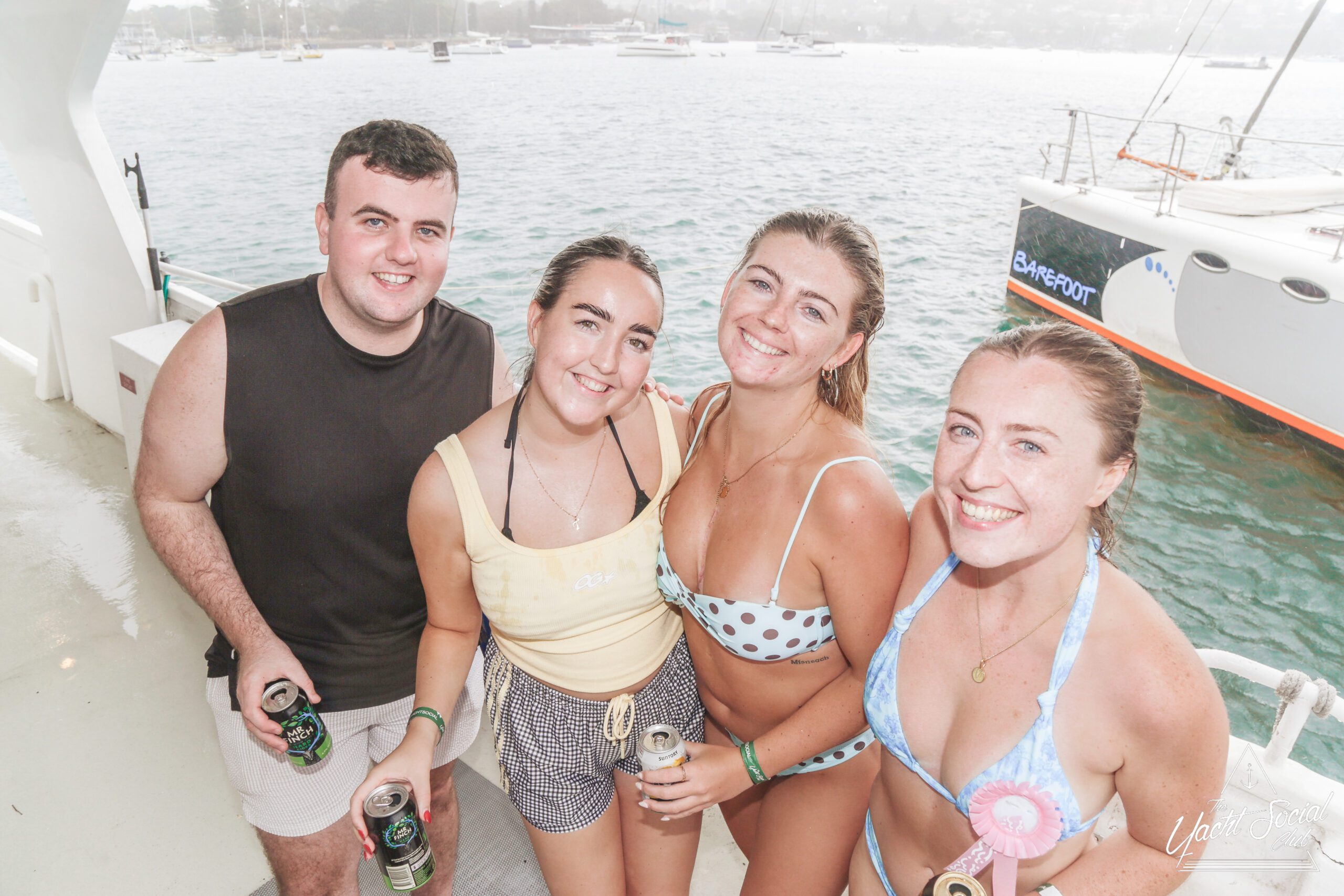 A group of people on a boat at a lively social event. Three people in the center smile and pose for the camera, holding canned drinks, while others chat and socialize in the background.