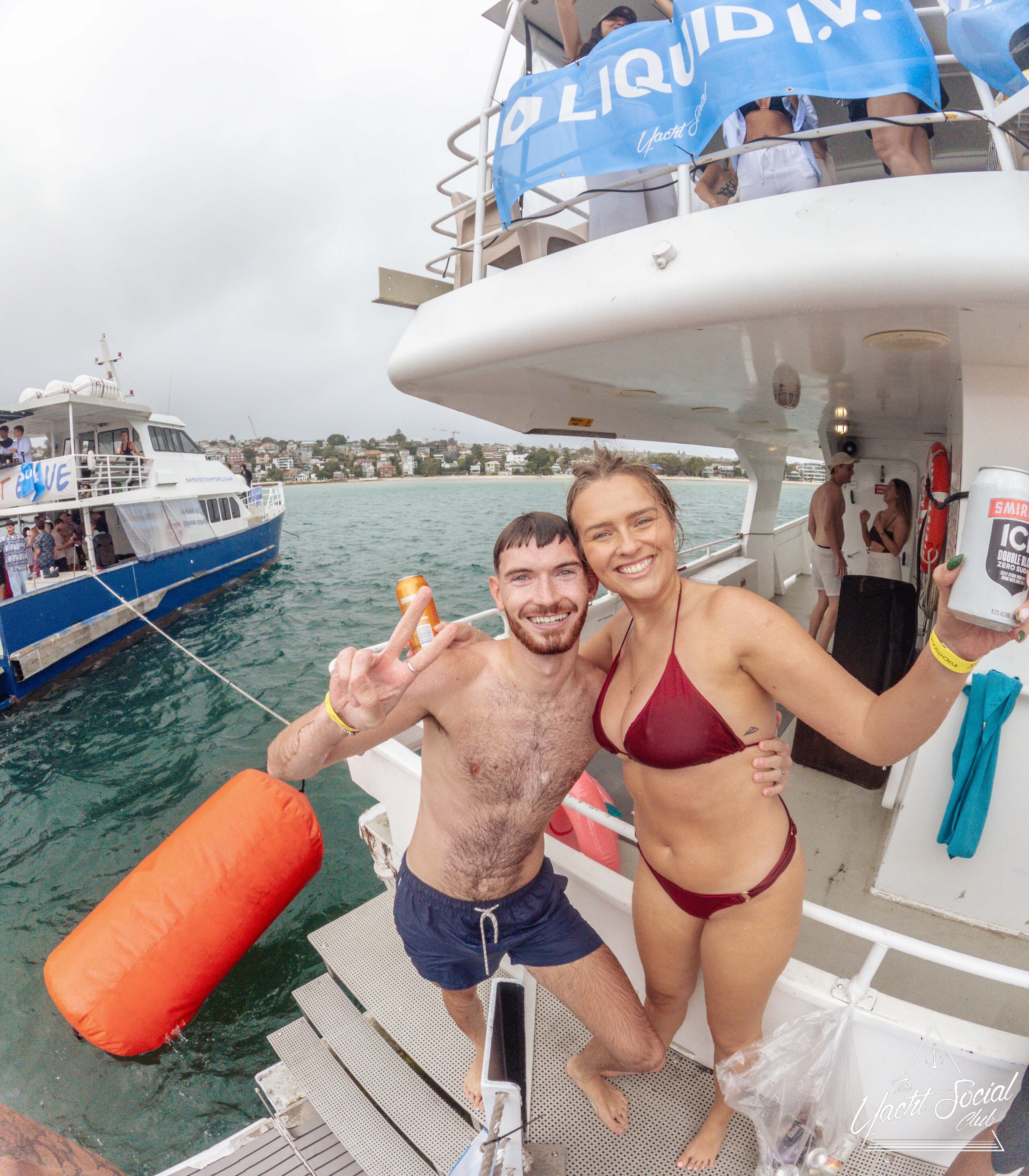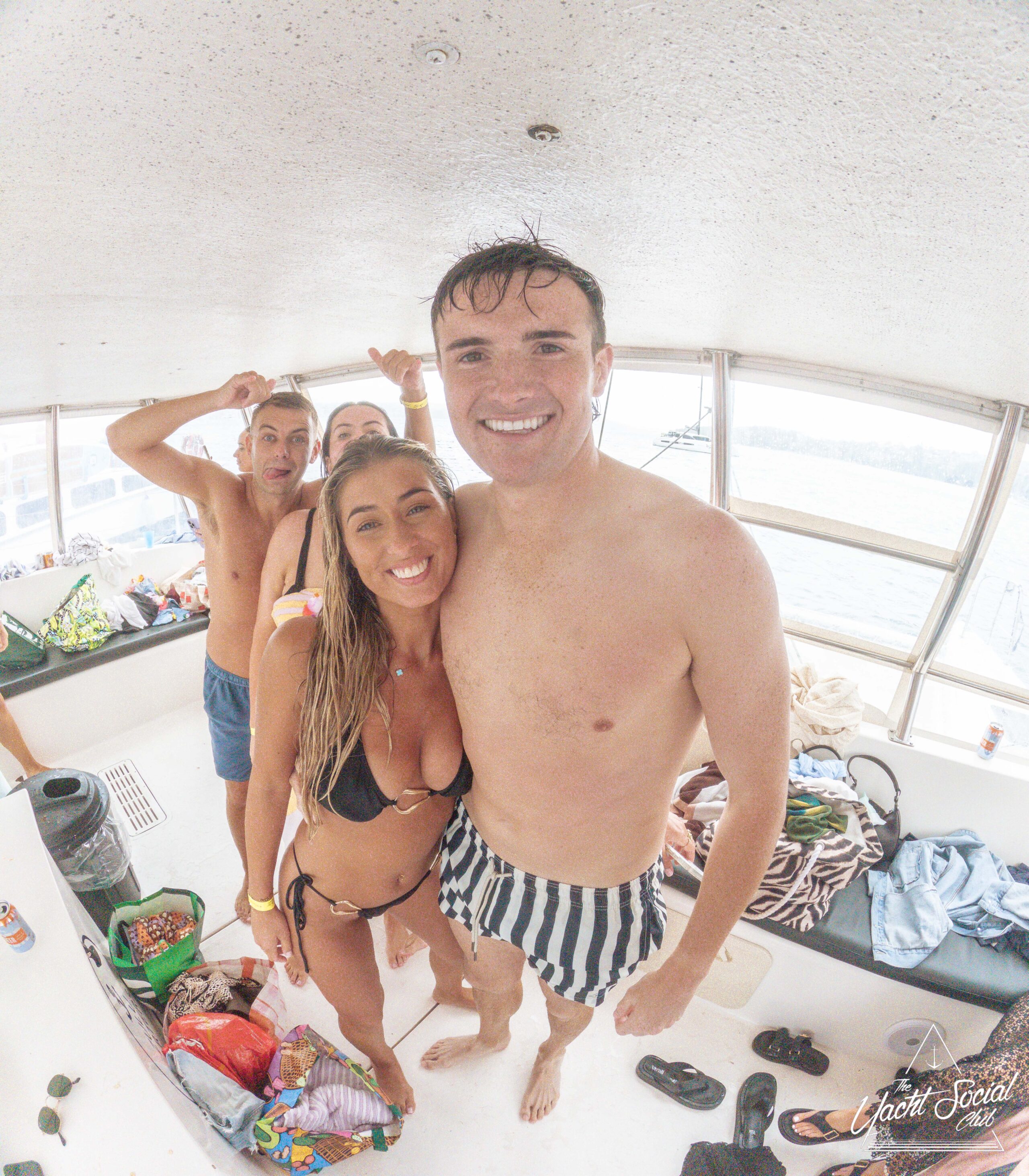 Two people pose confidently at a boat party, one woman in a white top and shorts raising her arm and smiling, and a shirtless man with sunglasses on his head standing next to her. Other guests and boats are visible in the background.