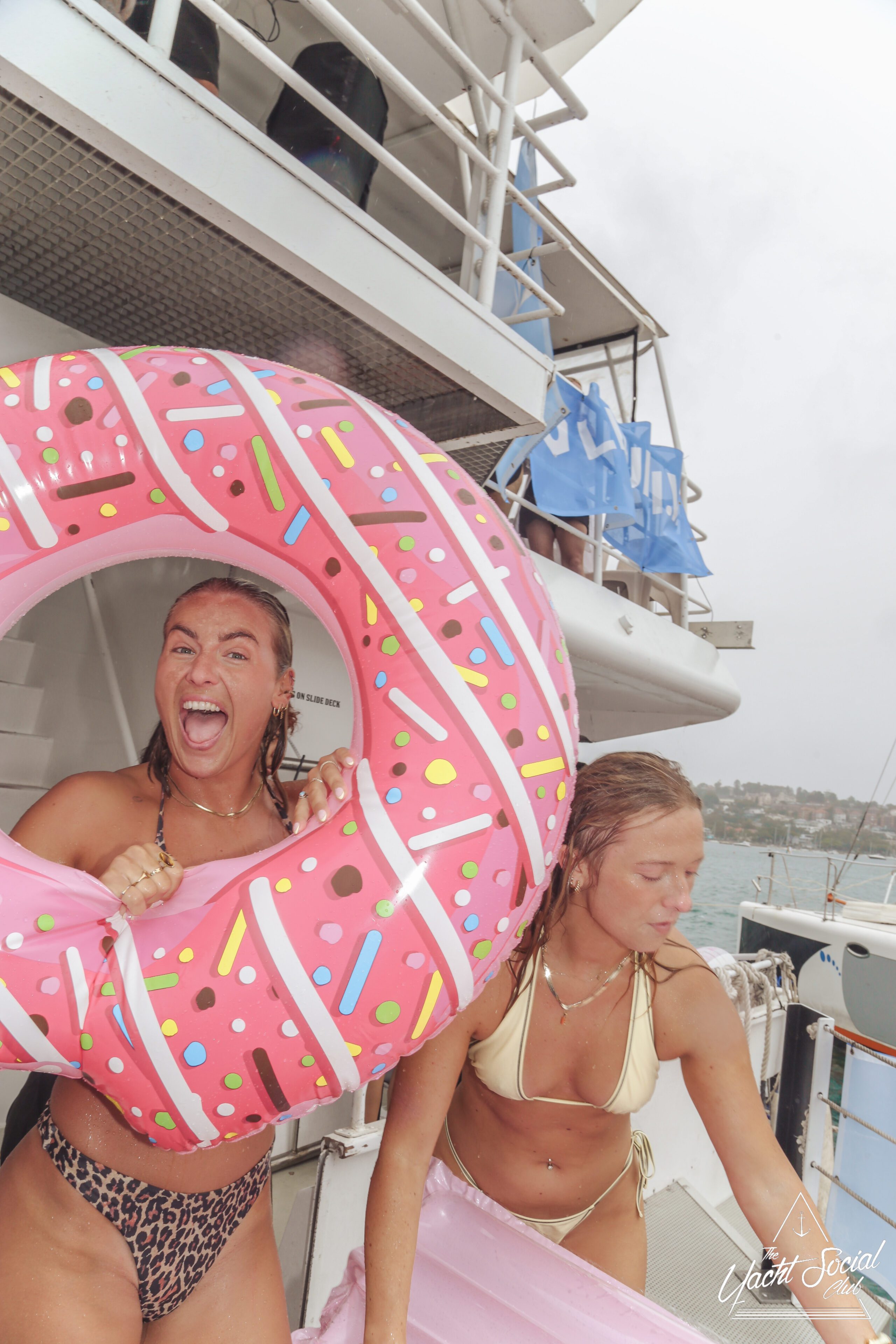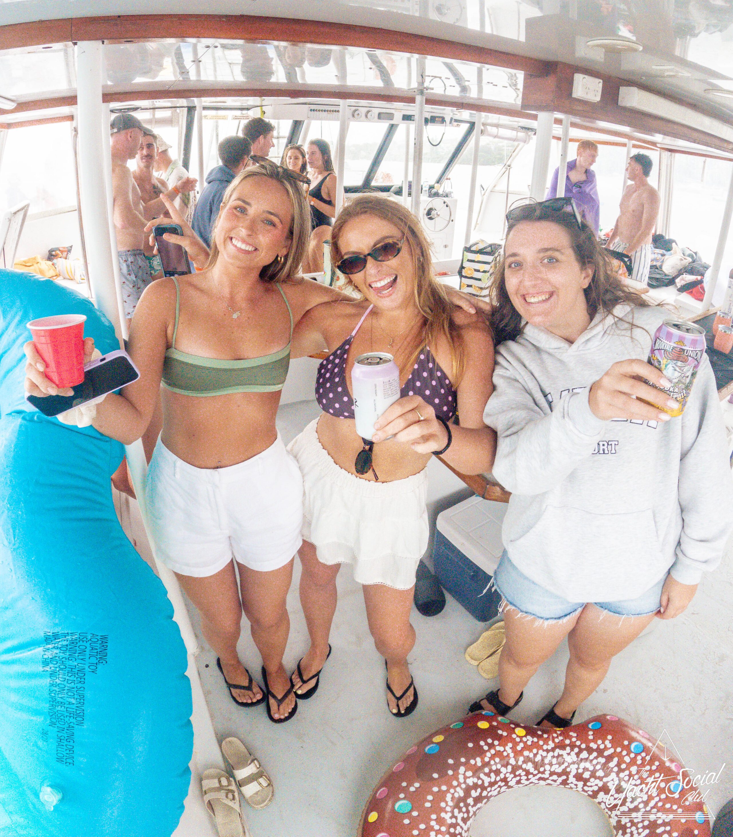 Three women smiling and holding drinks on a boat, surrounded by pool floats and other people enjoying a lively party atmosphere.