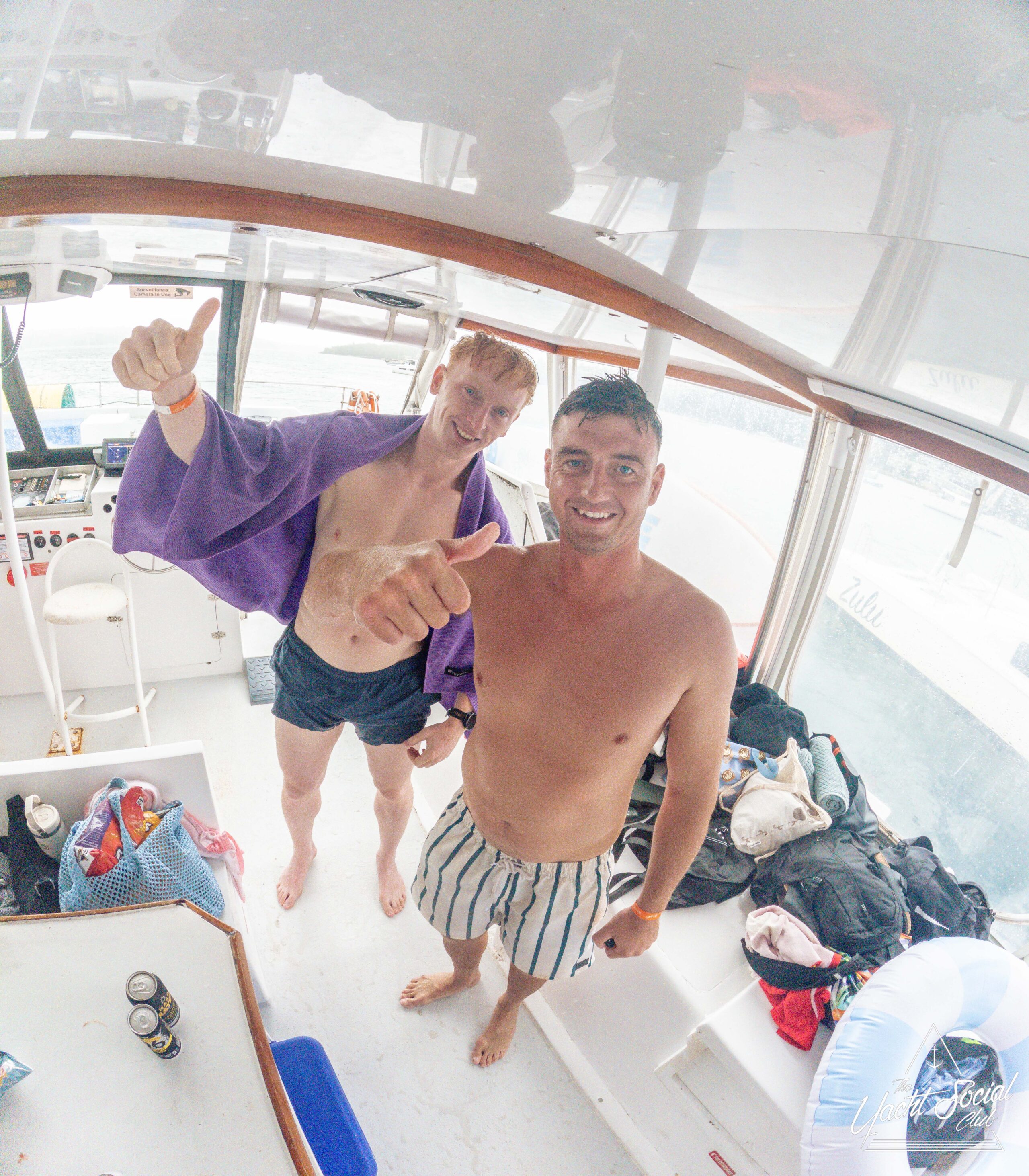 Two smiling men in swim trunks stand on a boat, giving thumbs up. The man on the left has light hair and wears a purple towel, while the man on the right has dark hair and striped shorts. The boat interior is bright and beach gear is visible.
