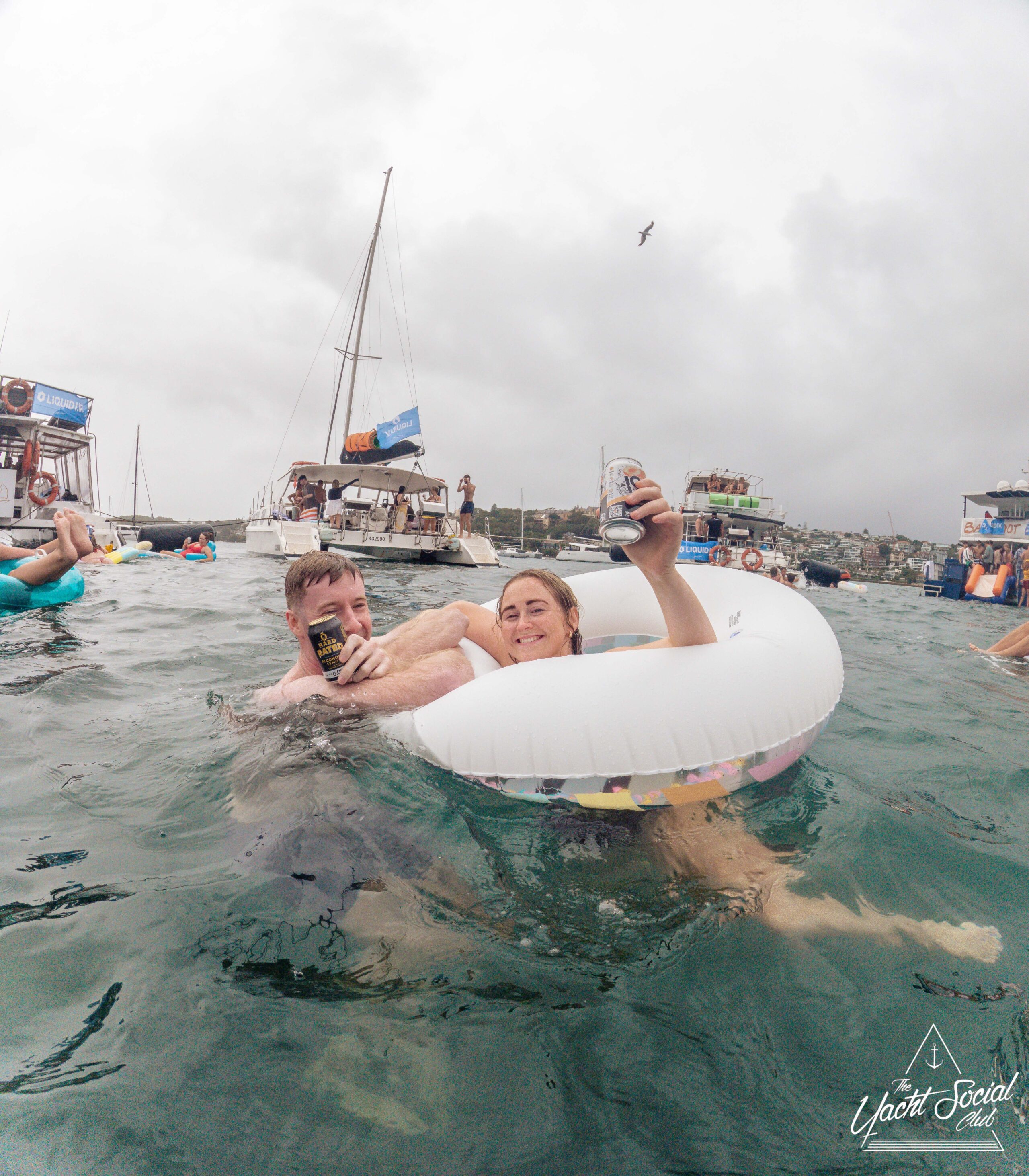 Two people relax in the ocean, smiling and holding drinks. One lounges in a white inflatable ring, while the other leans on it. Boats and other people are visible in the background under a cloudy sky.