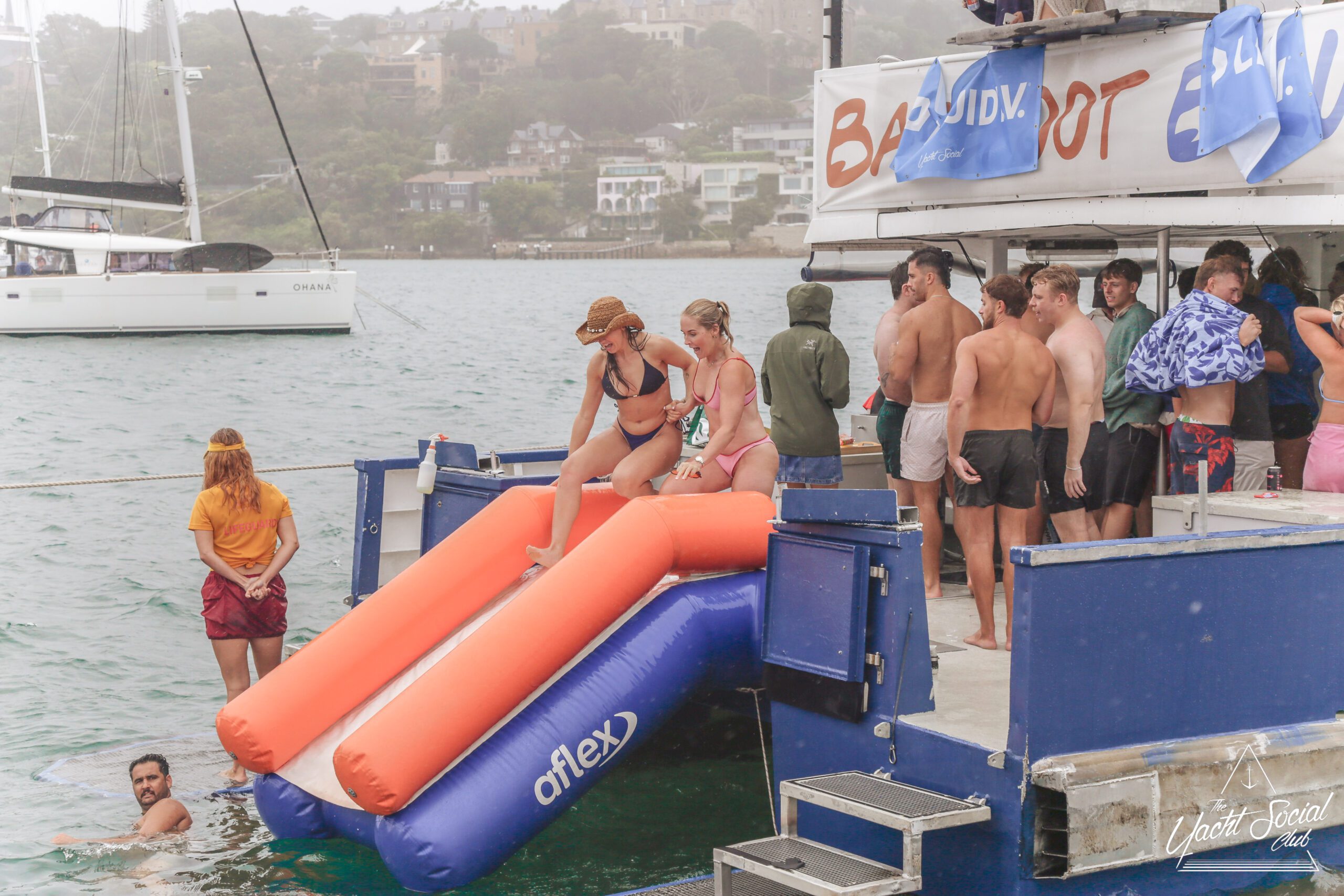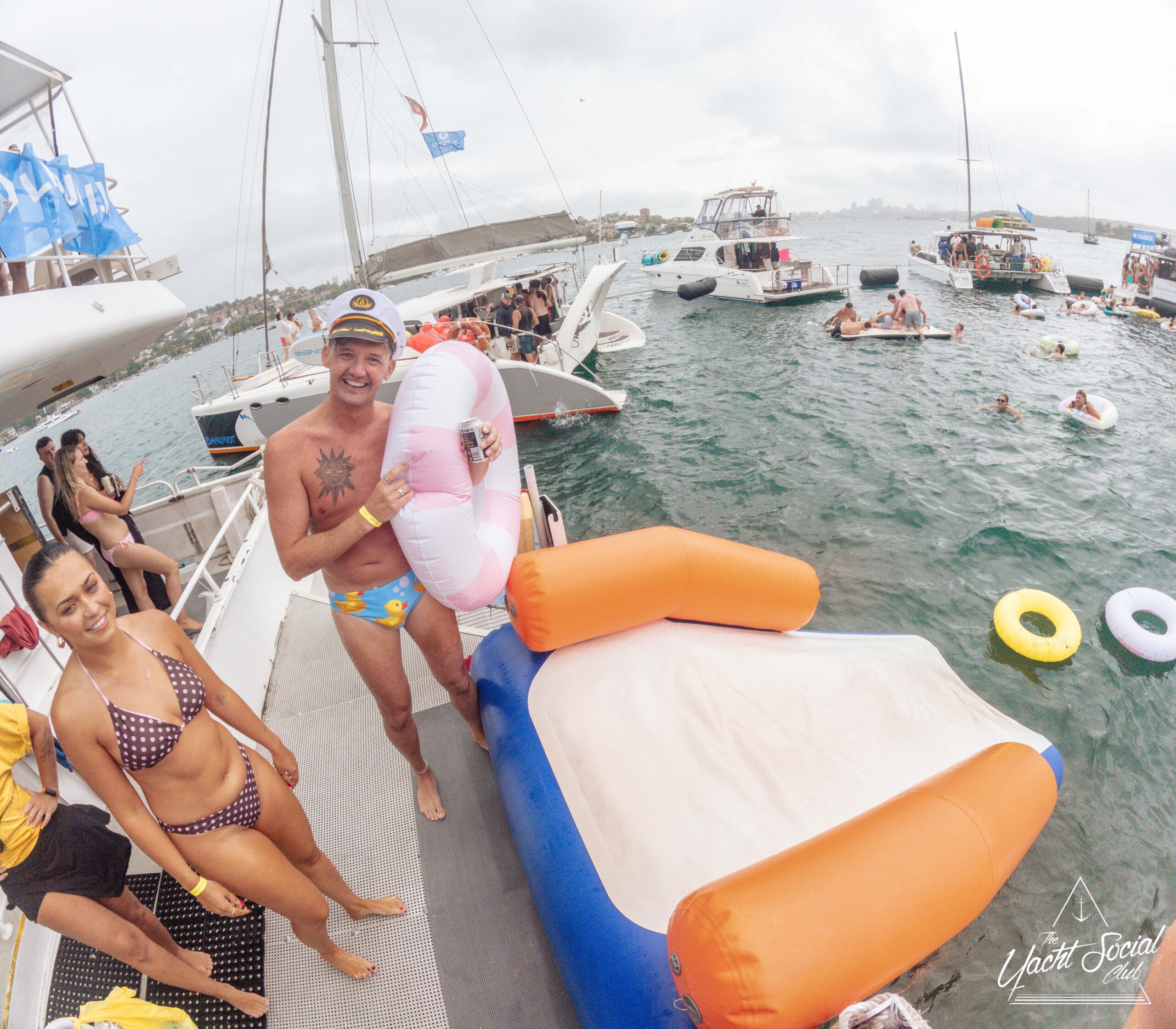 People on a boat enjoy a party with inflatables and swimwear; a man in patterned swim trunks holds a donut float and stands by an inflatable slide, with other boats and swimmers in the water nearby.