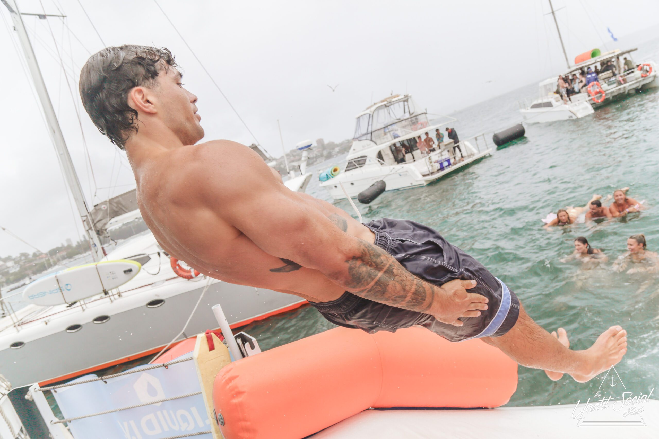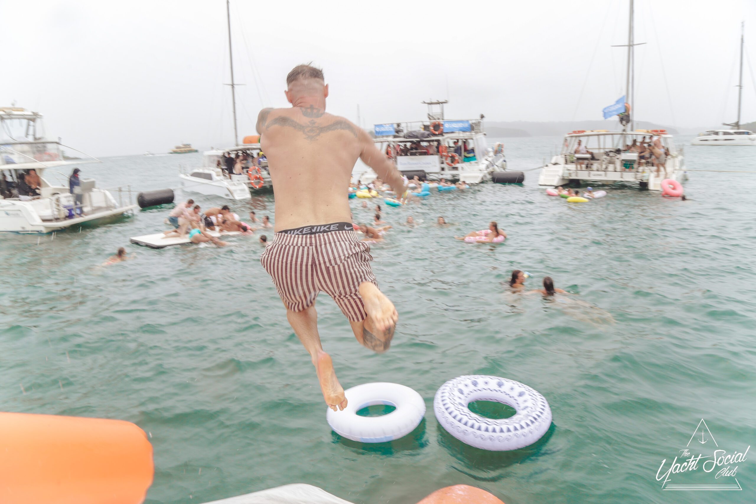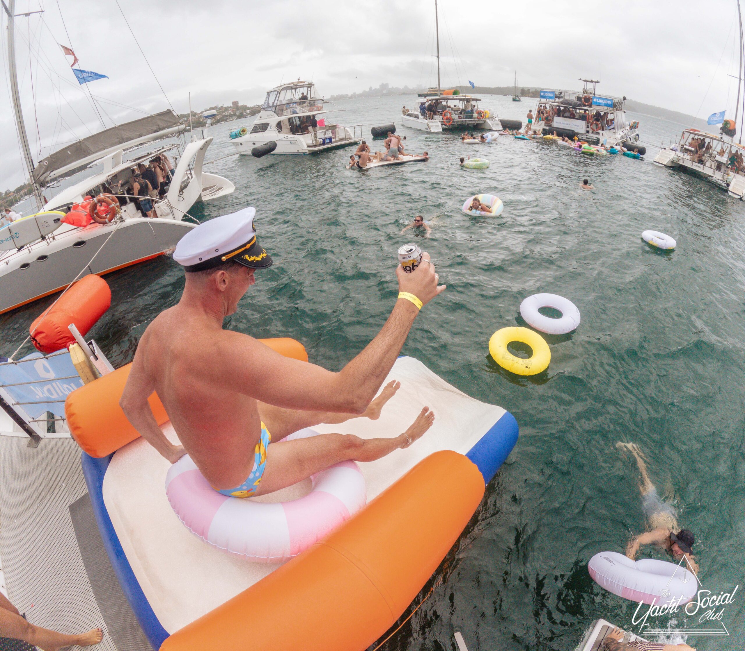 A man in a captain’s hat sits on an inflatable float with a drink, about to slide into the water at a lively boat party. People swim and relax on floats, with several boats anchored nearby.