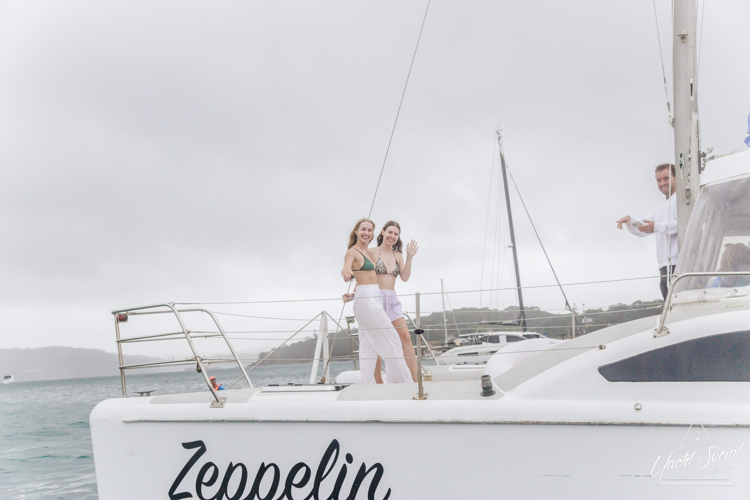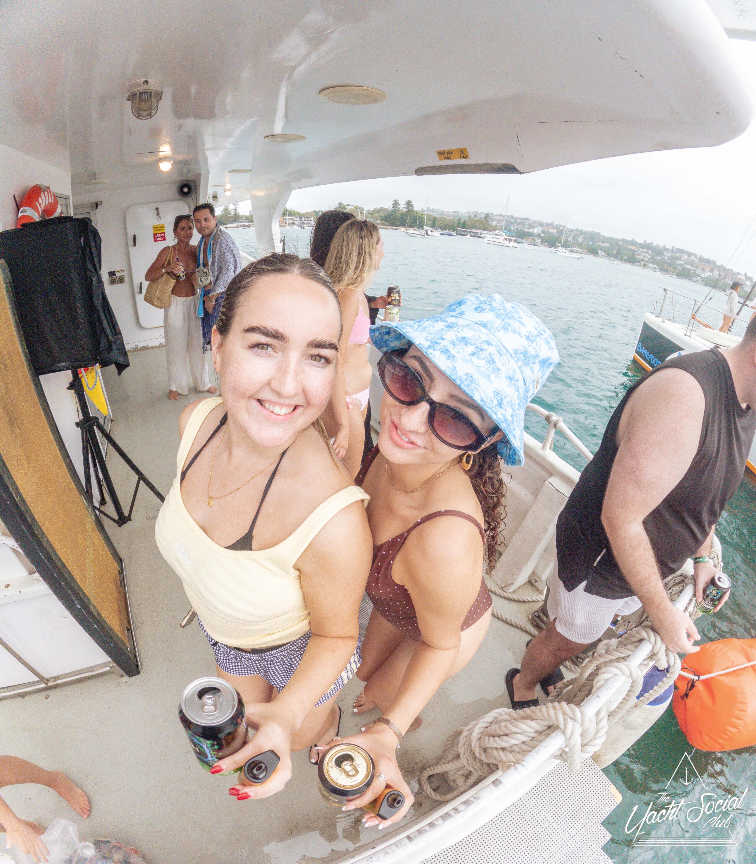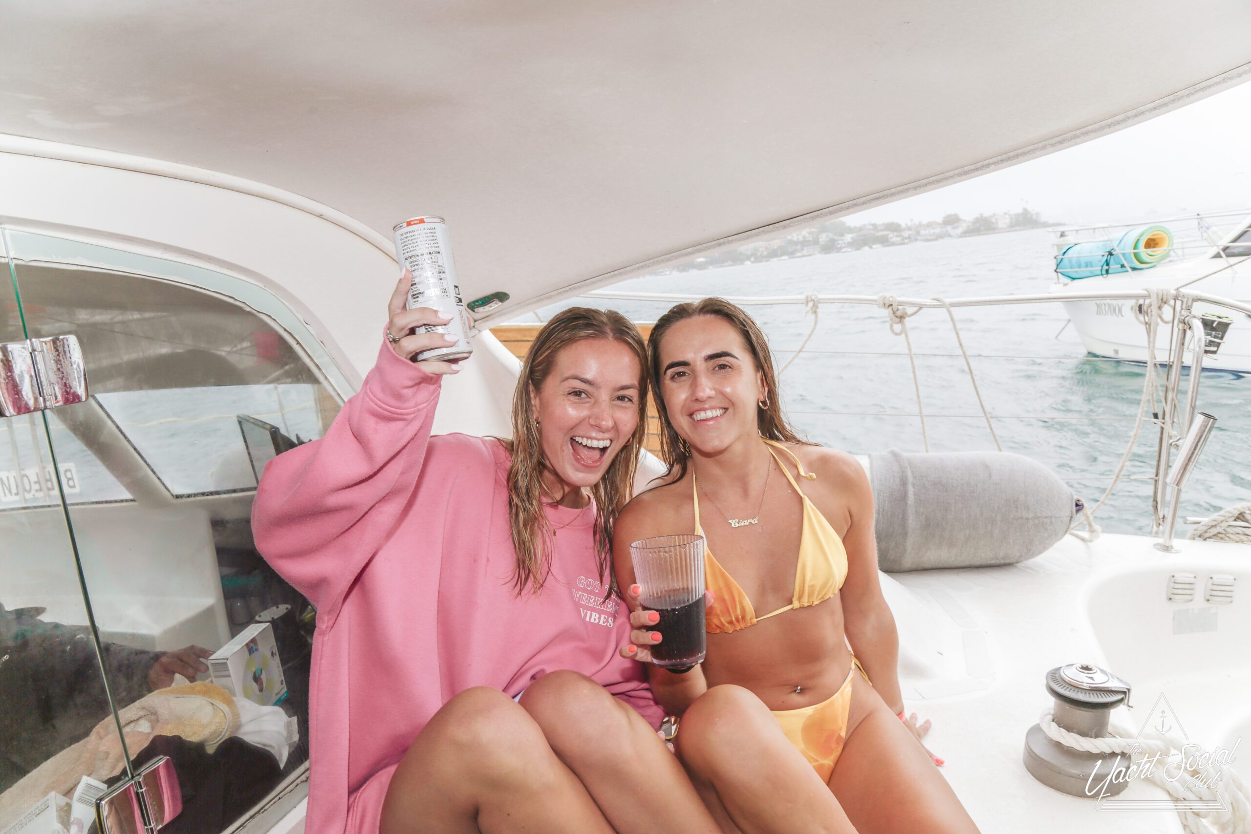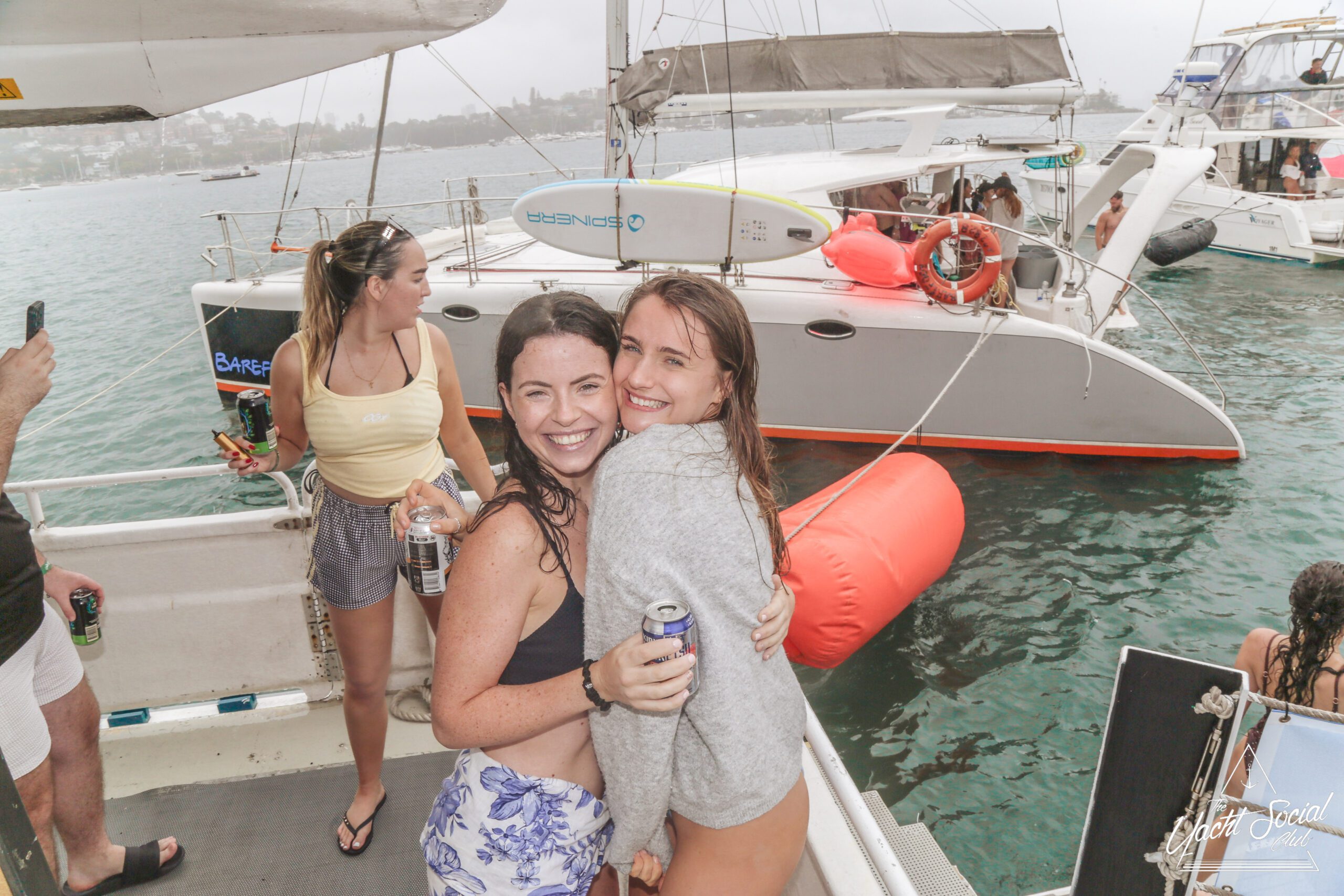 Two young women hug and smile at the camera on a boat, holding drinks. Other people are around, and several boats are anchored nearby in the water on a cloudy day.