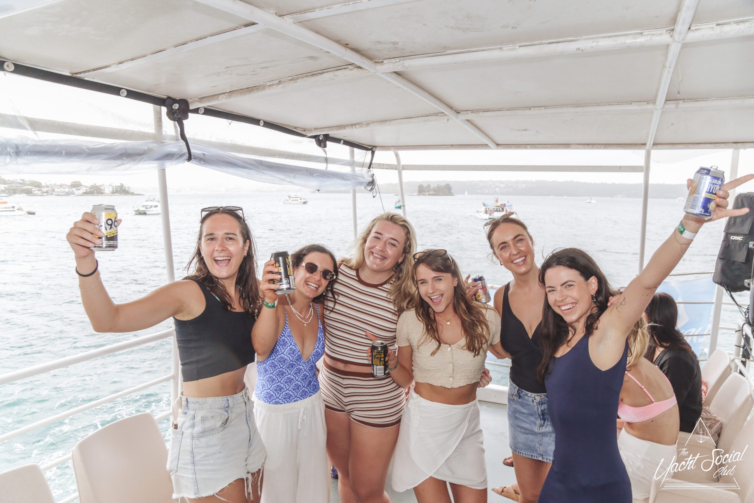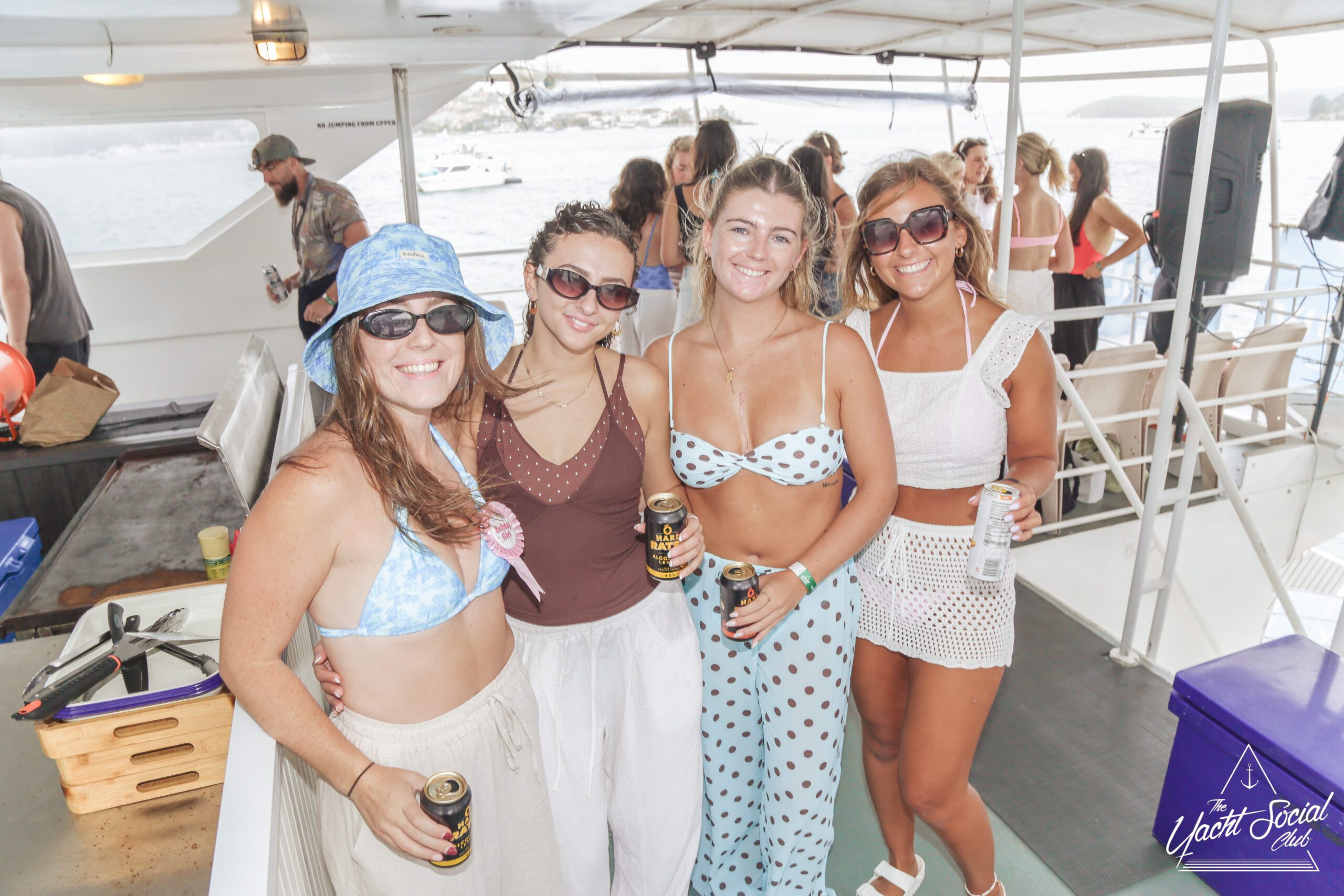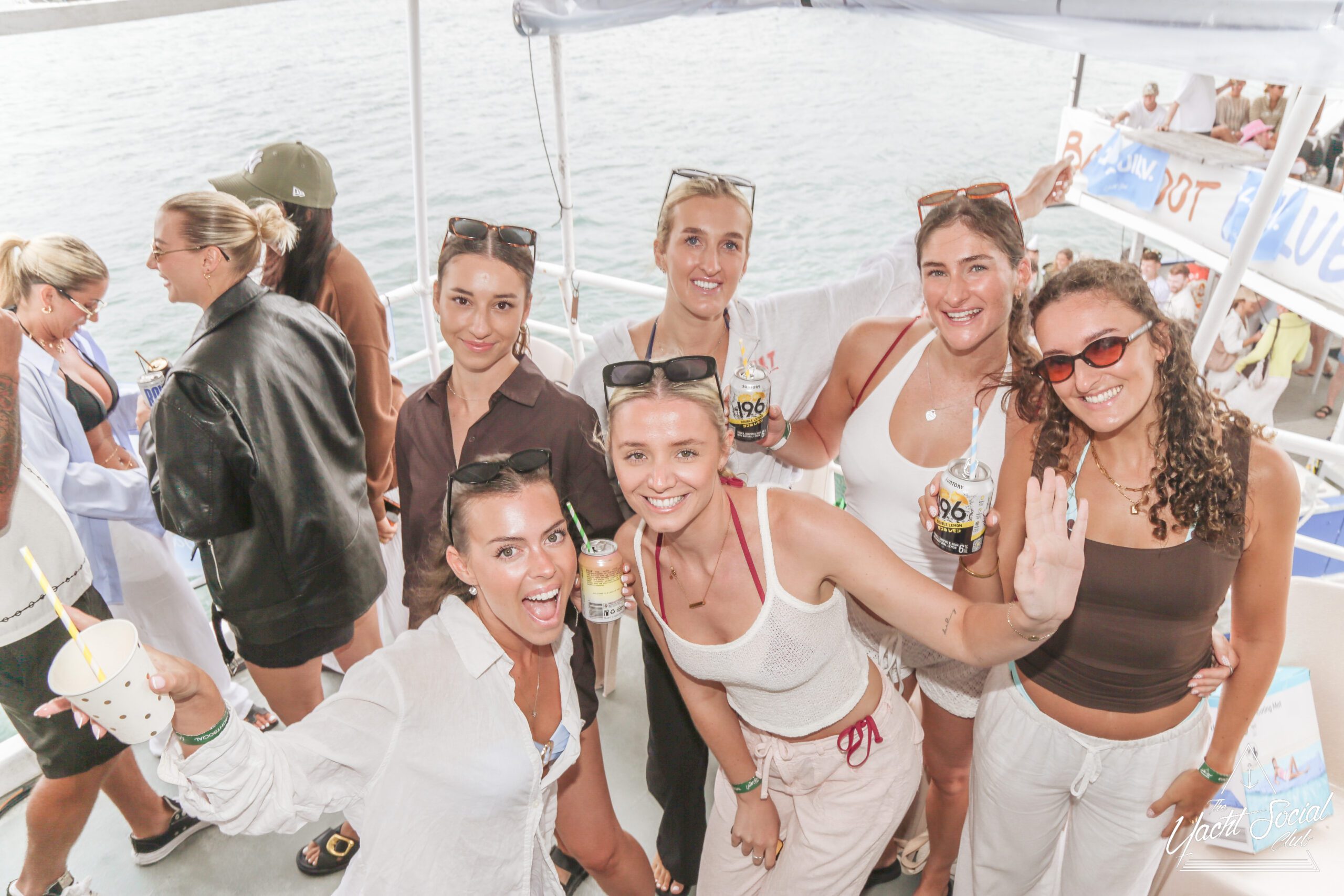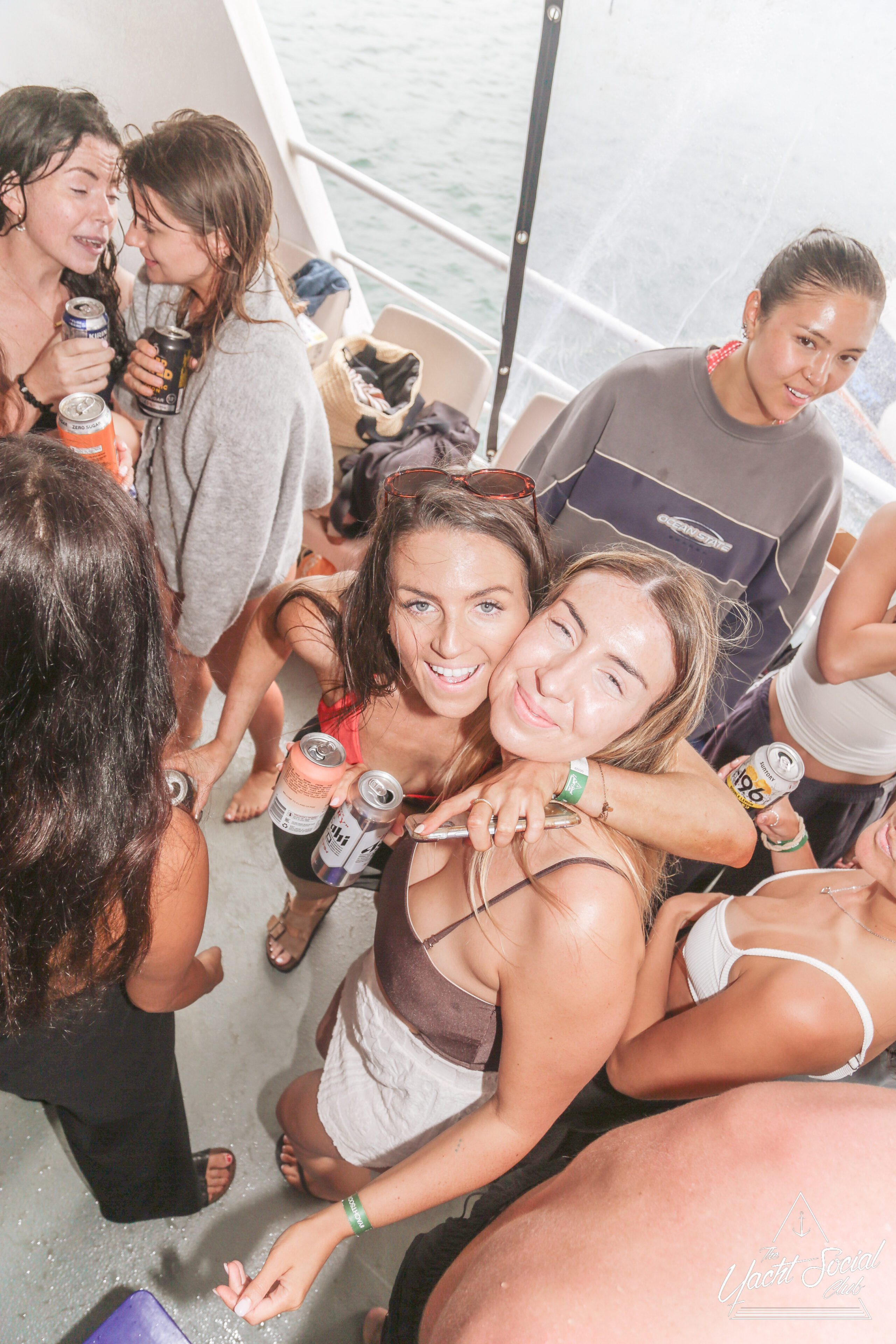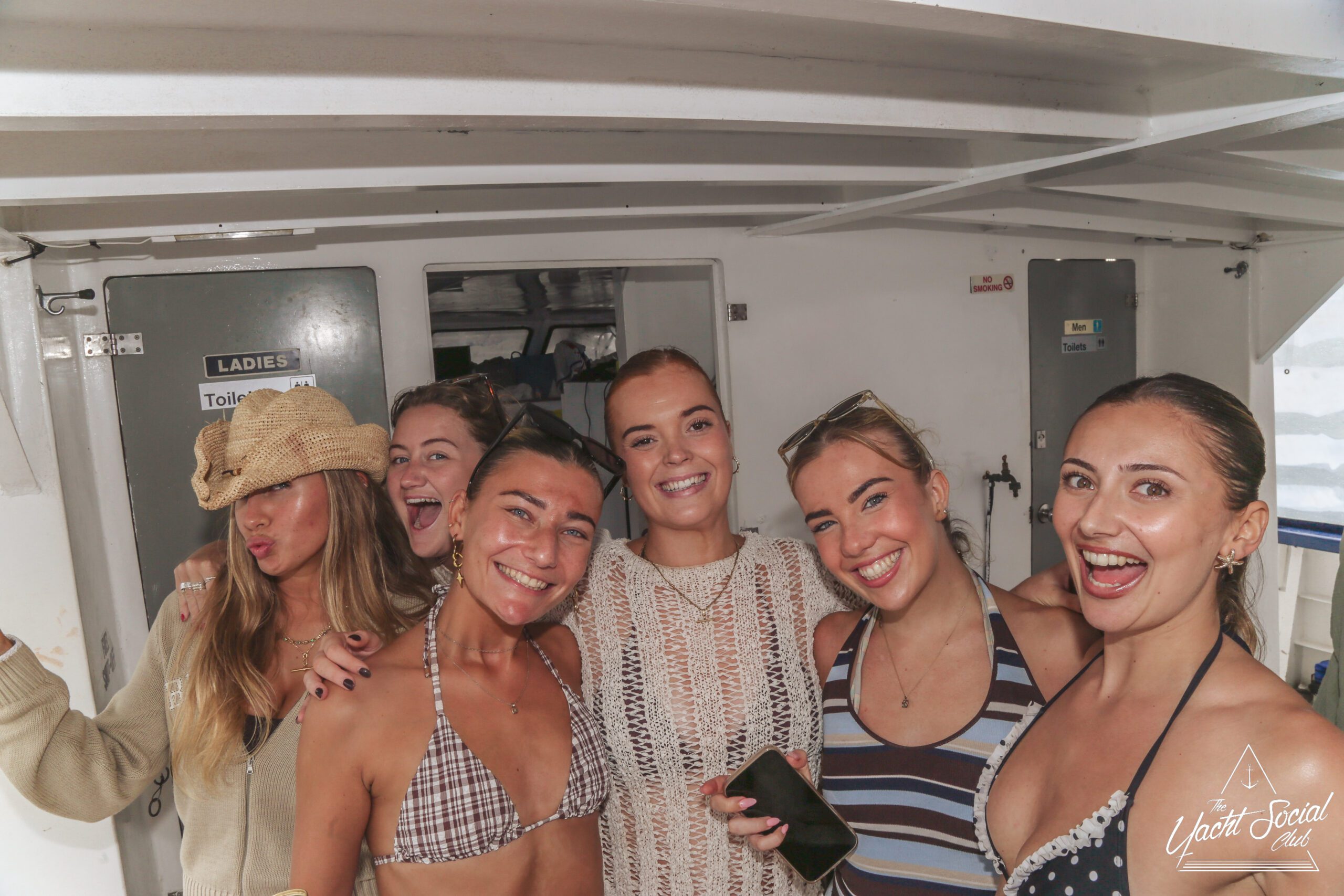 A group of young women, smiling and hugging, pose for a photo at a lively boat party. Some hold drinks and wear swimsuits, while others mingle in the background under a shaded deck. The mood is festive and joyful.