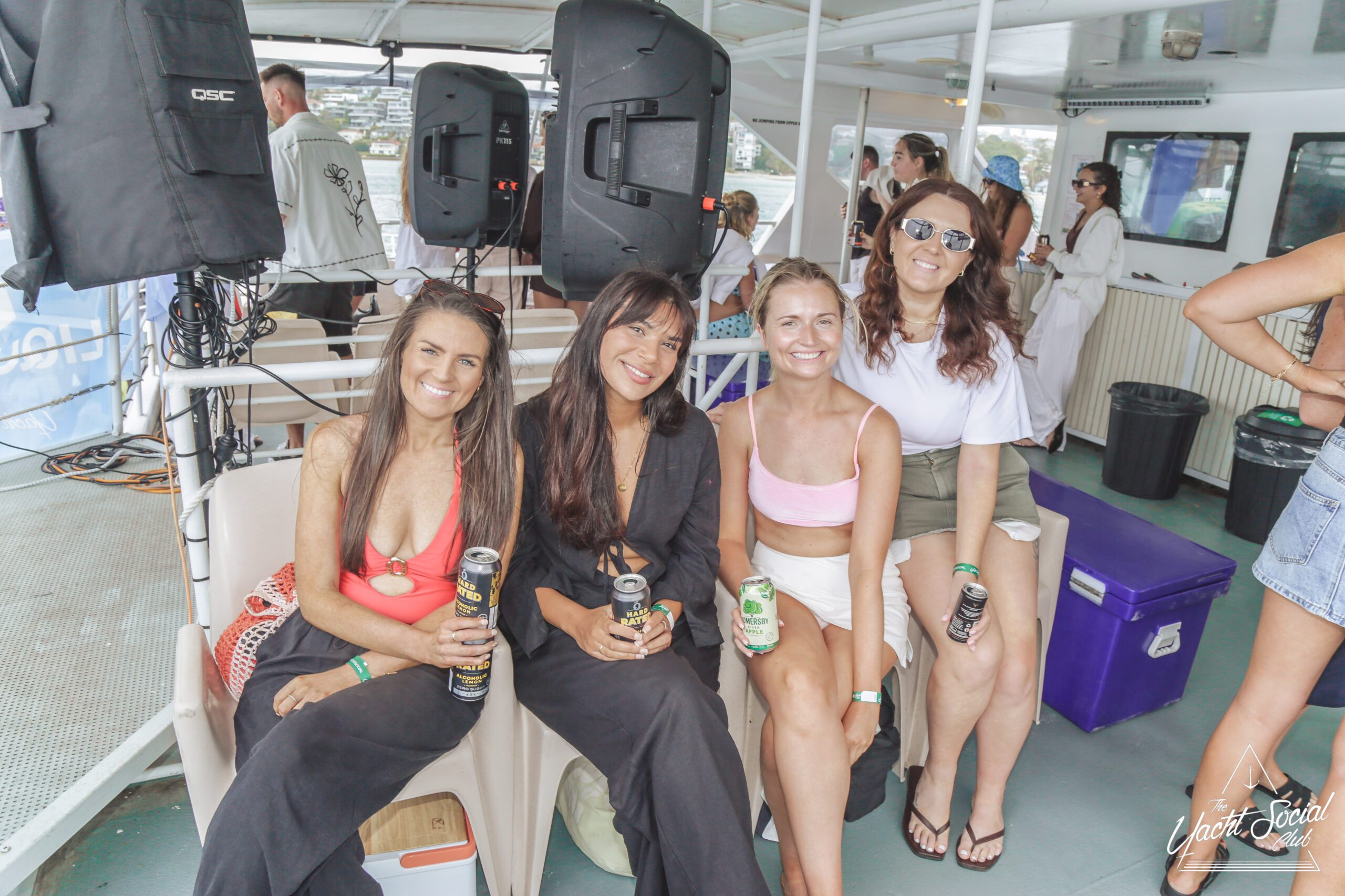 Four women sit smiling on a boat, holding drinks and wearing summer outfits. Two are in black dresses, one in a coral bikini top, and one in a white crop top. People and large speakers are in the background.