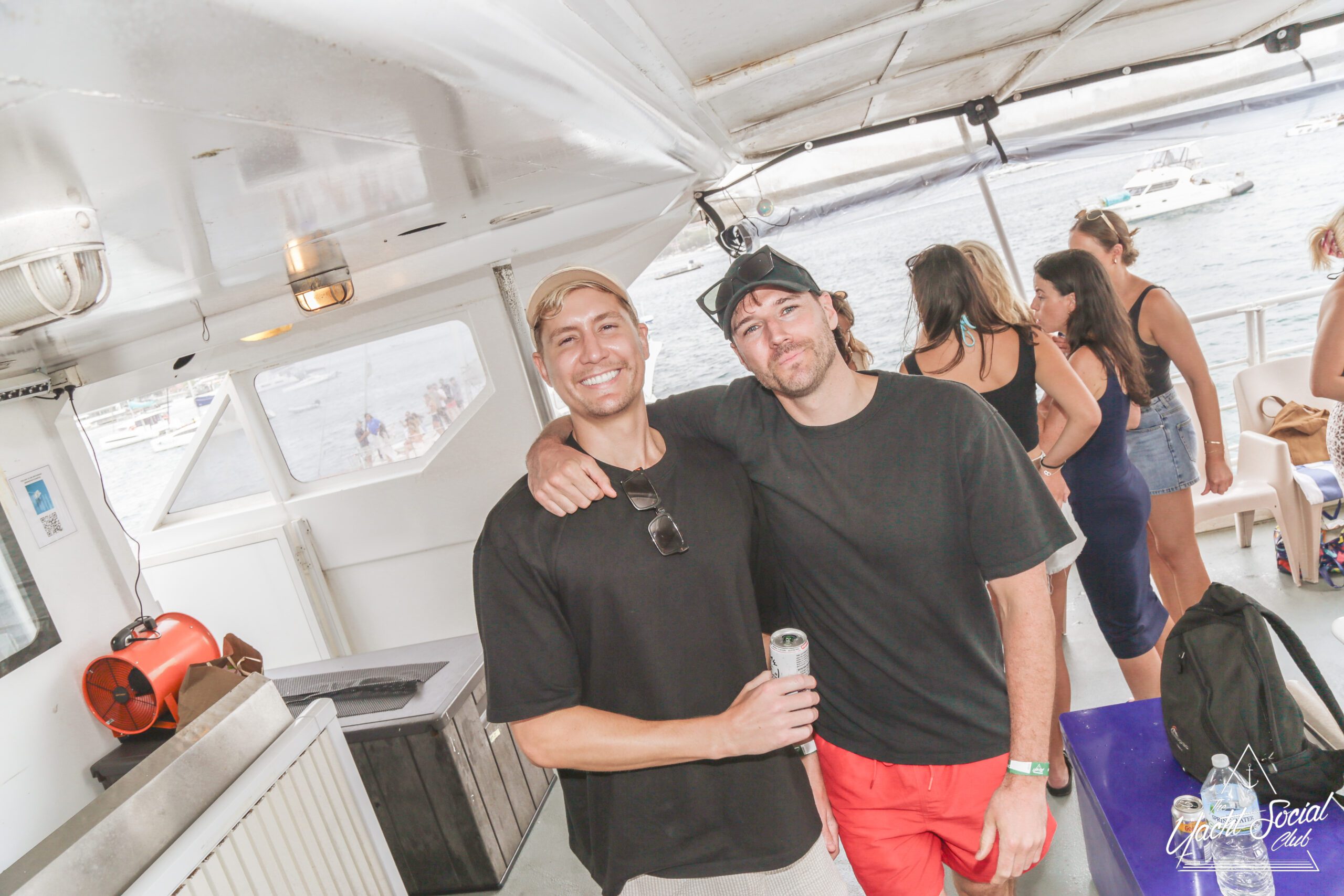 A group of people are enjoying a party on a boat. One man in sunglasses and a striped shirt raises his arm while holding a drink, with others around him smiling and talking. The ocean and other boats are visible in the background.