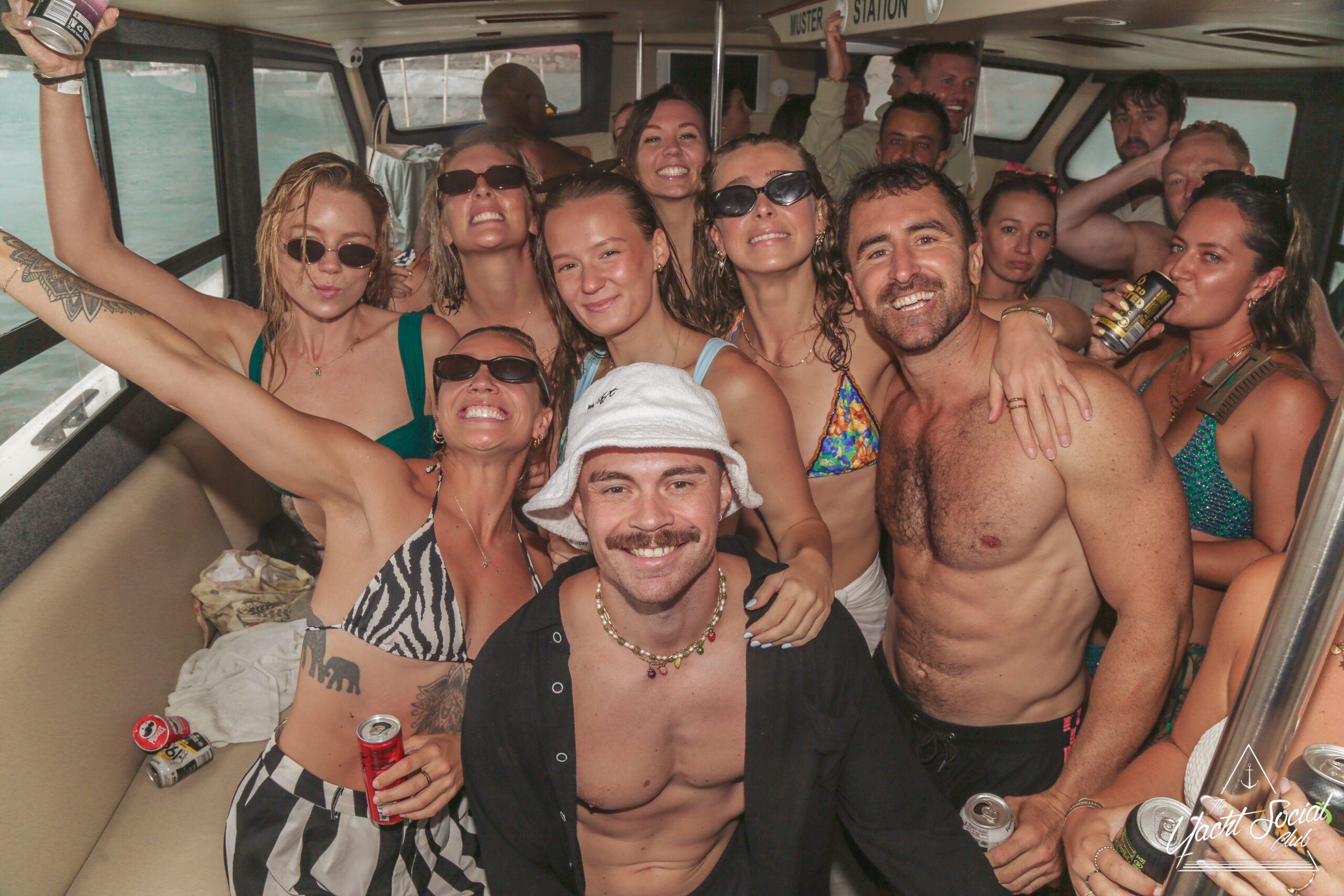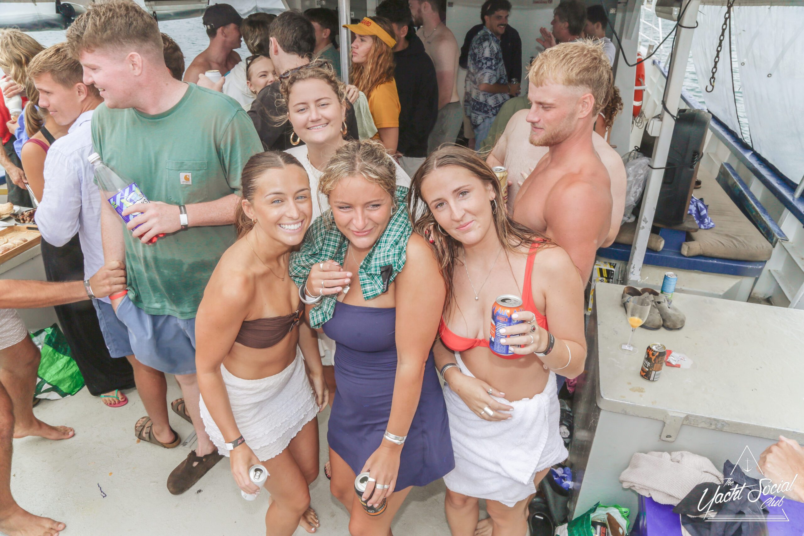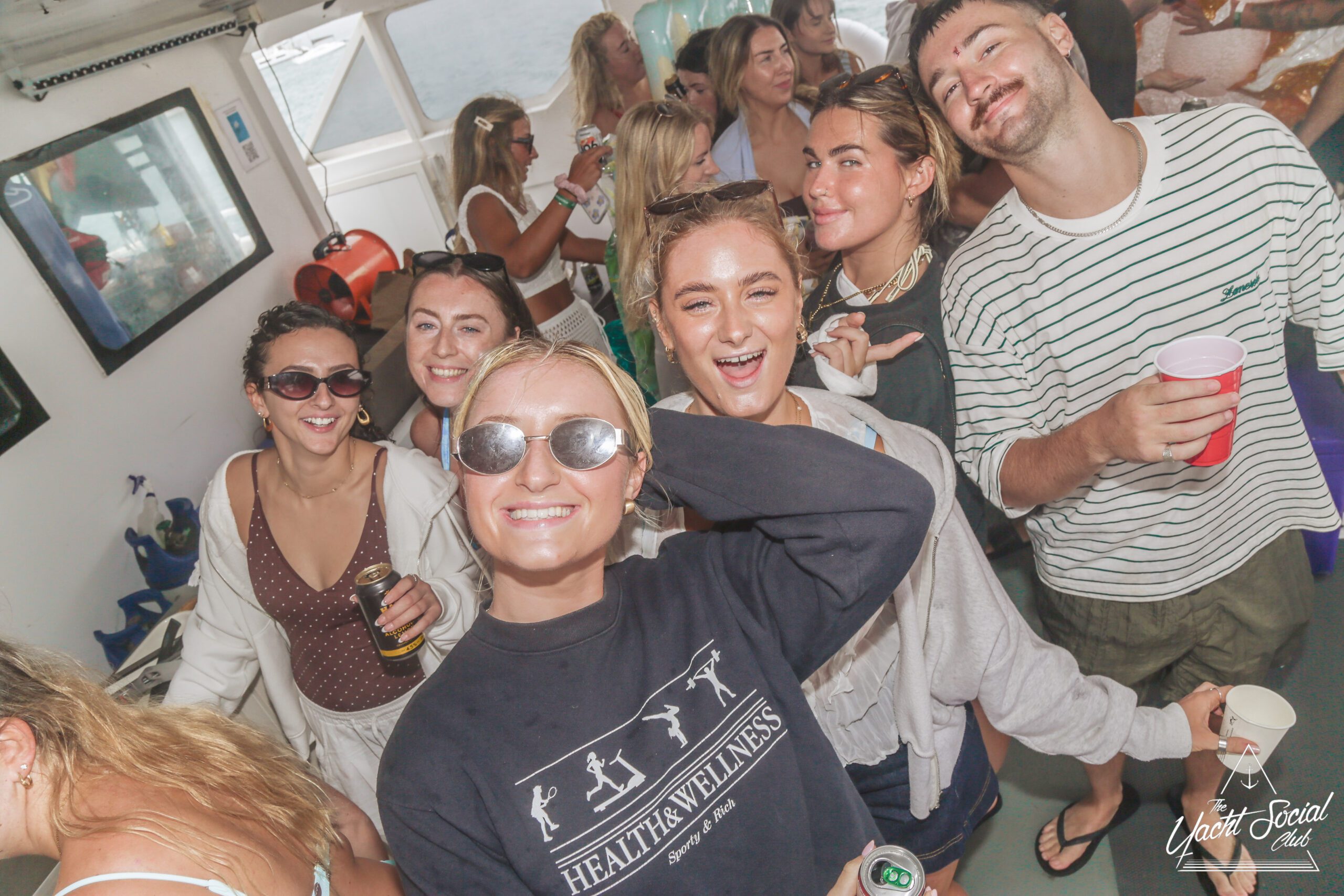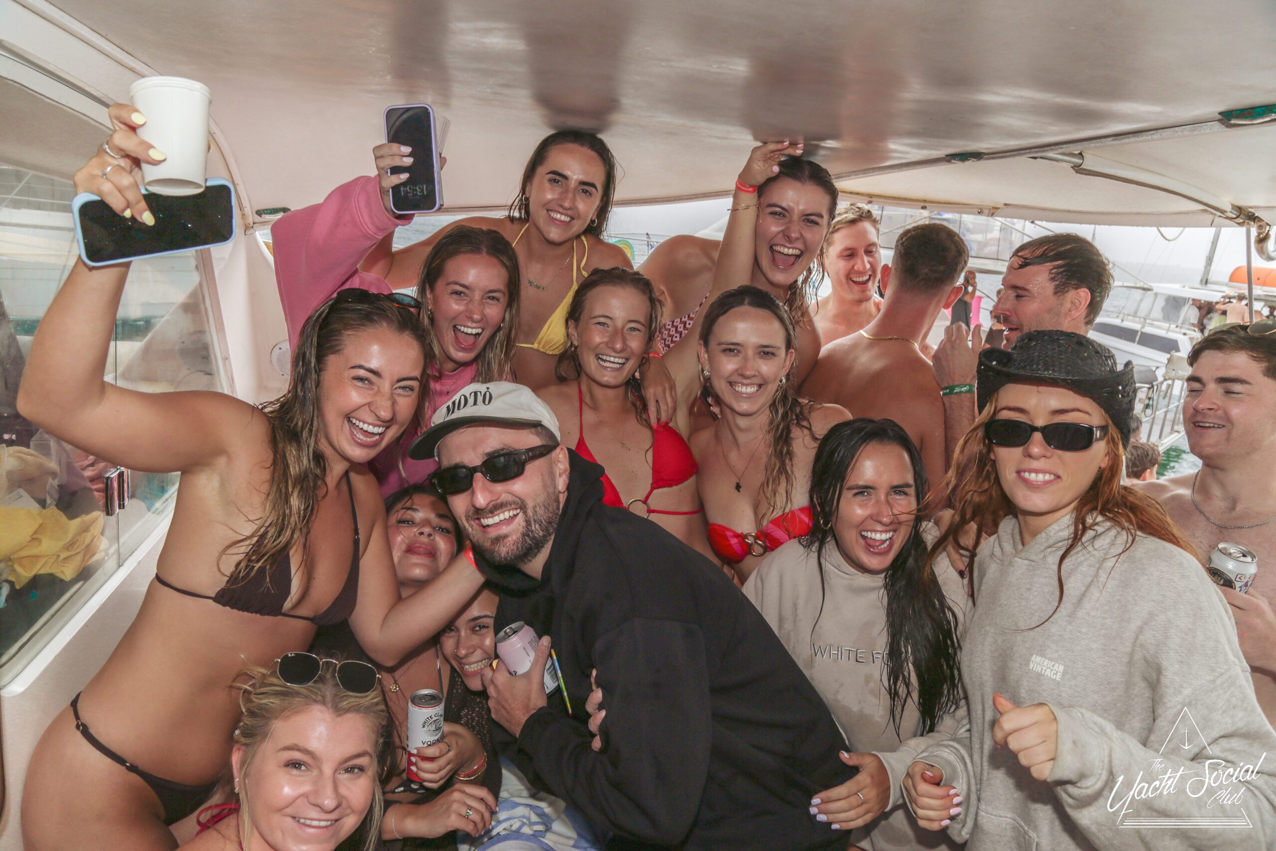 A group of young adults in swimsuits enjoying a party on a boat, with some posing and smiling for the camera. The deck is crowded and the background shows water and distant boats.
