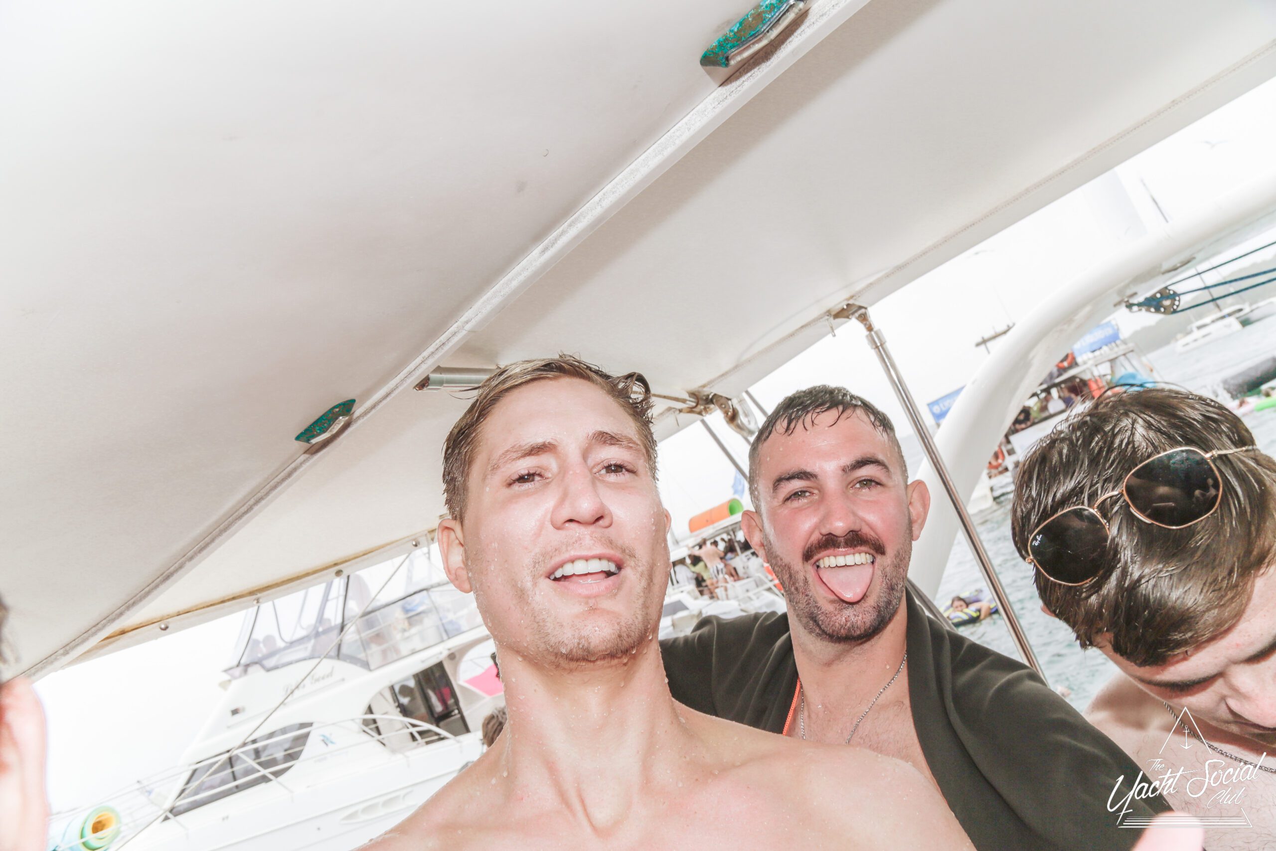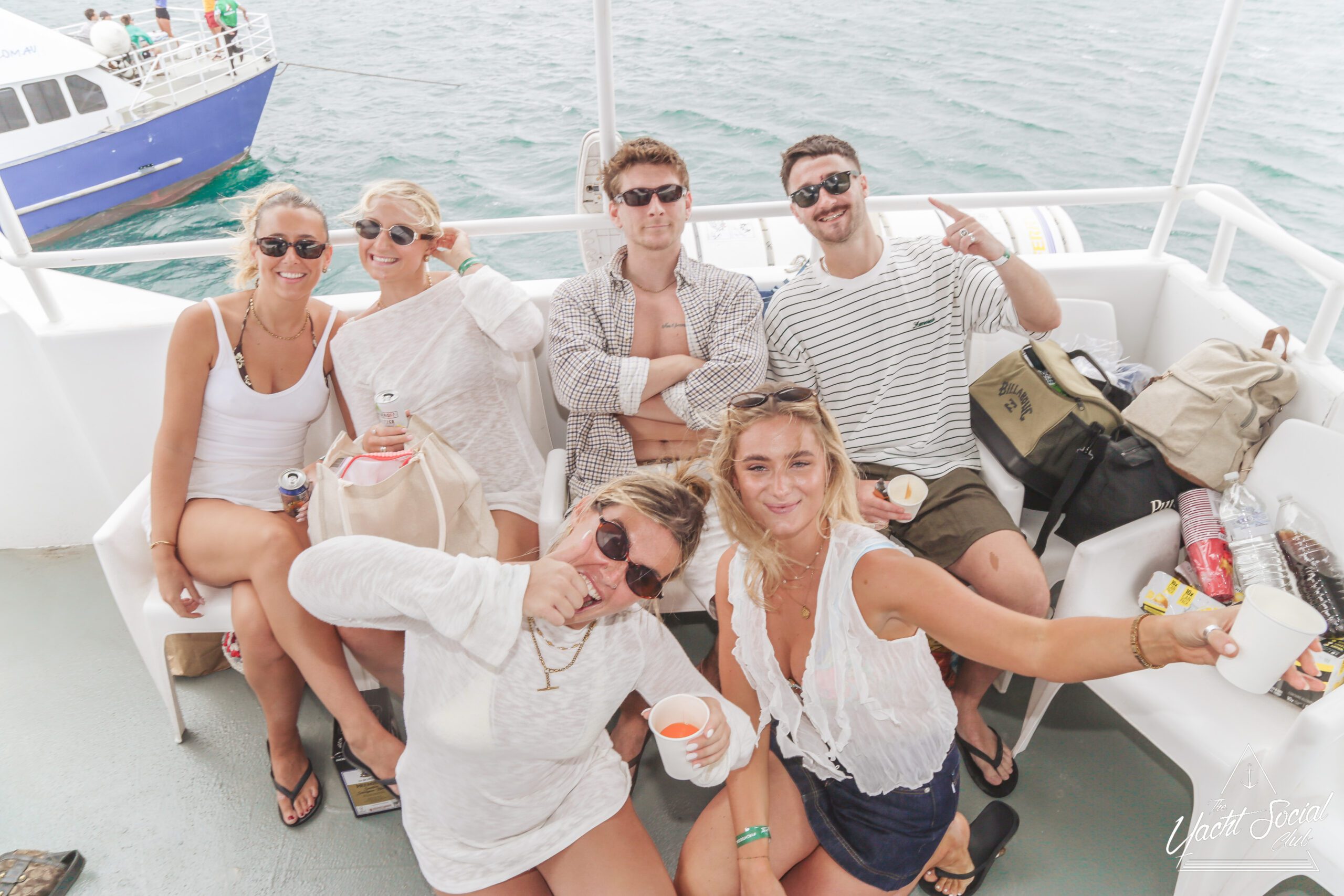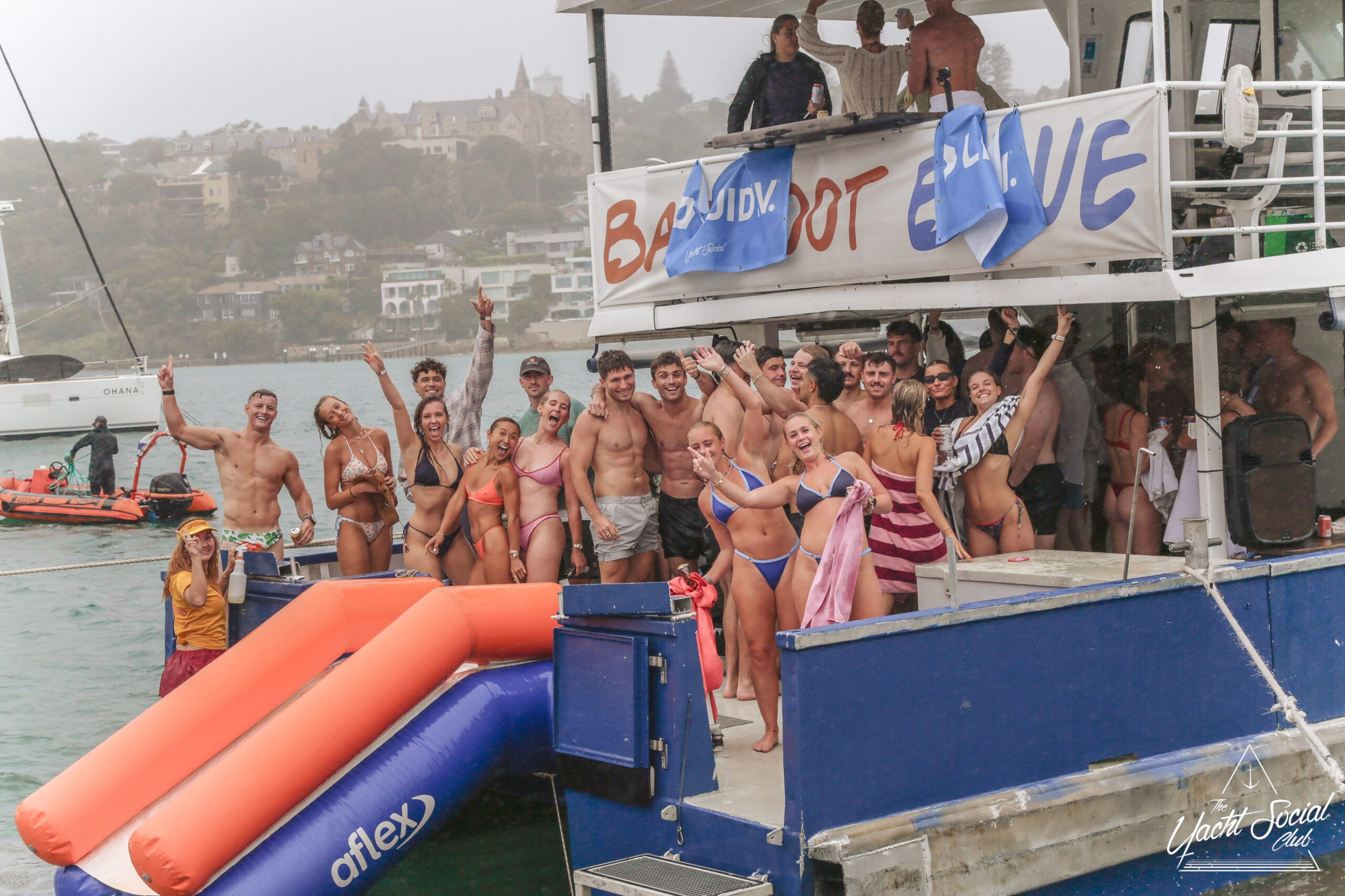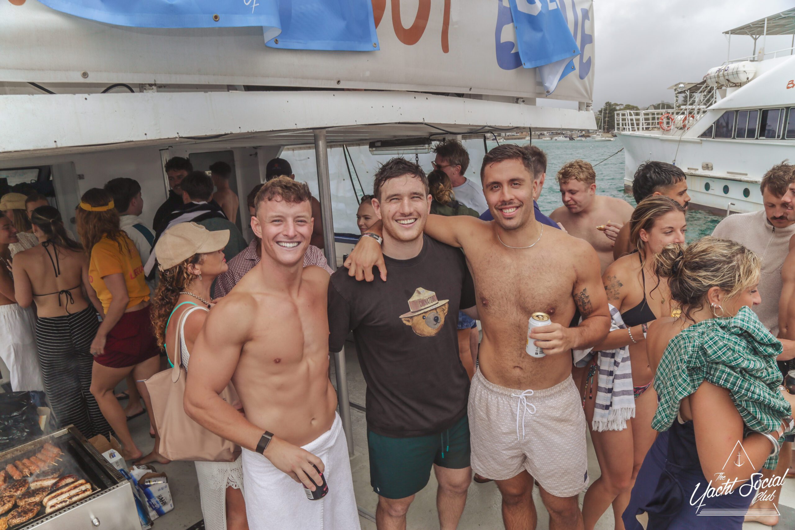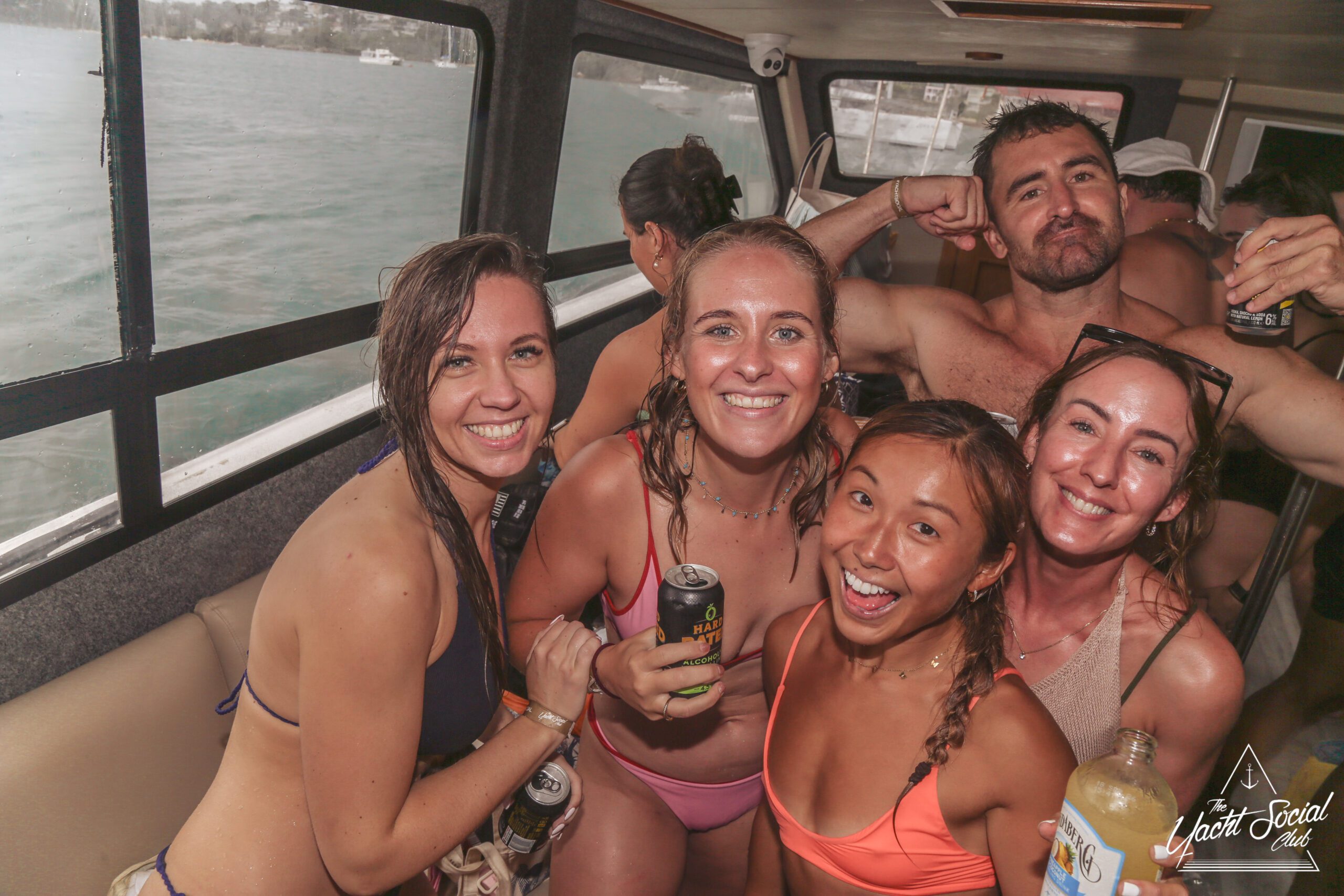 A group of young adults in swimsuits enjoying a party on a boat, with some posing and smiling for the camera. The deck is crowded and the background shows water and distant boats.