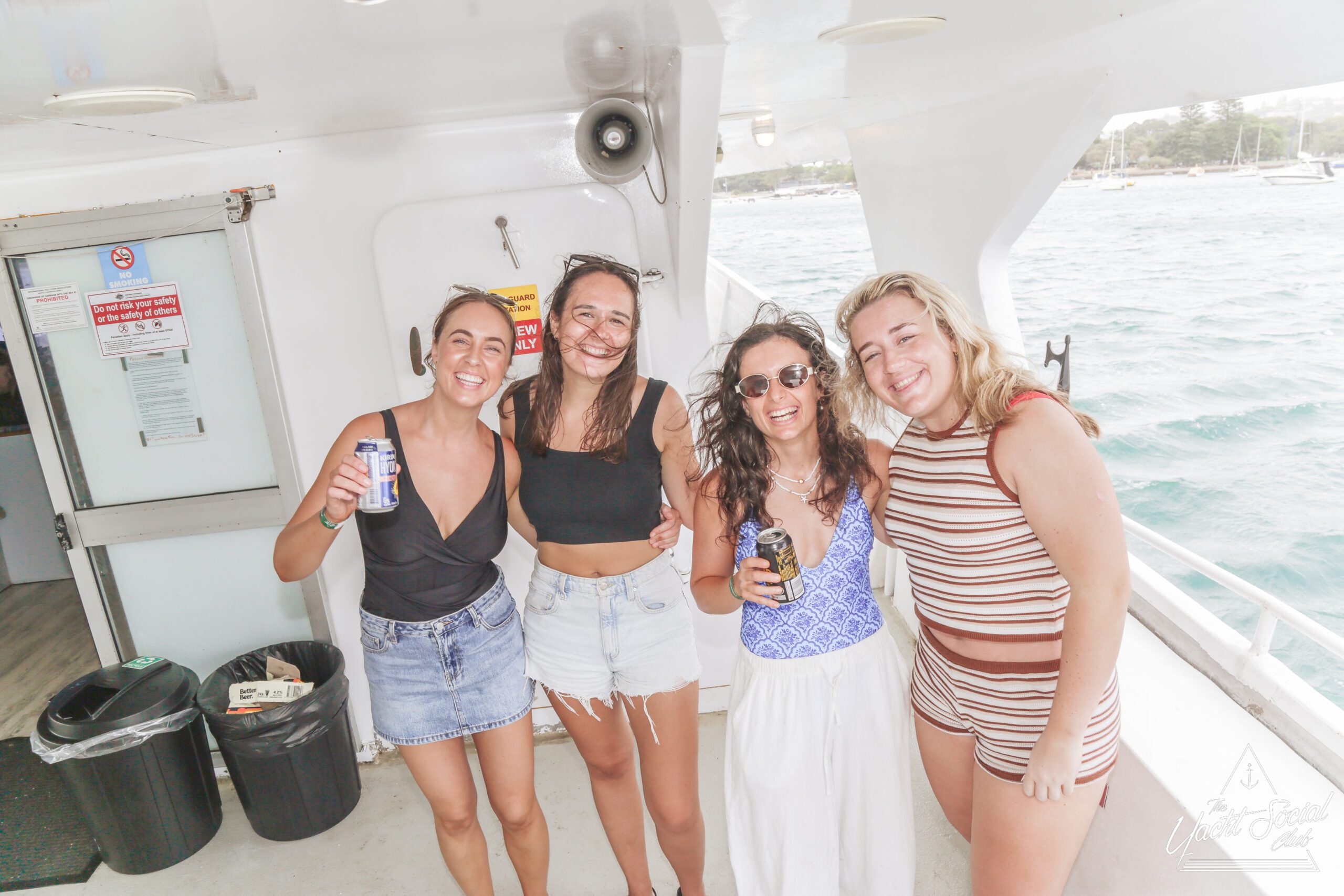 A group of six smiling women pose together on a boat, holding drinks and enjoying a sunny day. Other people are visible in the background, and the sea can be seen beyond the deck.