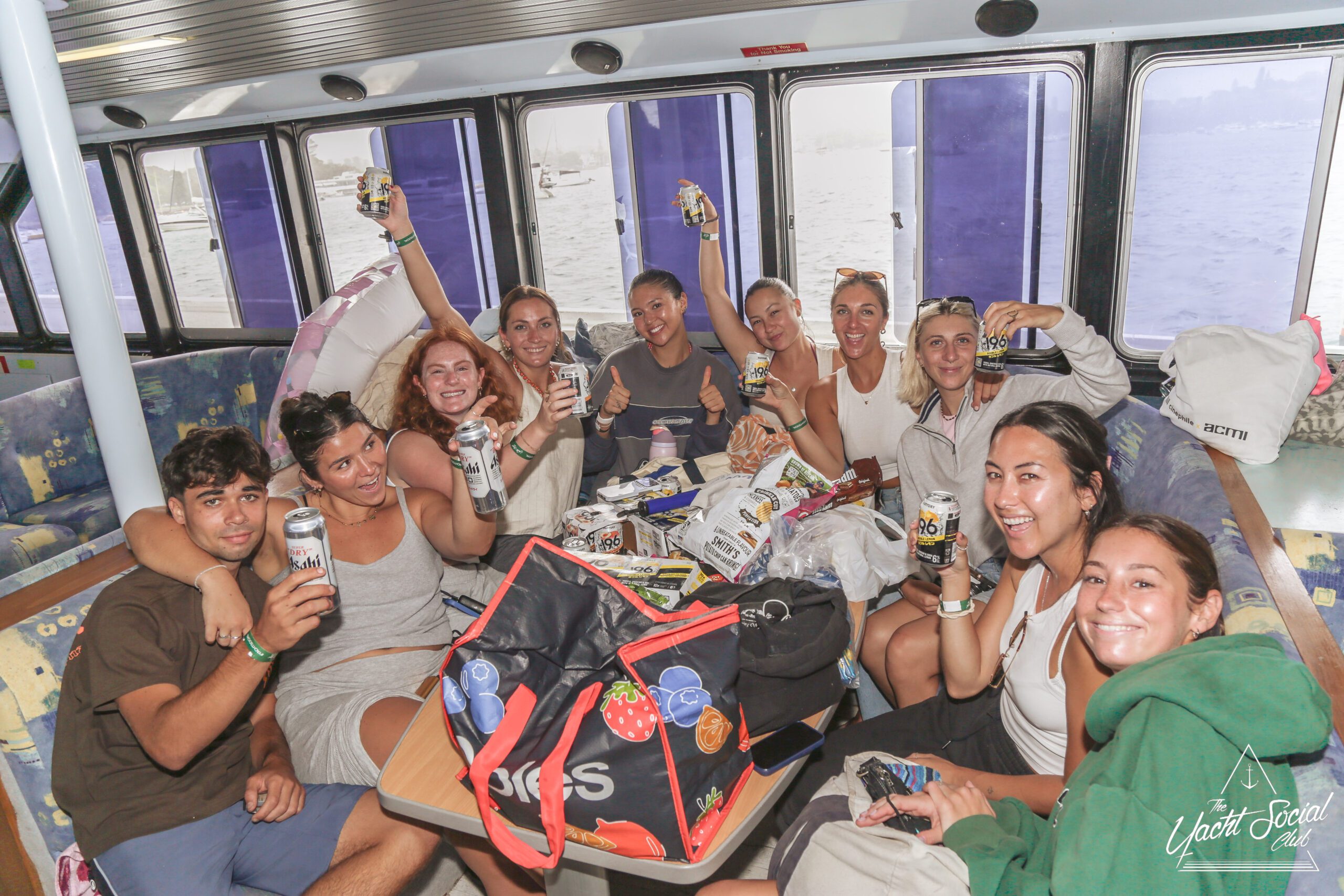 A group of young adults smiling and holding drinks on a boat. One woman in the center raises her arm with a peace sign, looking excited. The atmosphere is lively and festive.
