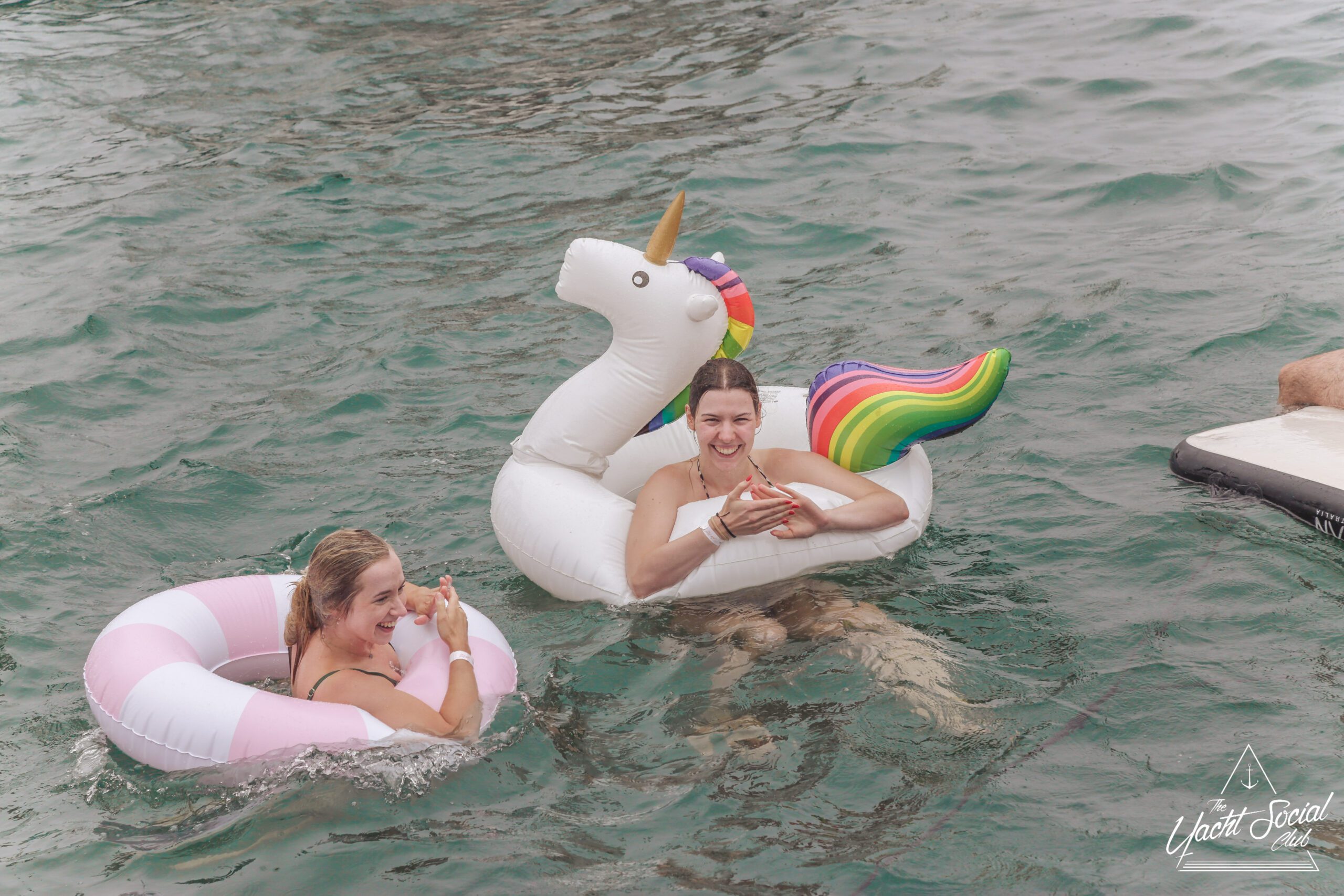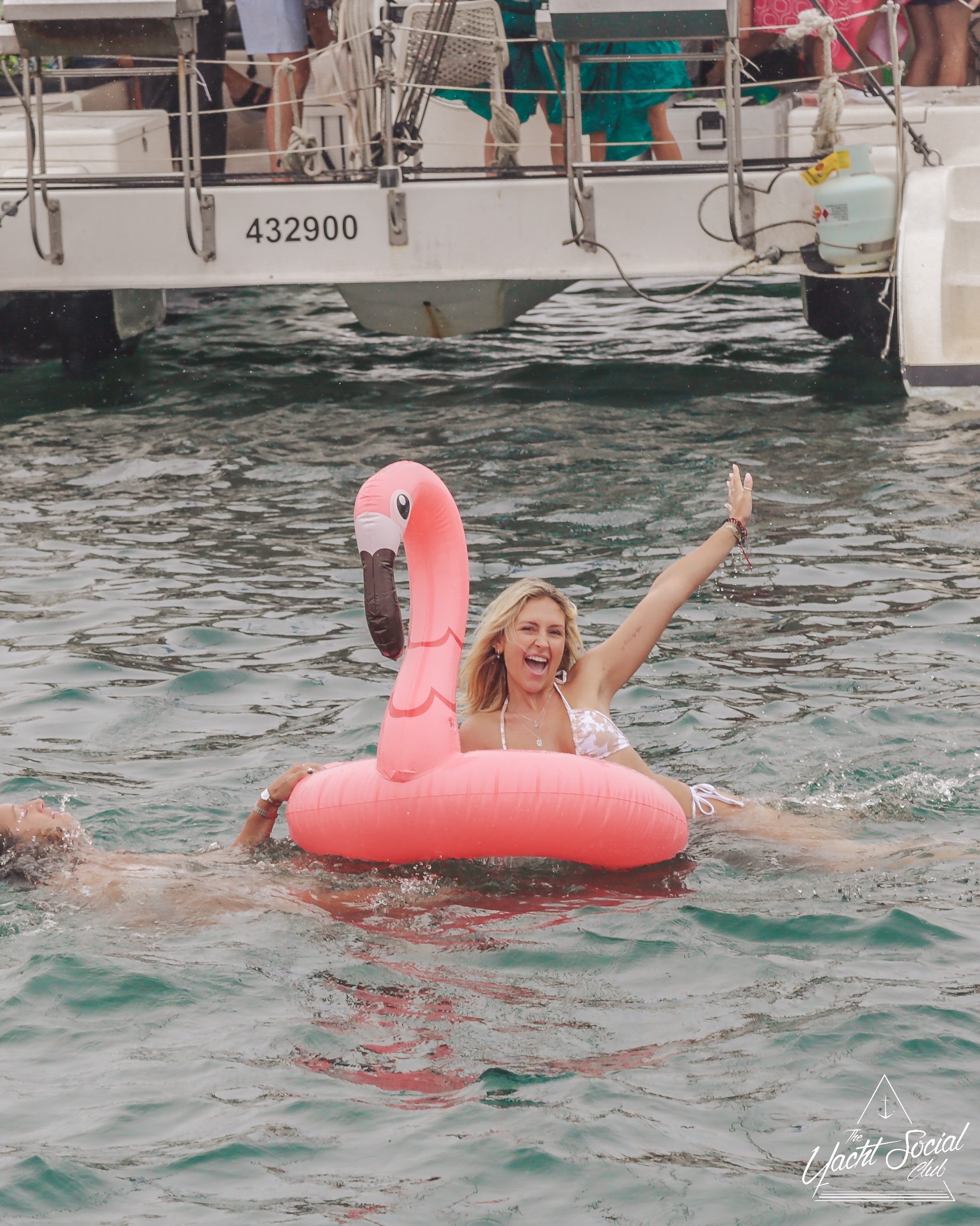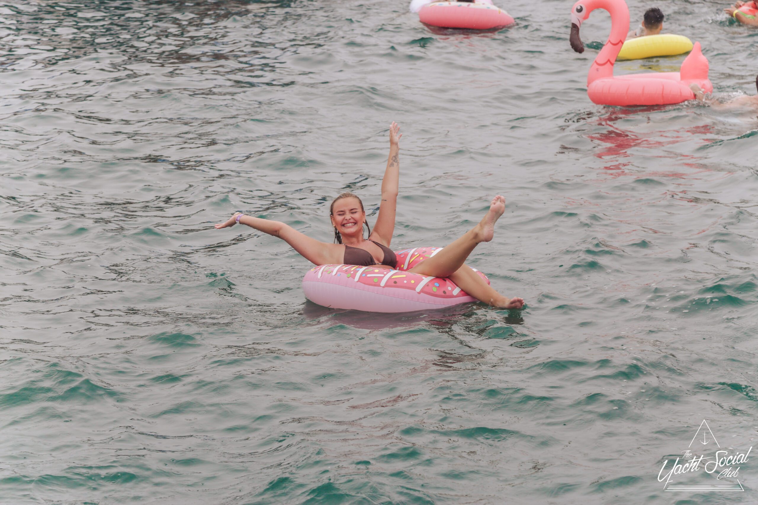 A group of people in swimsuits float on inflatable pool toys in the water near several yachts. A smiling woman on a popsicle-shaped float is in the foreground. The sky is overcast. "Yacht Social Club" logo is in the bottom right corner.