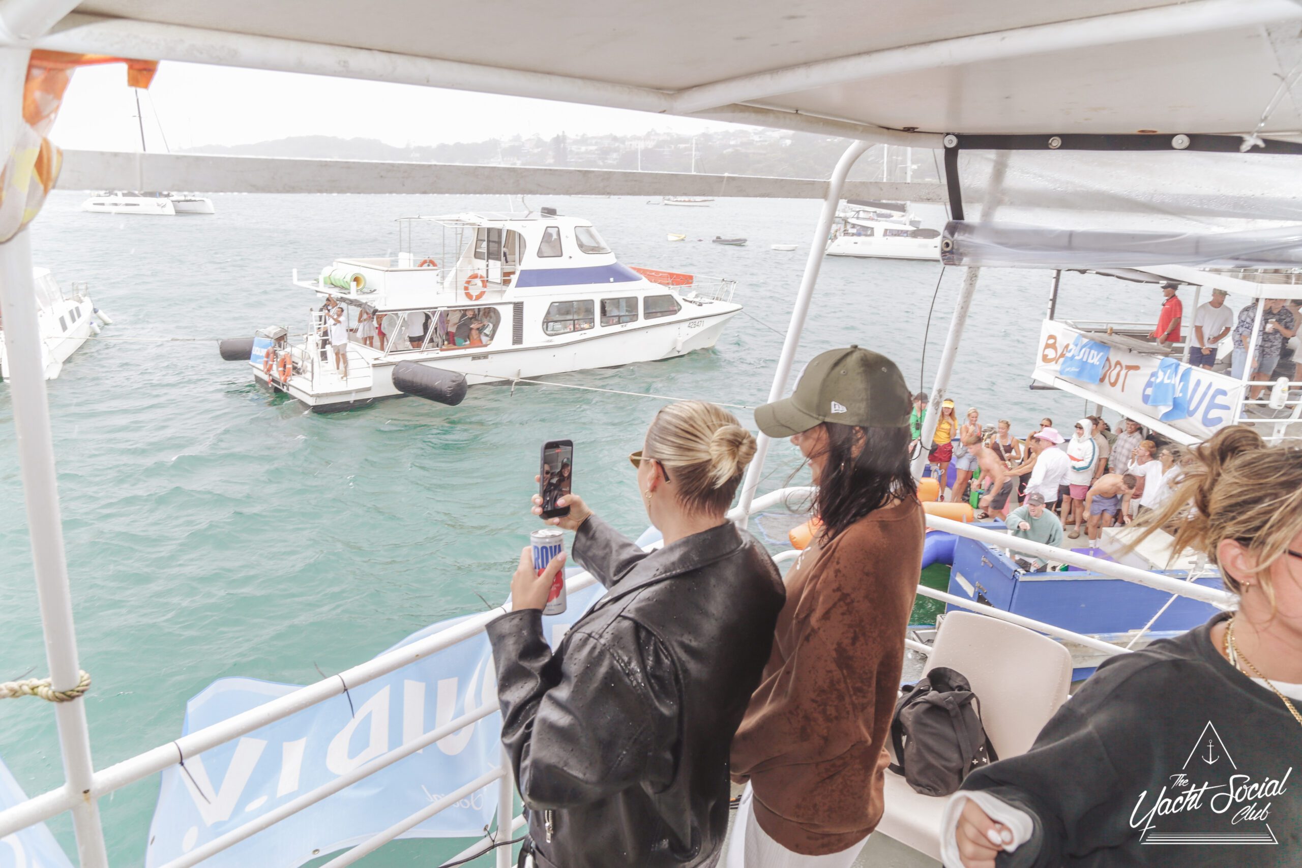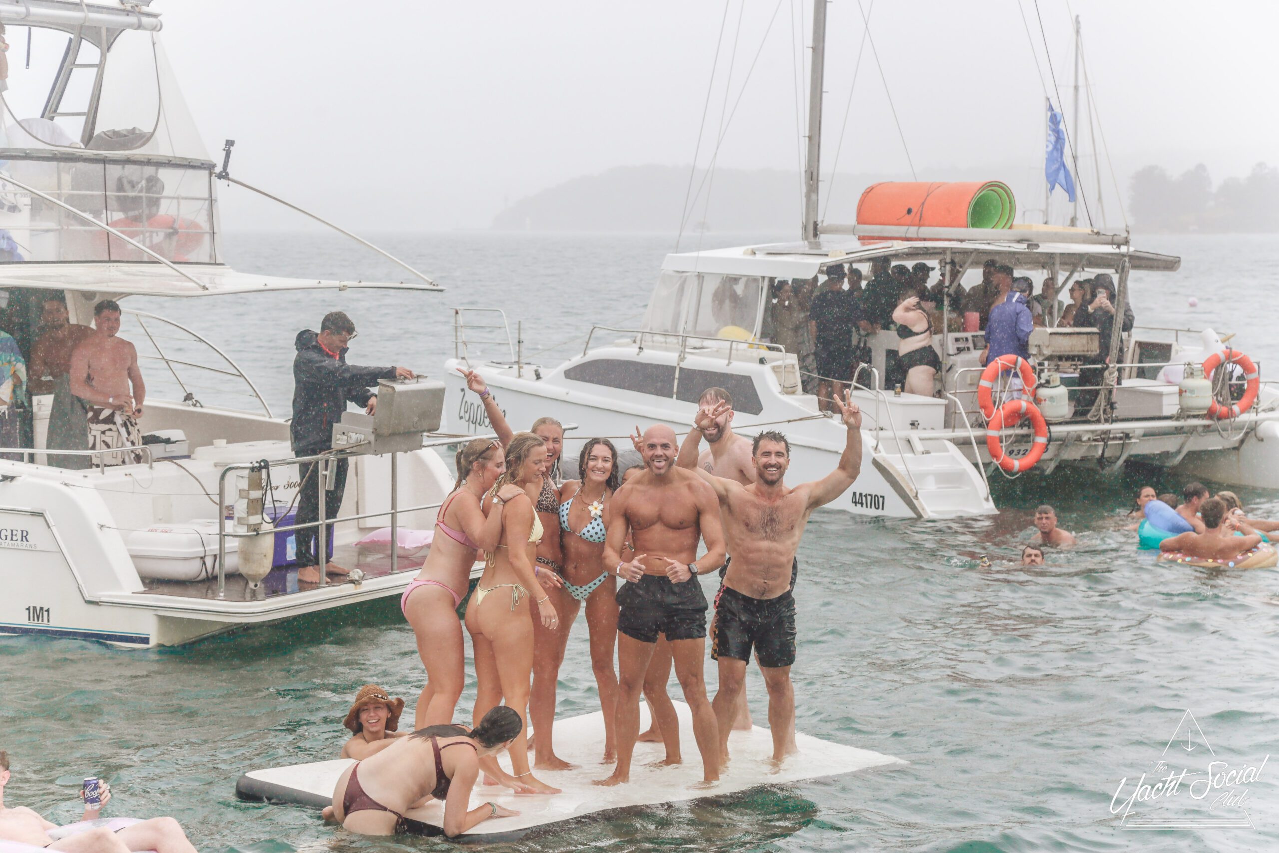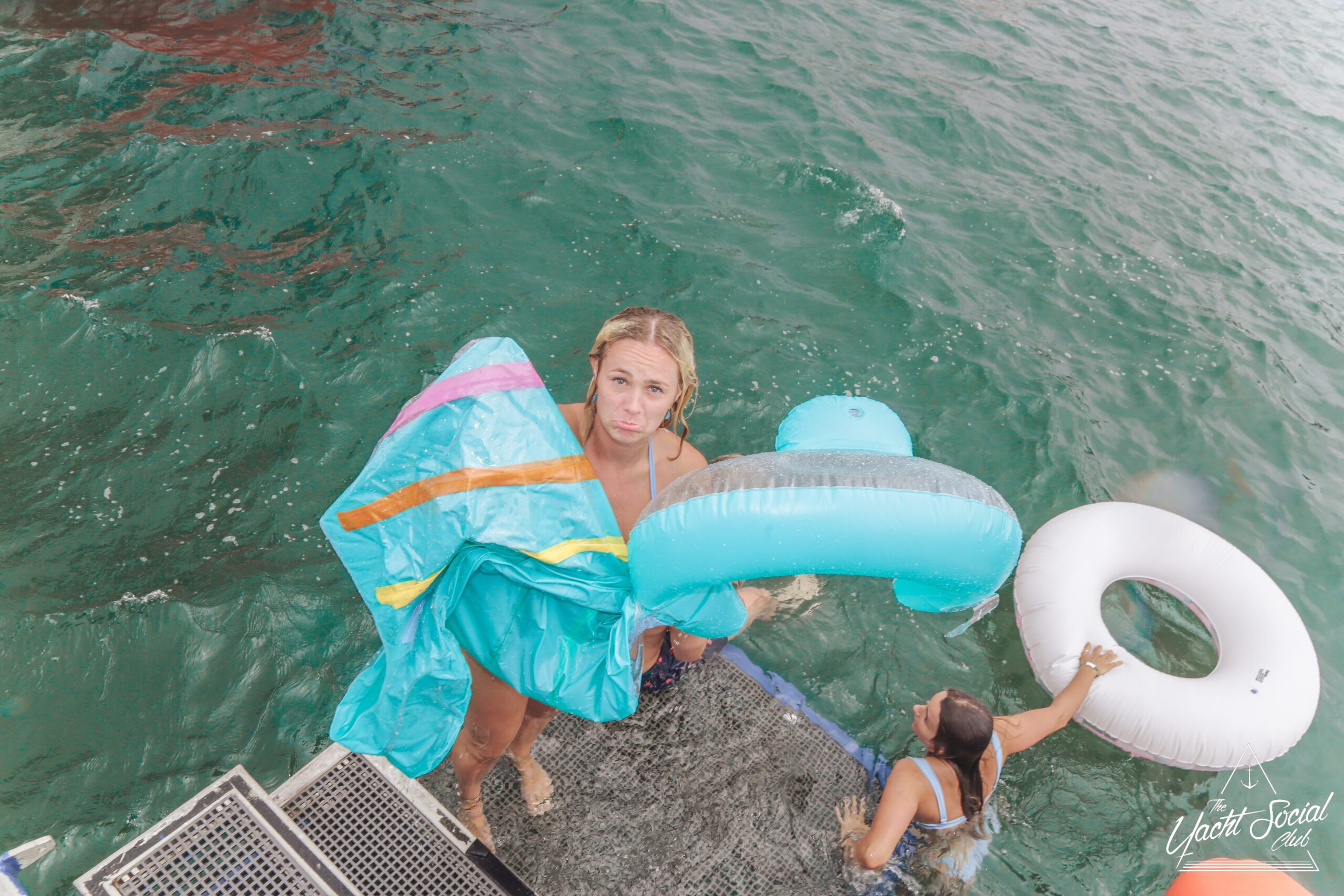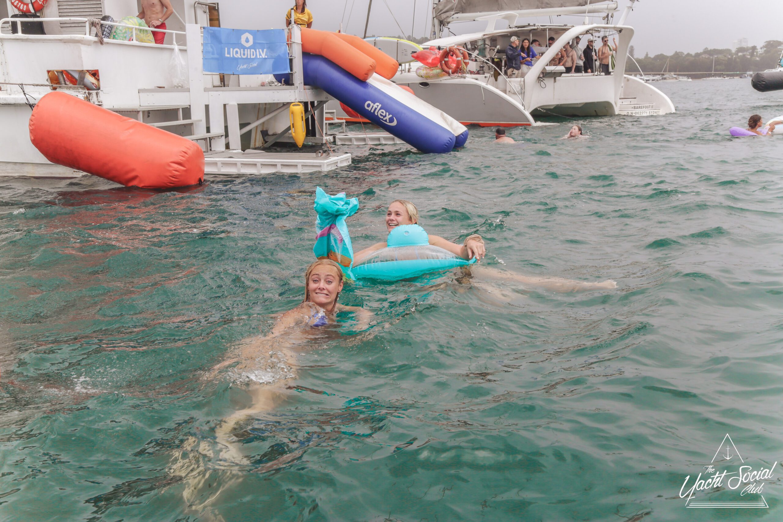 A group of people in swimsuits float on inflatable pool toys in the water near several yachts. A smiling woman on a popsicle-shaped float is in the foreground. The sky is overcast. "Yacht Social Club" logo is in the bottom right corner.