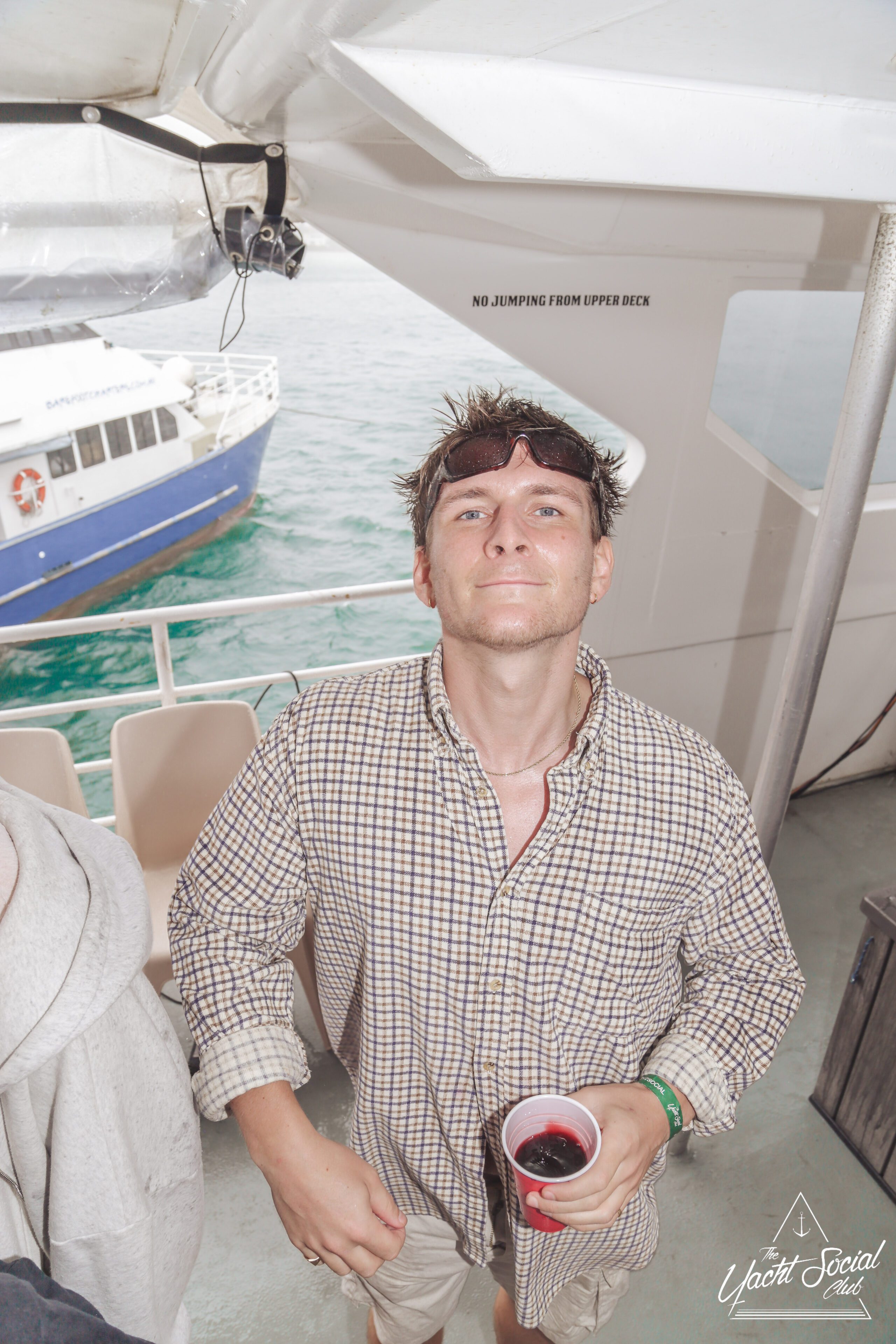 A man in a plaid shirt stands on a boat holding a red cup, looking up at the camera. Another person is partially visible to his left. A blue and white boat is seen in the water outside. A sign reads "NO JUMPING FROM UPPER DECK.