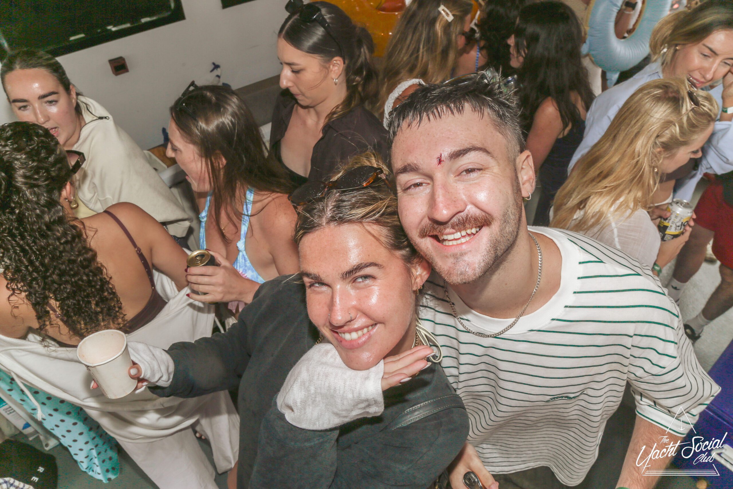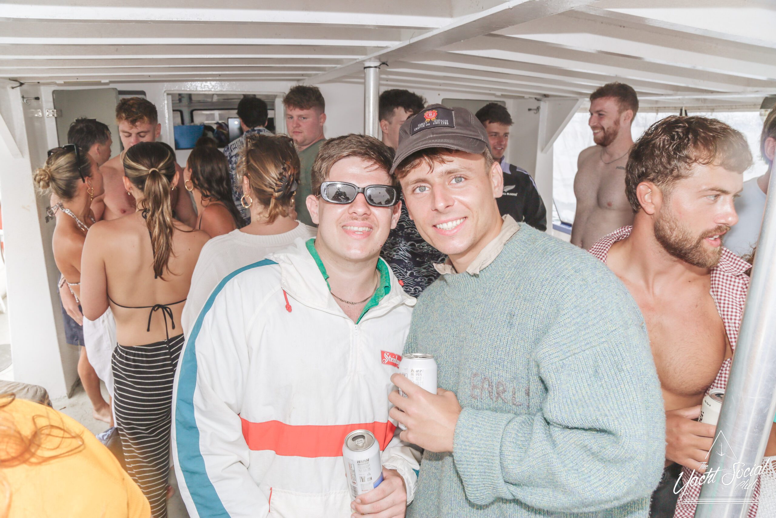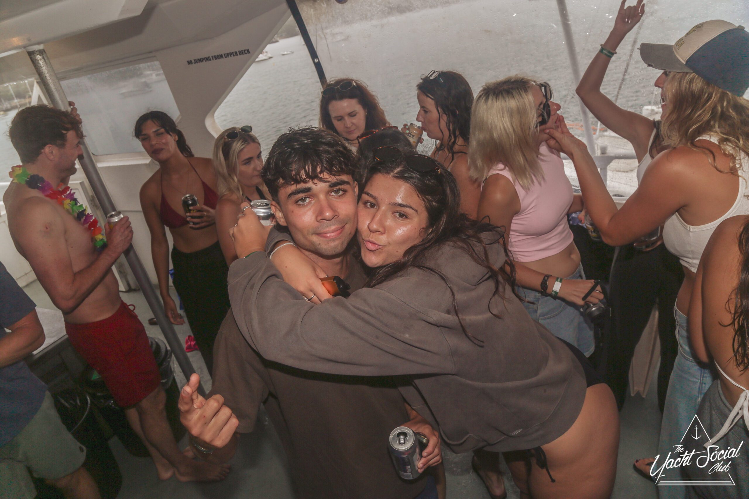 A group of young adults are partying on a boat. Two people in the foreground hug and pose for the camera, both holding drinks, while others socialize and dance in the background. Water is visible outside the boat windows.