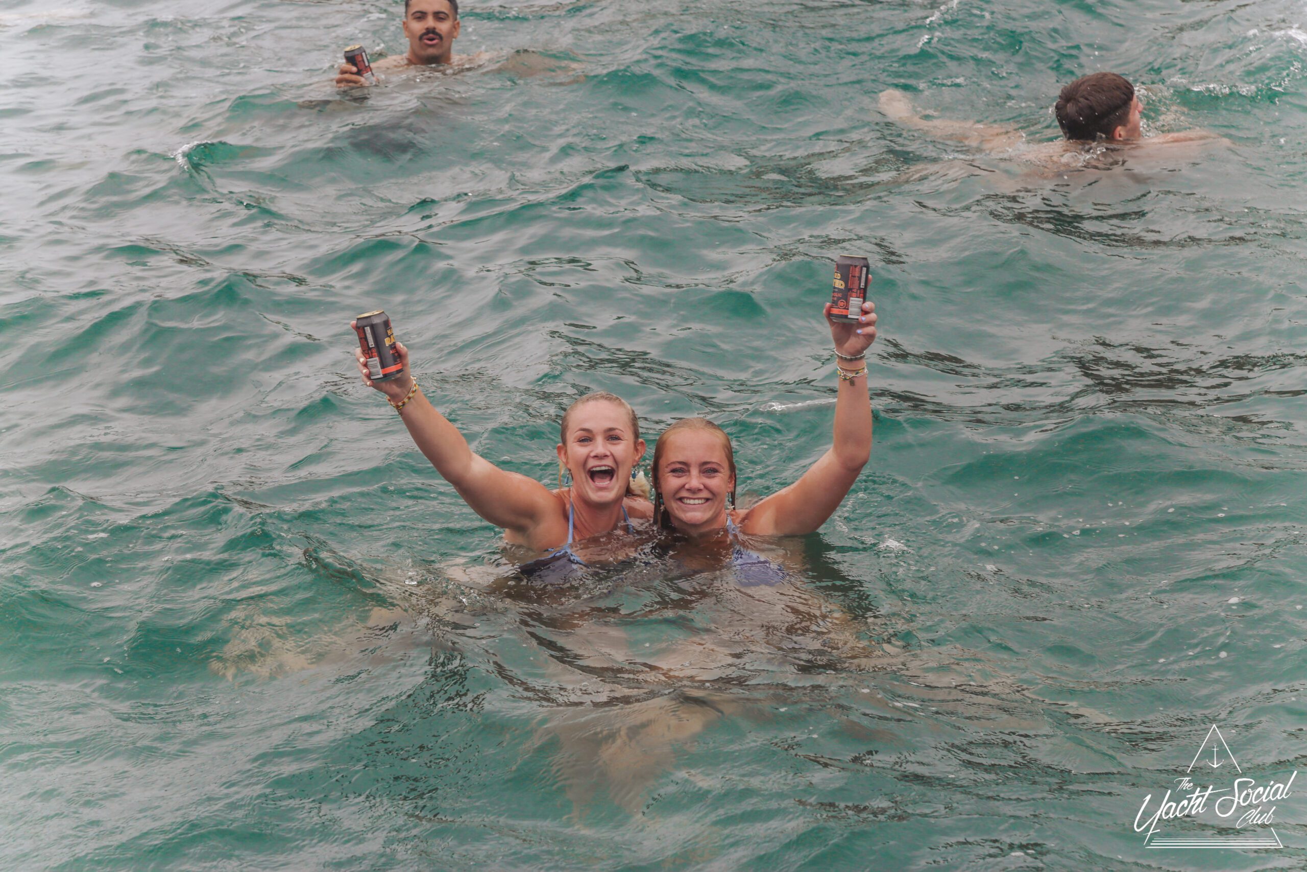 Two women in bikinis smile and hold canned drinks on a boat, appearing happy and wet as if they’ve been swimming. Other people are seen in the background near a staircase. The scene is bright and festive.
