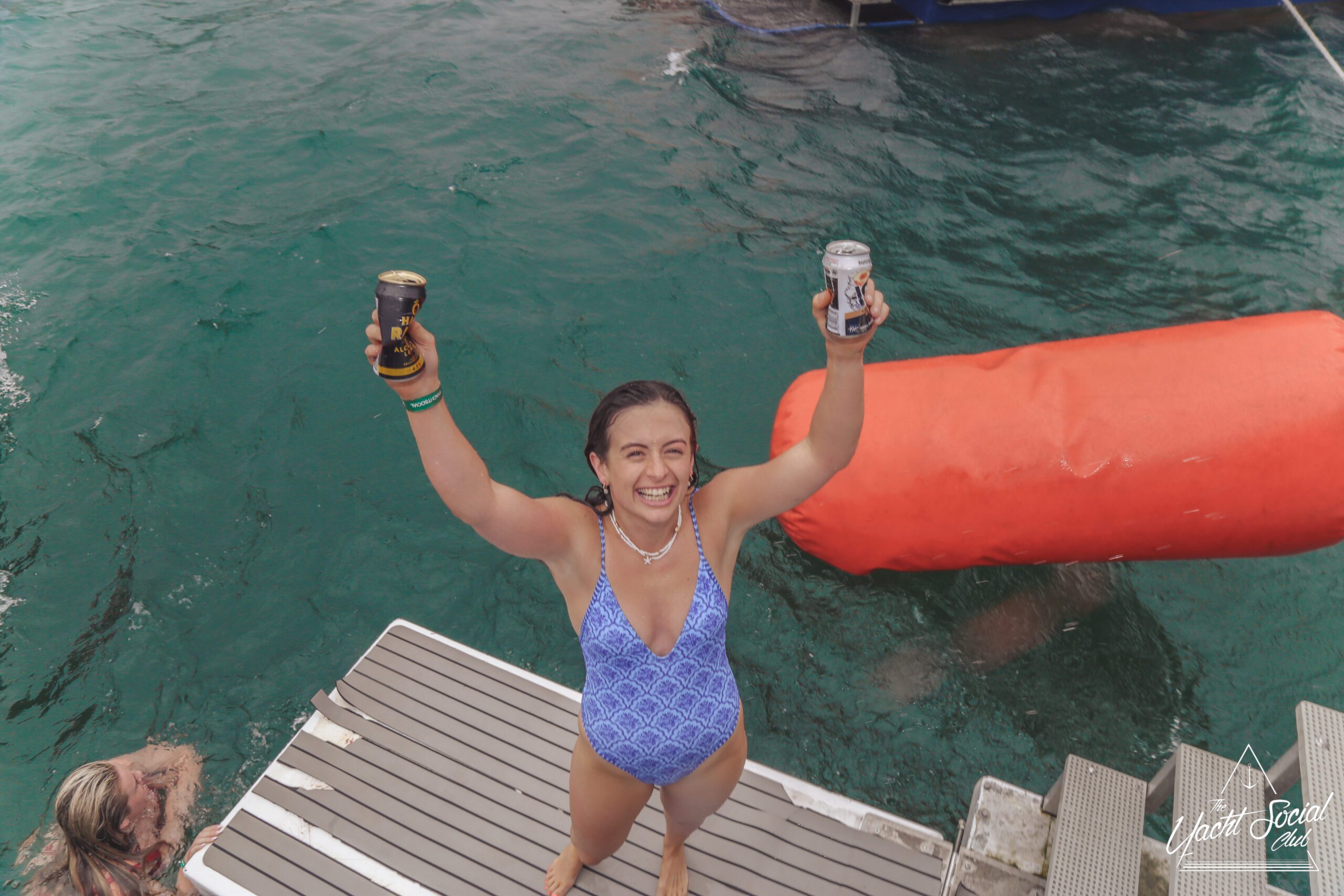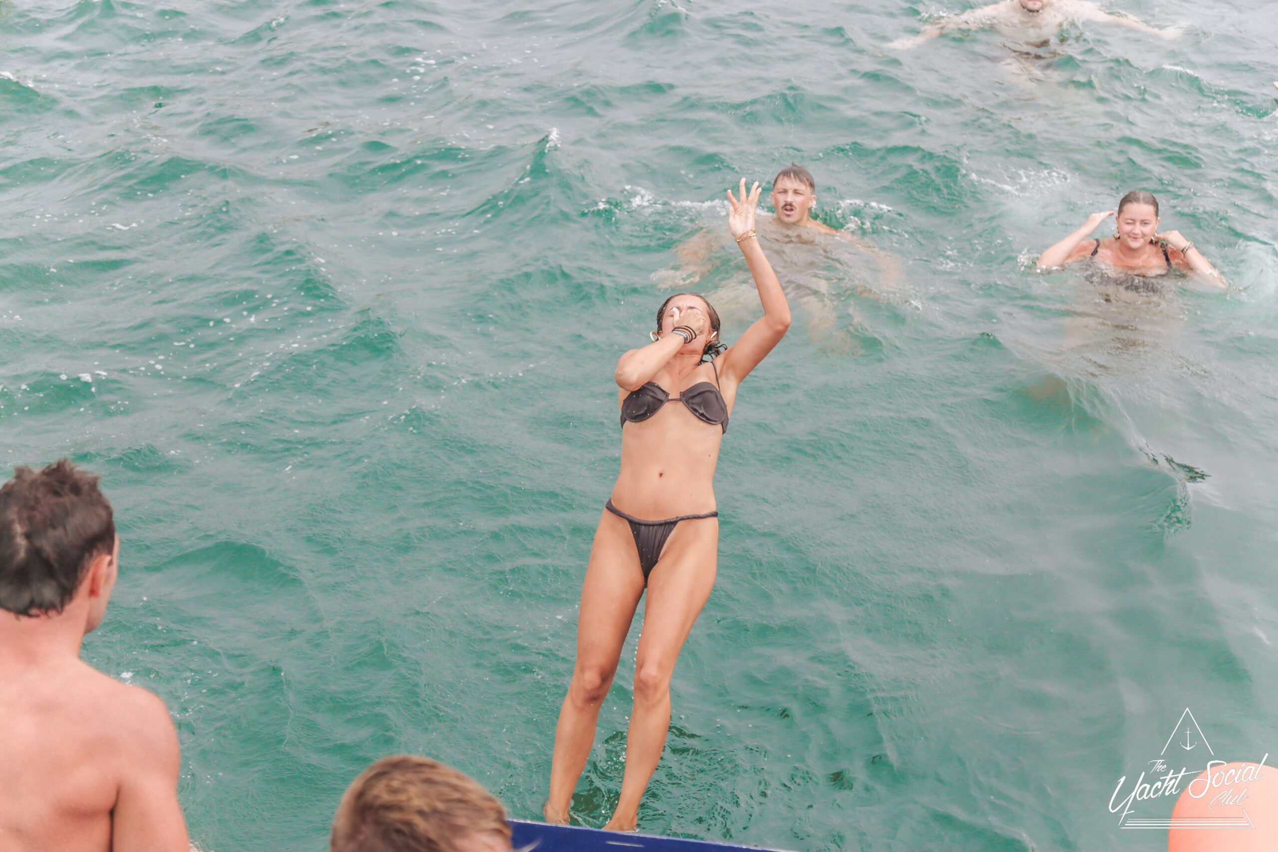 A smiling woman in a floral bikini poses with arms raised on a dock by the water, surrounded by people swimming and boats in the background at a lively boat party.