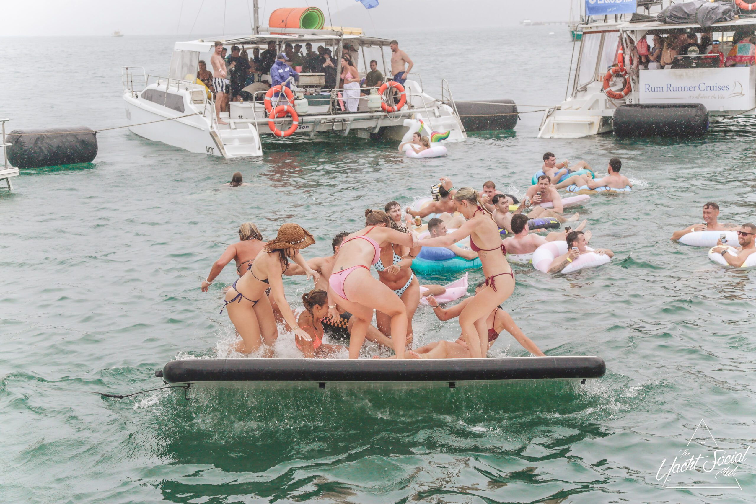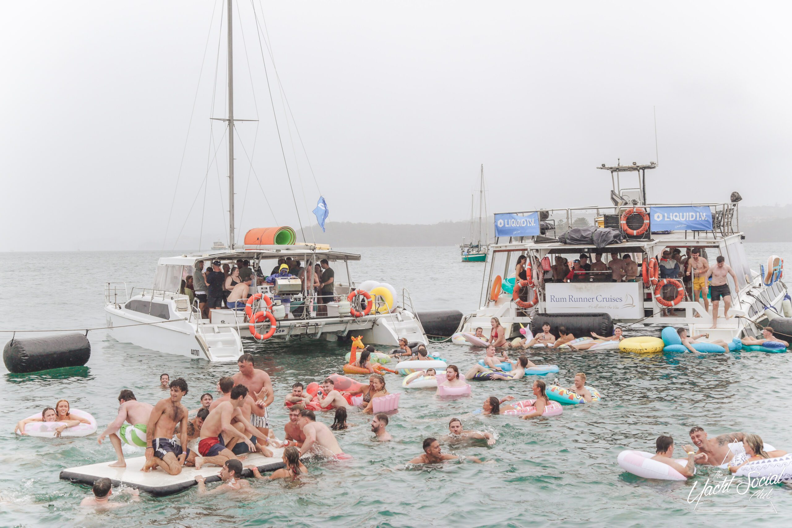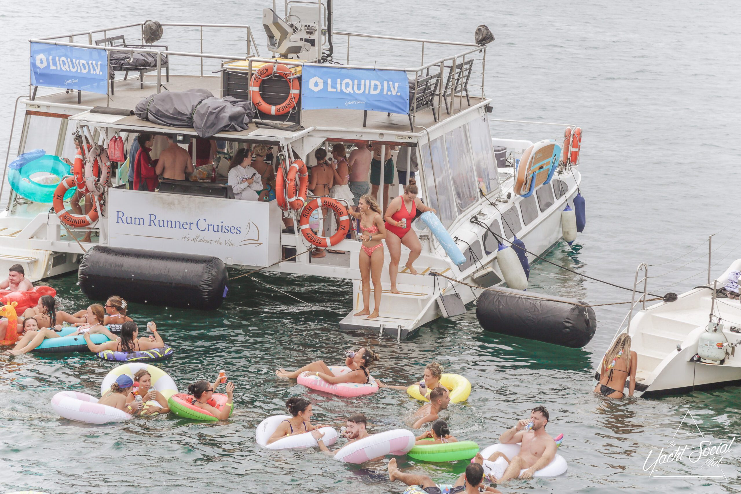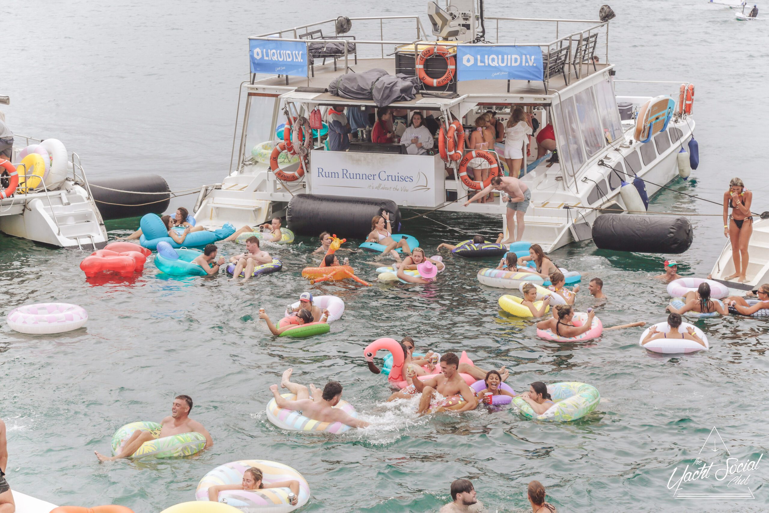 People relaxing on colorful pool floats in the water near two boats. Some people are on the boats, and a "Rum Runner Cruises" sign is visible. The scene is lively and festive, with everyone enjoying the water.