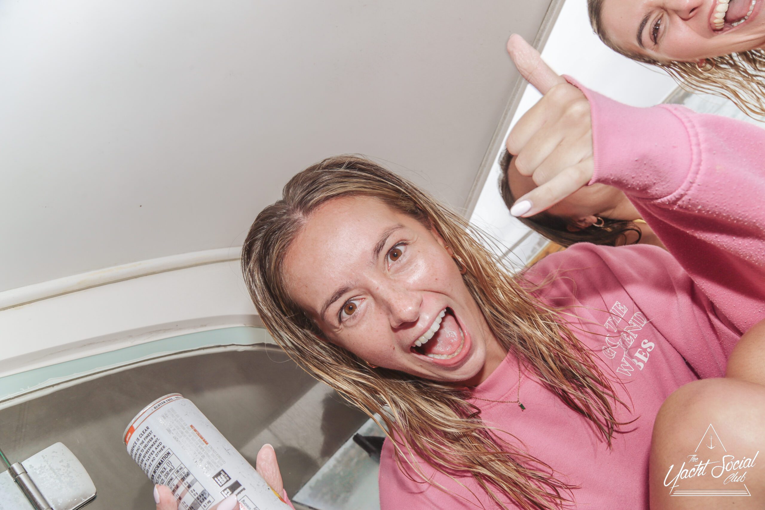 A group of women in swimsuits dance and raise drinks on a boat, with one woman in the center holding her phone and arm up, smiling enthusiastically. Sunlight shines on them and yacht equipment is visible in the background.