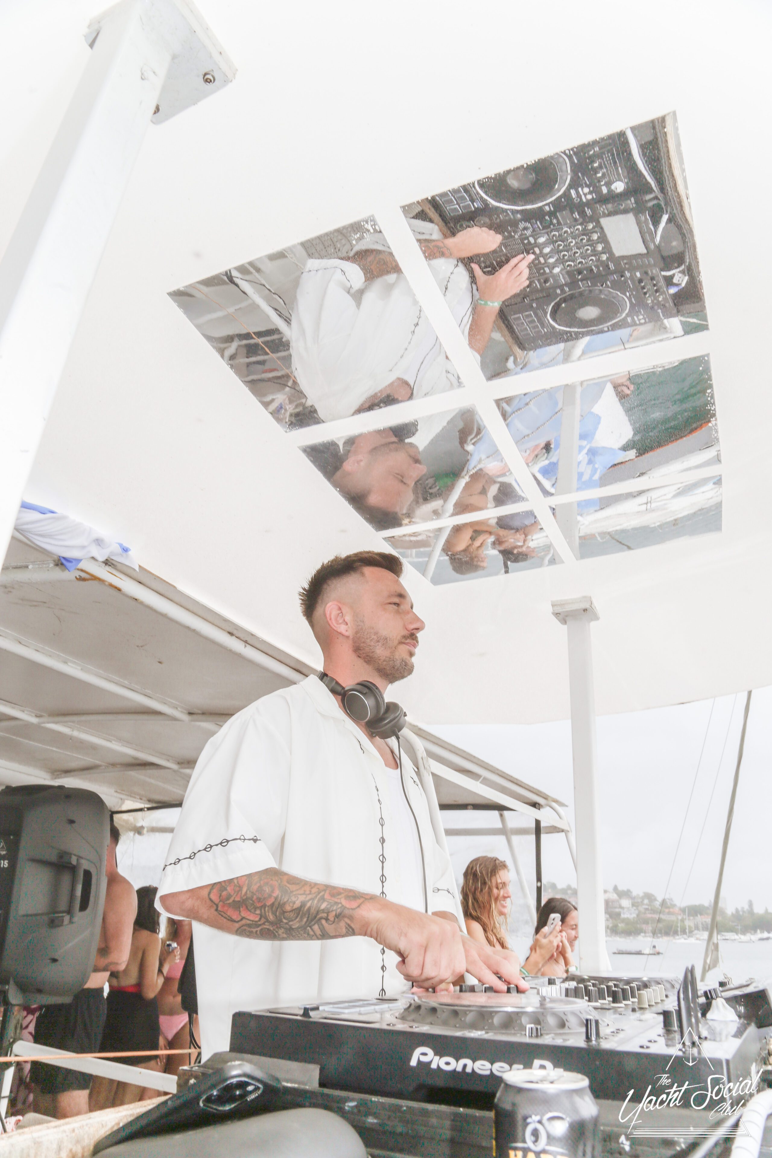 A DJ wearing headphones and a white shirt plays music at an outdoor event on a boat, with a mirrored ceiling reflecting him and his DJ equipment. People and waterfront scenery are visible in the background.